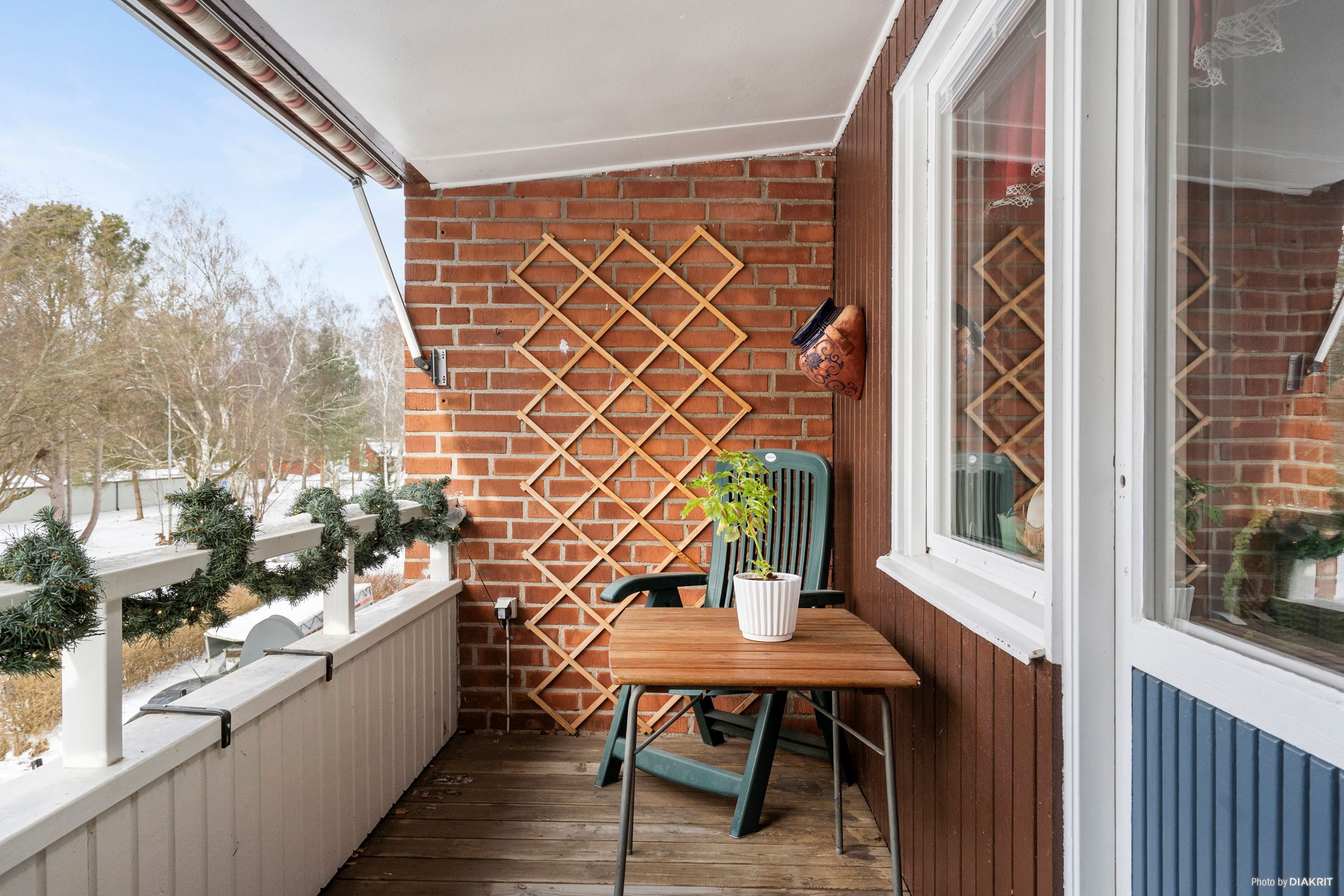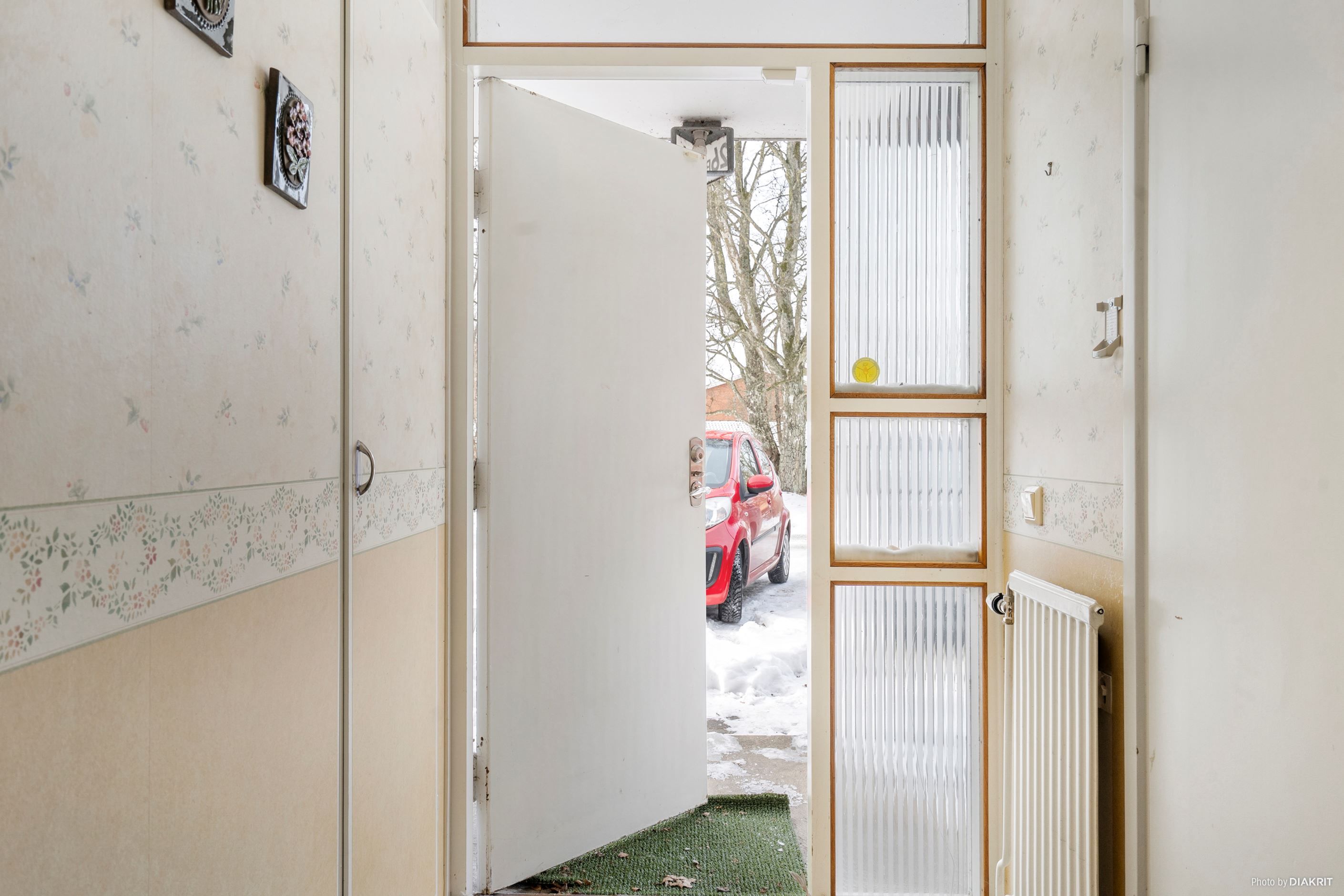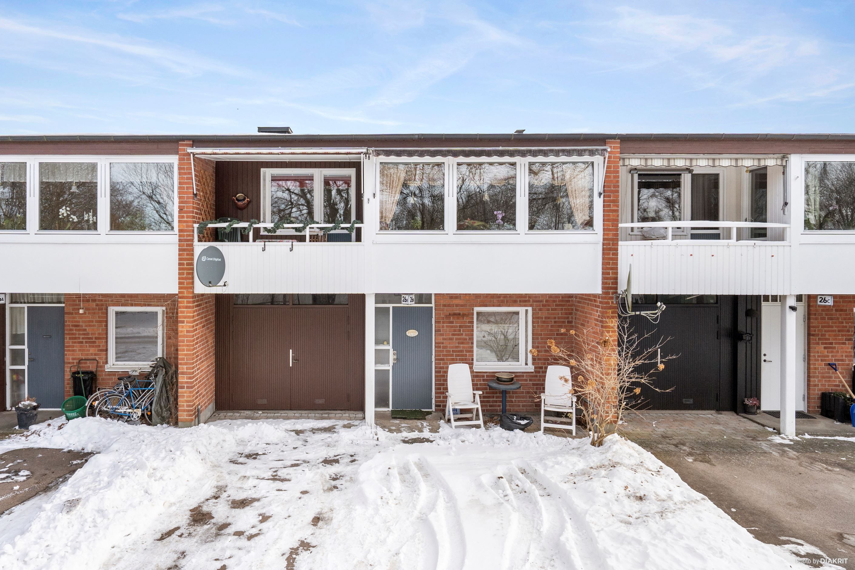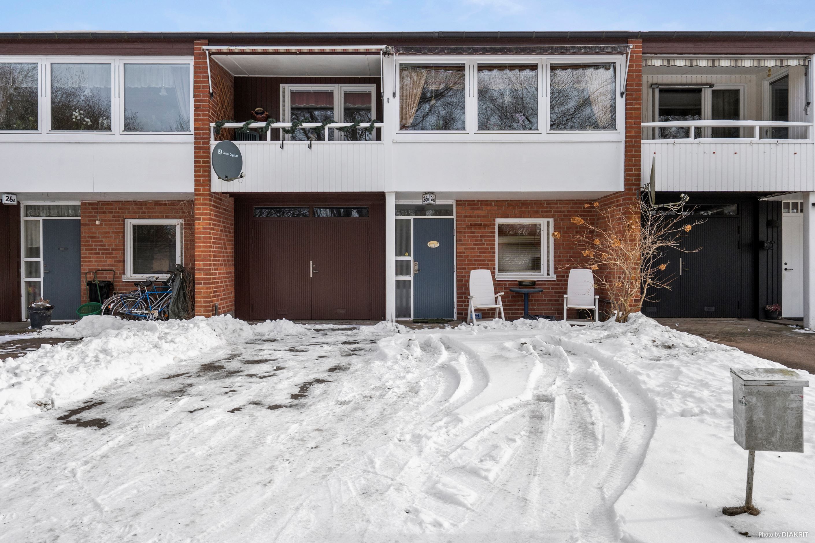 Trädgård på fram och baksida. Entré via parkeringsplatsen eller via uterummet.