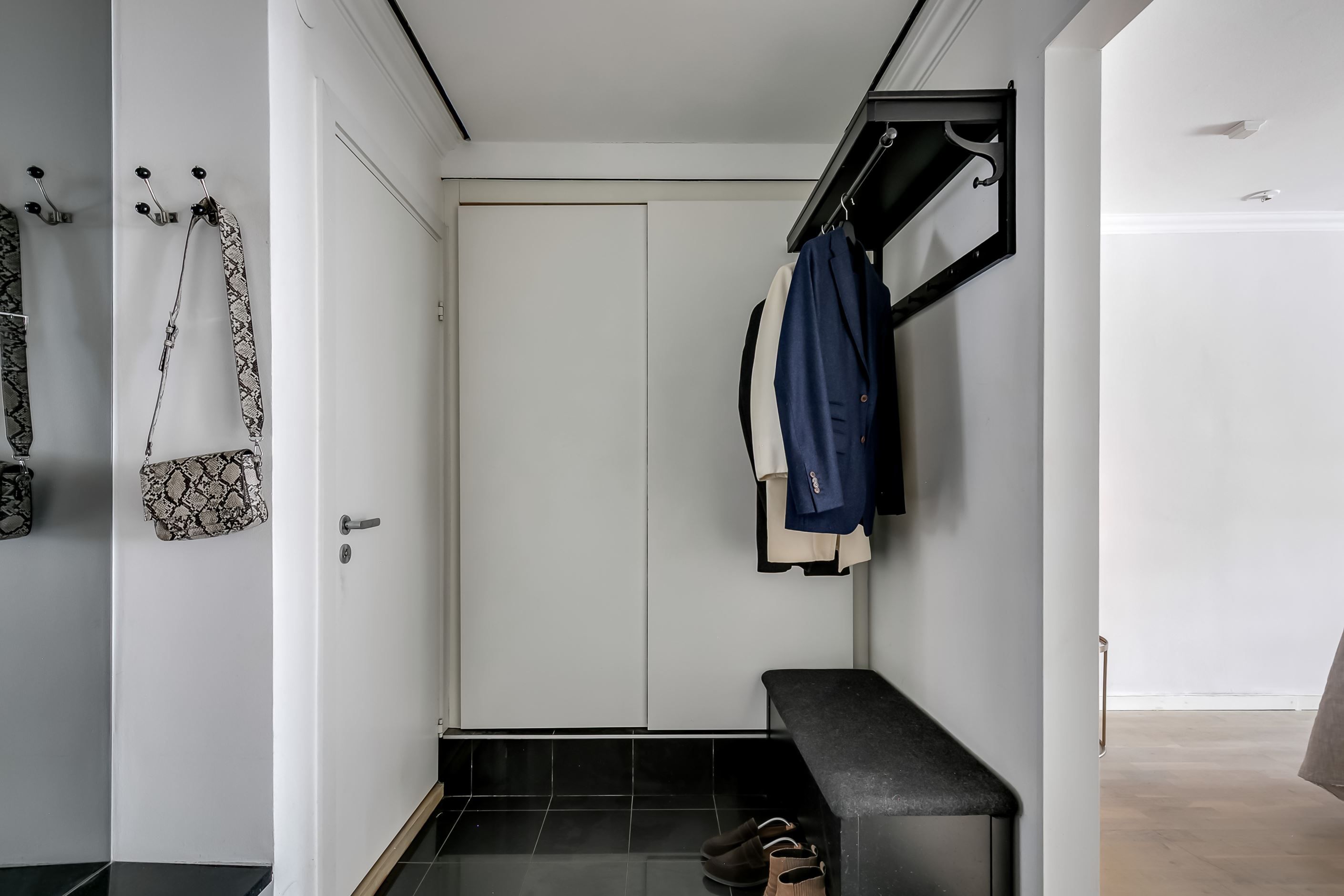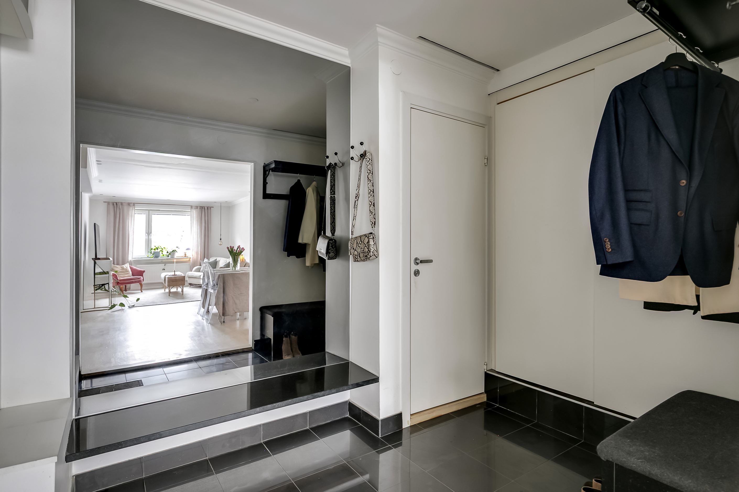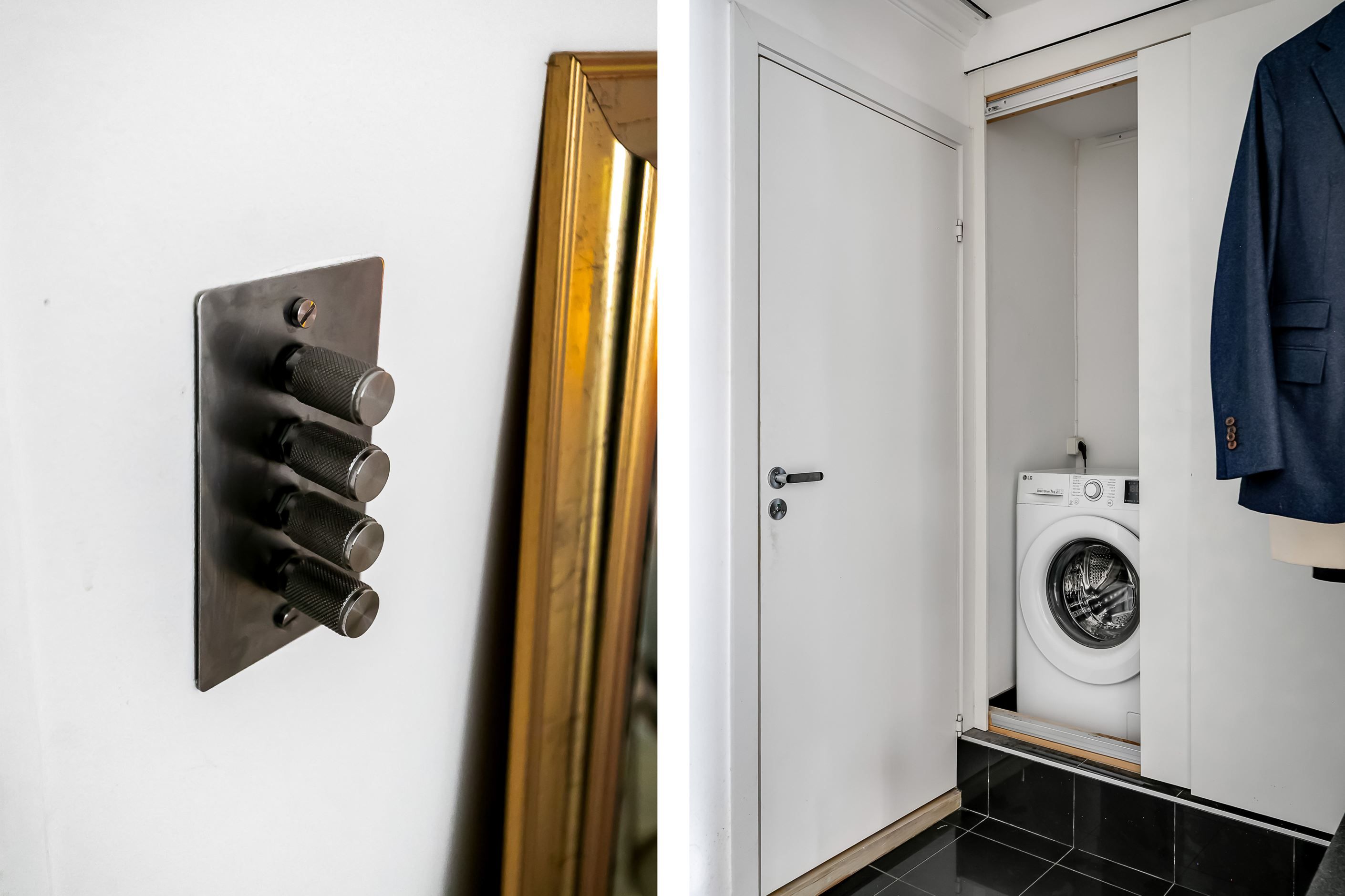 Det rymliga sovrummet erbjuder gott om plats för dubbelsäng och kompletterande möblemang, samtidigt som den generösa klädkammaren ger utmärkta förvaringsmöjligheter. För extra bekvämlighet finns tvättmaskin smart placerad utanför badrummet bakom stilrena skjutdörrar – en praktisk lösning som förenklar vardagen. Badrummet är helkaklat i tidlösa materialval med vitt kakel och elegant svart klinkergolv, vilket skapar en modern och fräsch känsla.