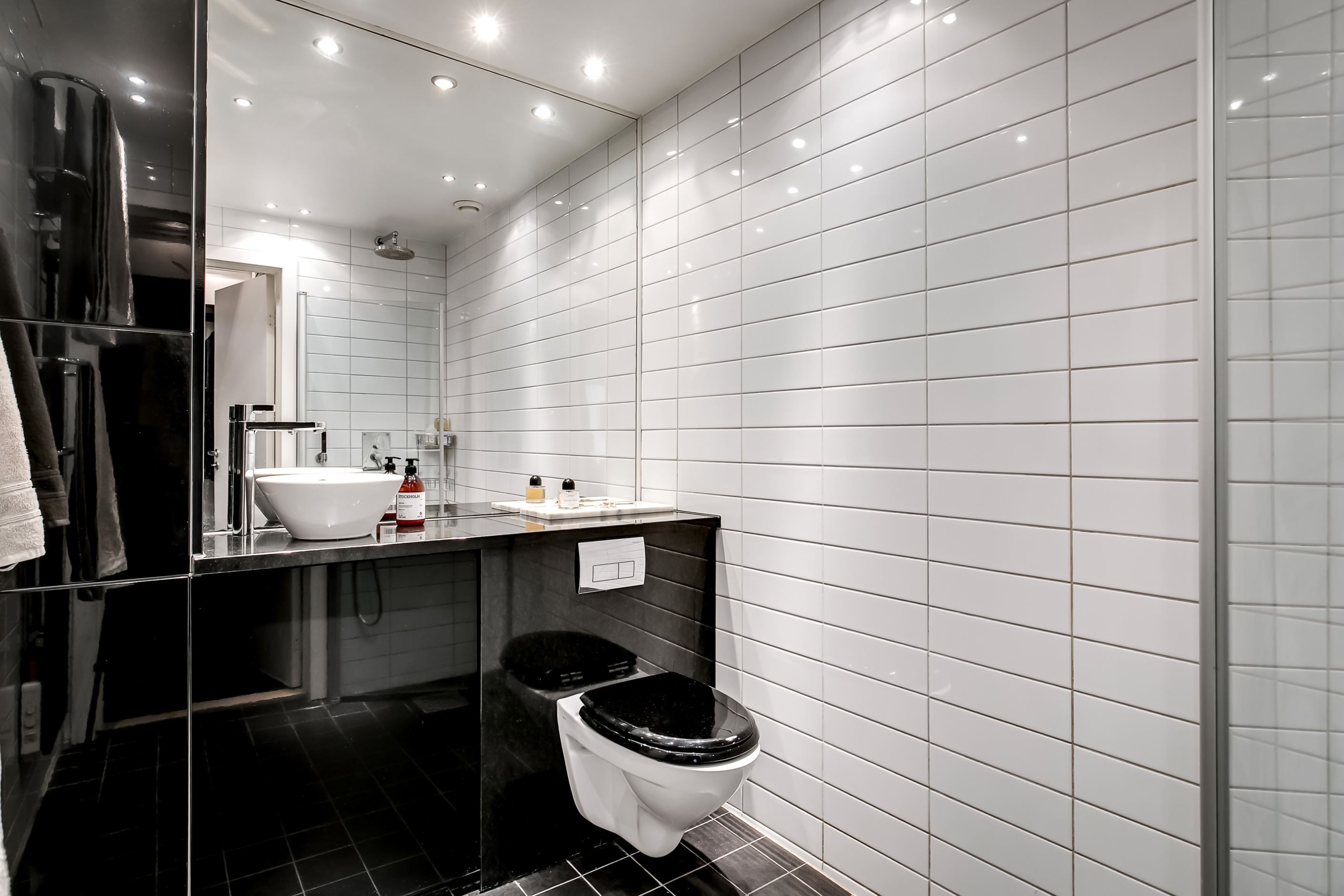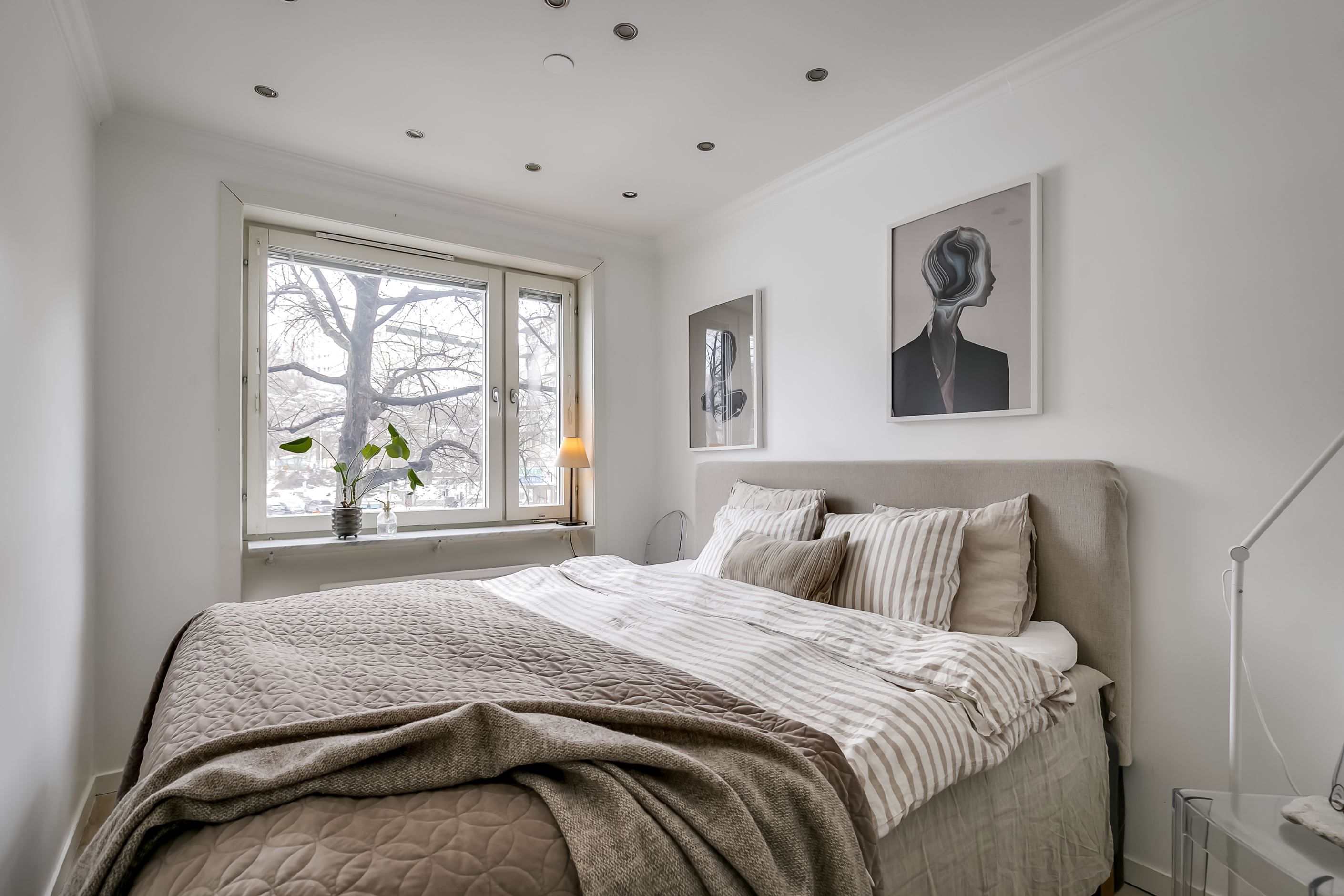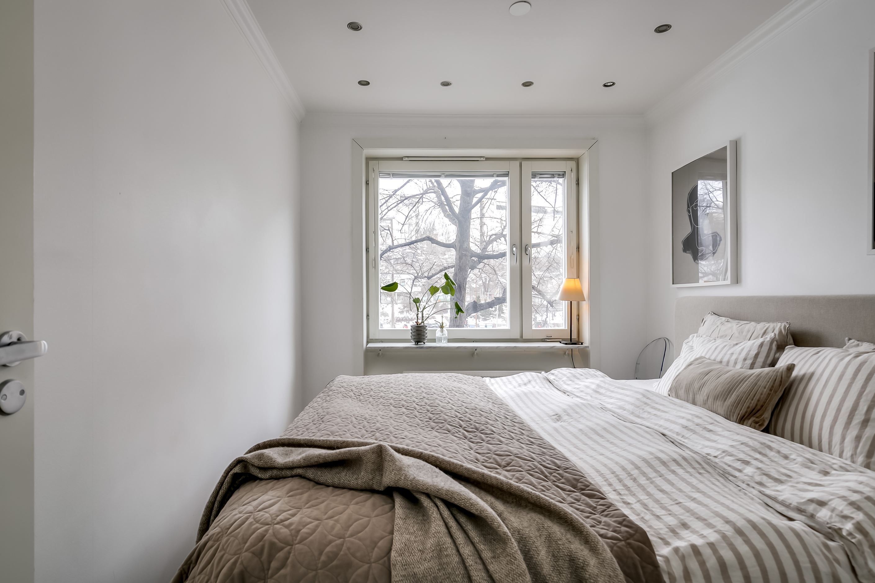 Det rymliga sovrummet erbjuder gott om plats för dubbelsäng och kompletterande möblemang, samtidigt som den generösa klädkammaren ger utmärkta förvaringsmöjligheter. För extra bekvämlighet finns tvättmaskin smart placerad utanför badrummet bakom stilrena skjutdörrar – en praktisk lösning som förenklar vardagen. Badrummet är helkaklat i tidlösa materialval med vitt kakel och elegant svart klinkergolv, vilket skapar en modern och fräsch känsla.
