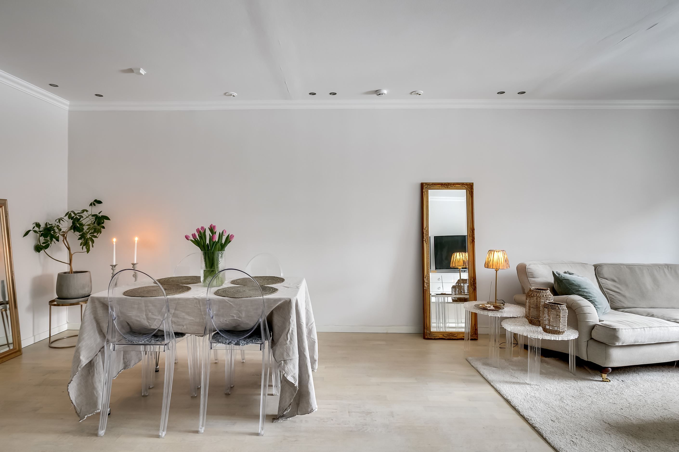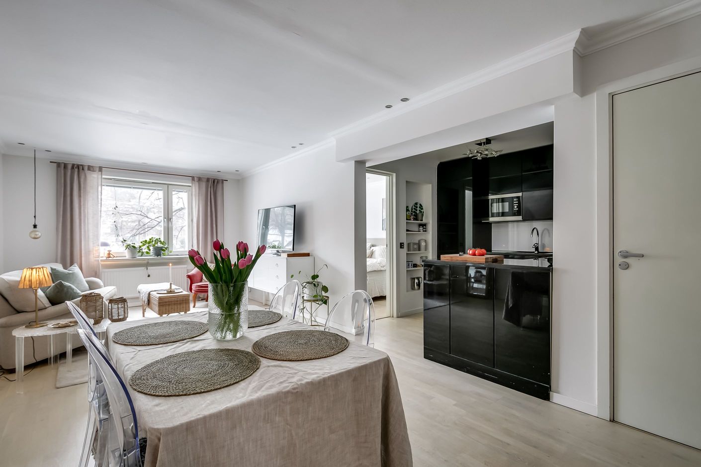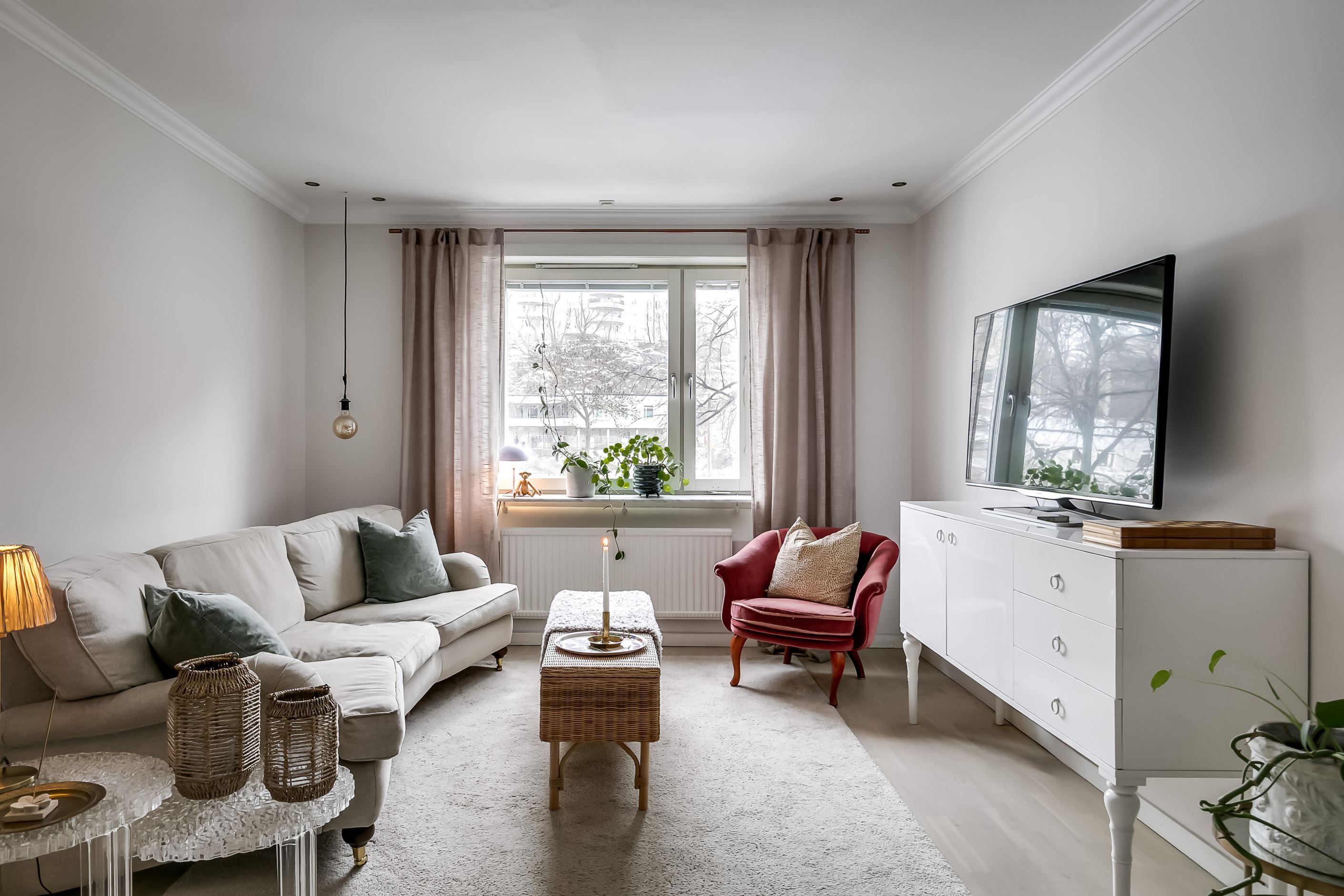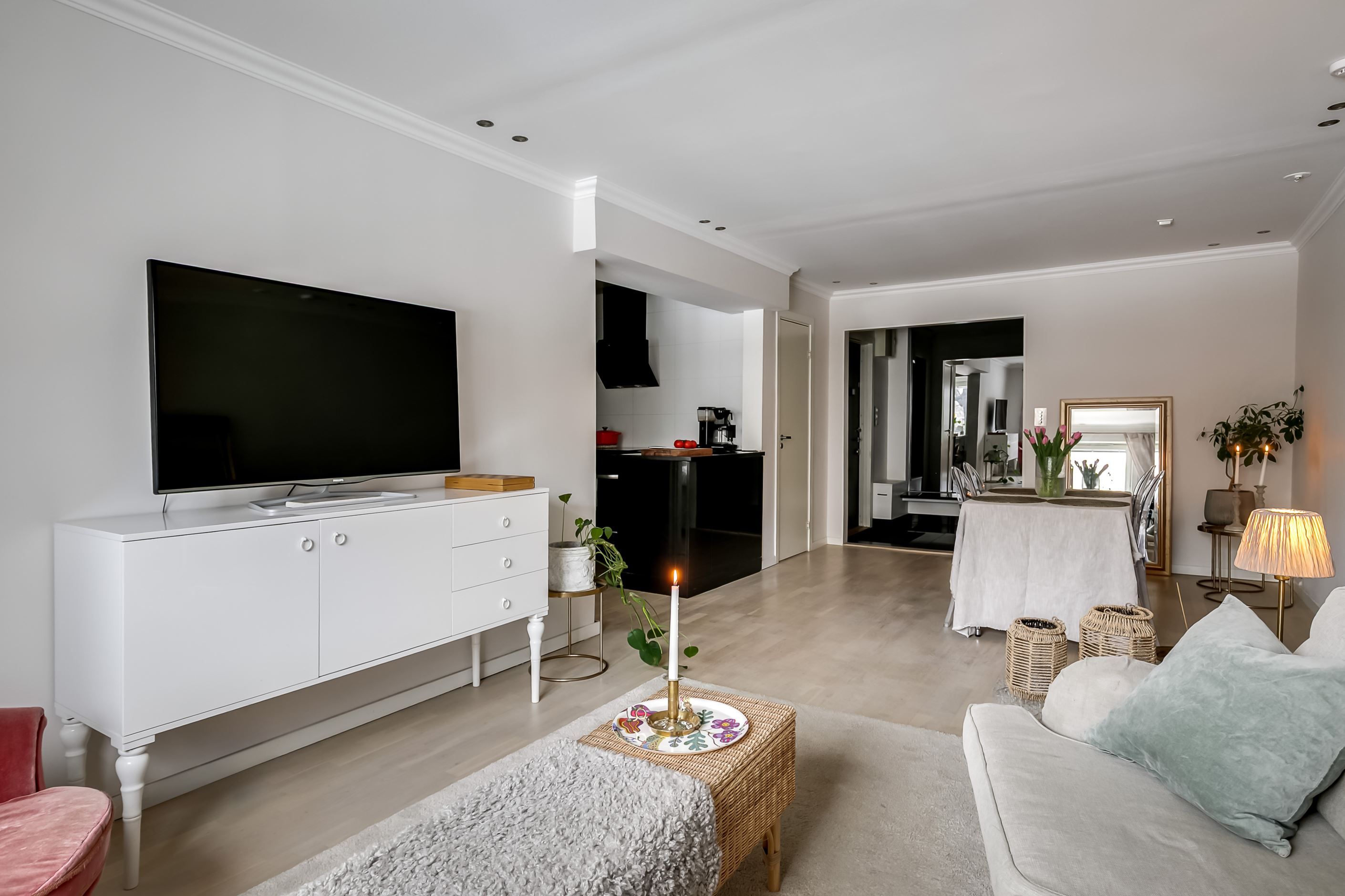 Här möts du av en modern och social planlösning där köket ligger delvis öppet mot vardagsrummet och skapar en inbjudande yta för såväl vardagsliv som umgänge. De öppna sambanden mellan rummen ger ett härligt ljusinsläpp och en luftig känsla som gör bostaden både trivsam och lättmöblerad – perfekt för såväl middagar med vänner som lugna hemmakvällar.