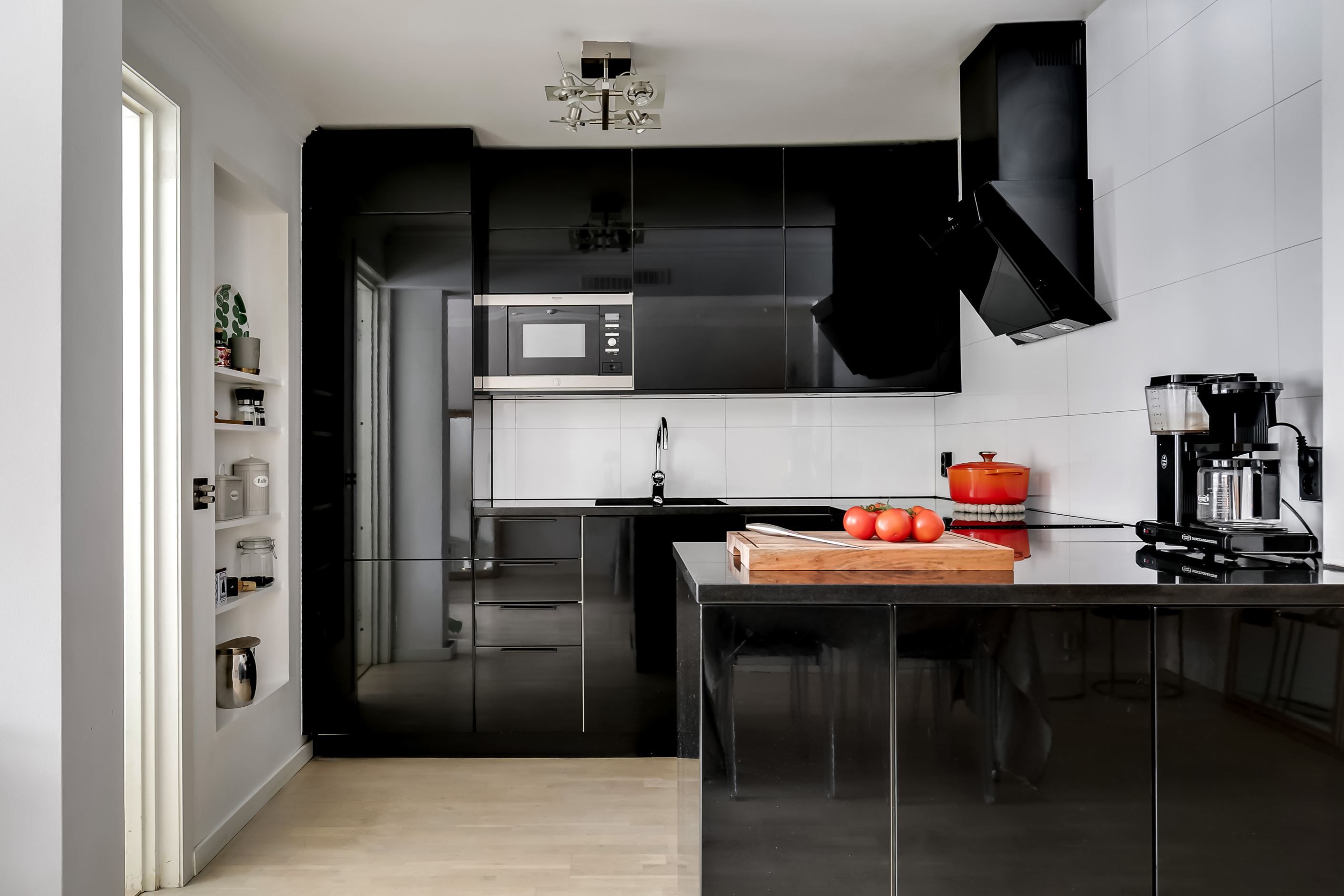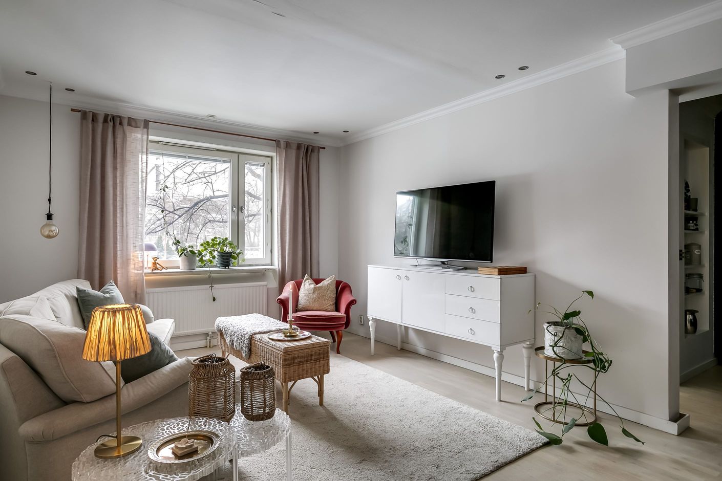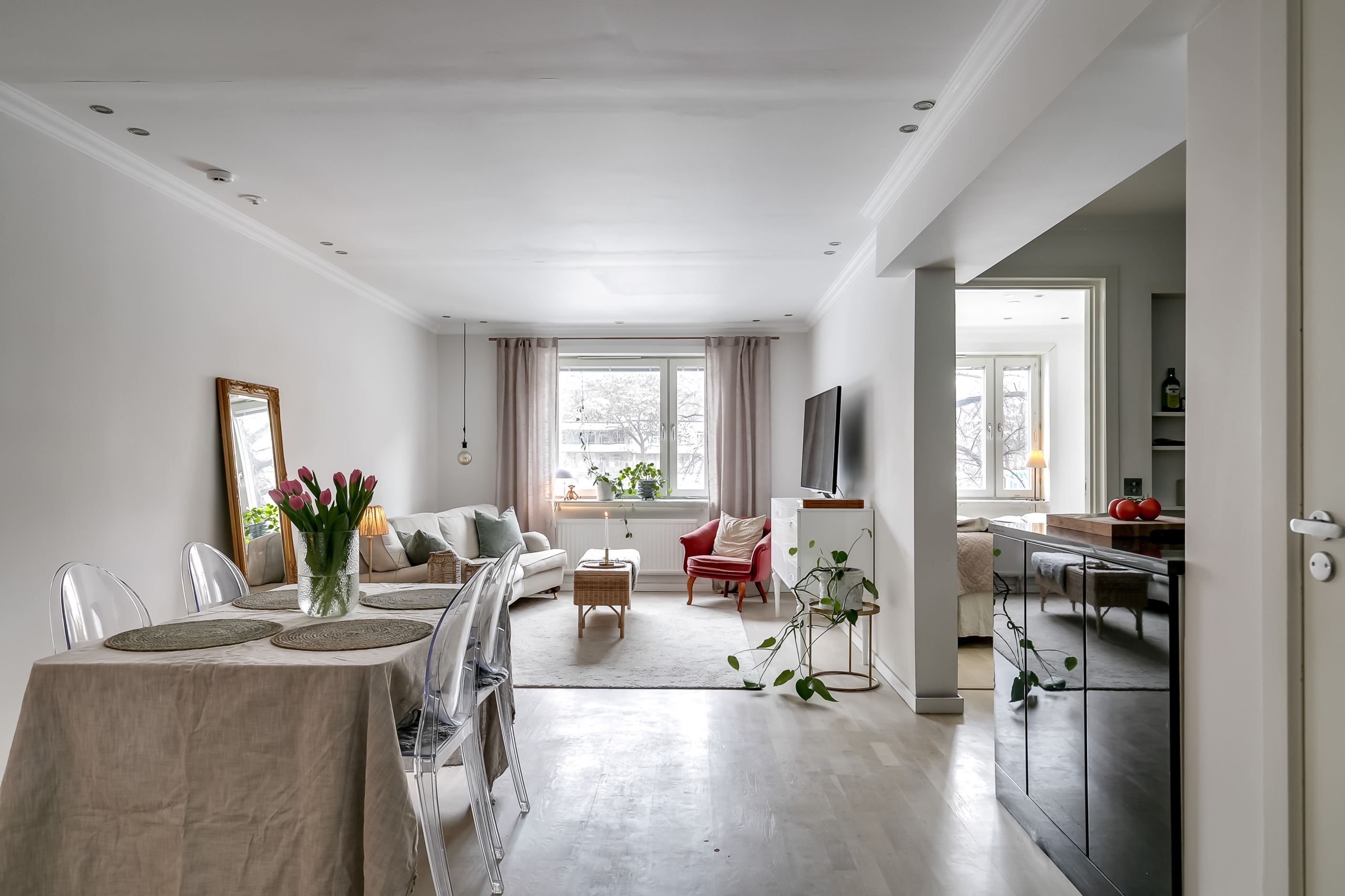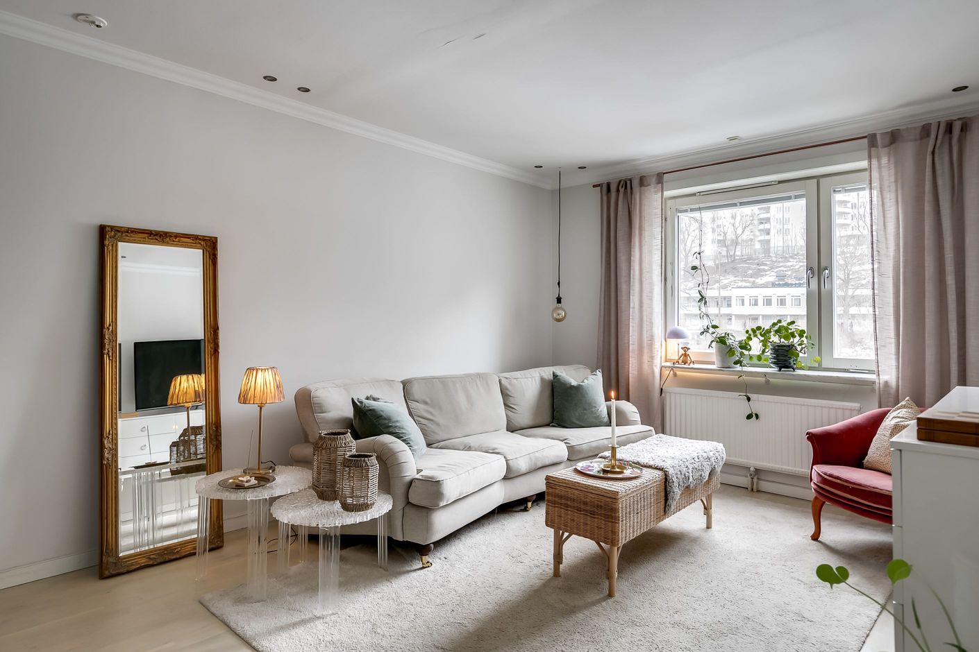 Här möts du av en modern och social planlösning där köket ligger delvis öppet mot vardagsrummet och skapar en inbjudande yta för såväl vardagsliv som umgänge. De öppna sambanden mellan rummen ger ett härligt ljusinsläpp och en luftig känsla som gör bostaden både trivsam och lättmöblerad – perfekt för såväl middagar med vänner som lugna hemmakvällar.