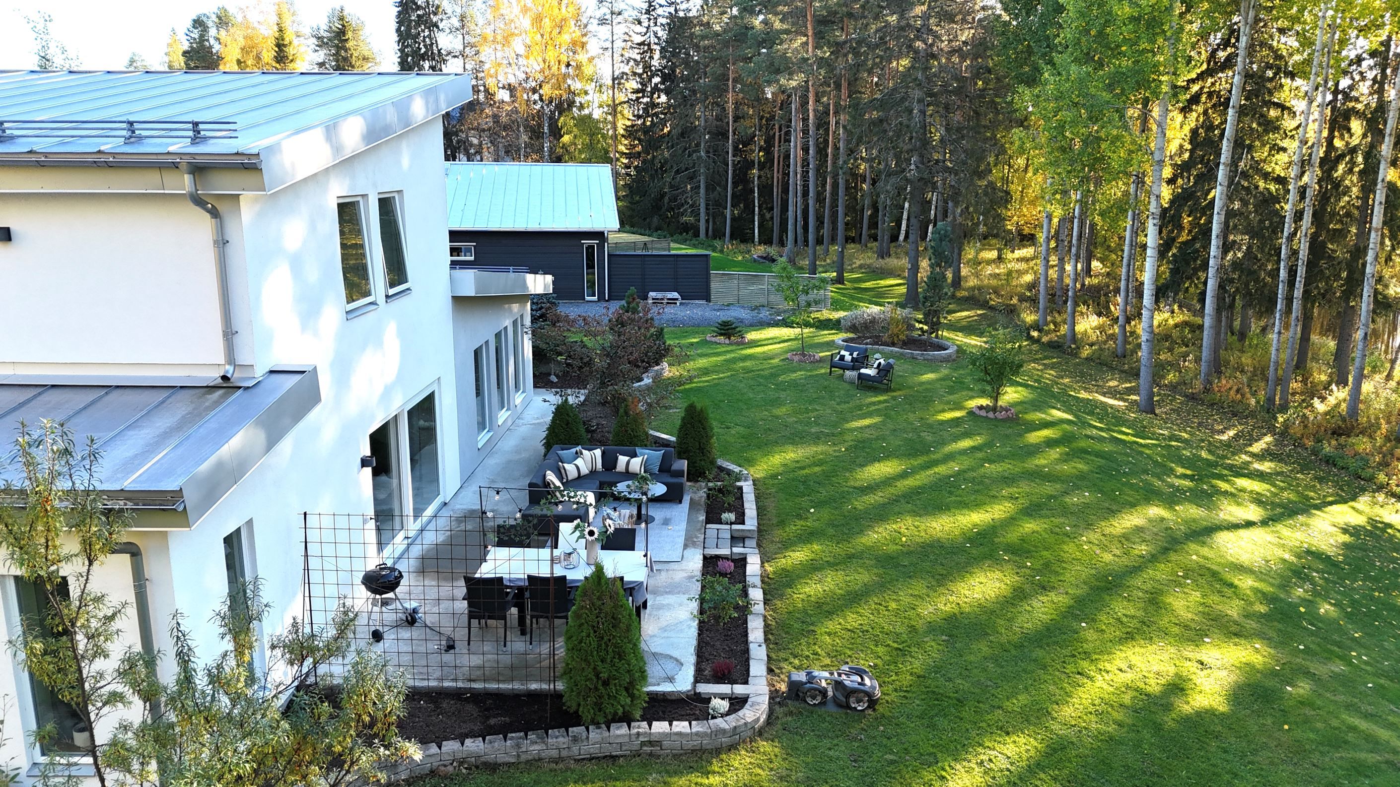 Den 985 kvm stora, insynsskyddade tomten är omgiven av grönska och erbjuder flera uteplatser i olika väderstreck. Här finns fiber indraget, bergvärme och en gjuten altan som förlänger vardagsrummet under sommarhalvåret.