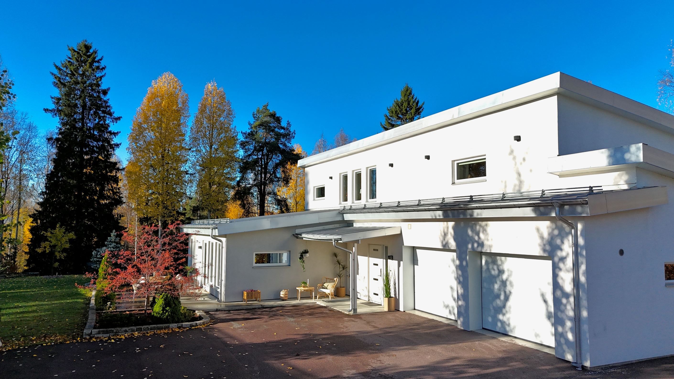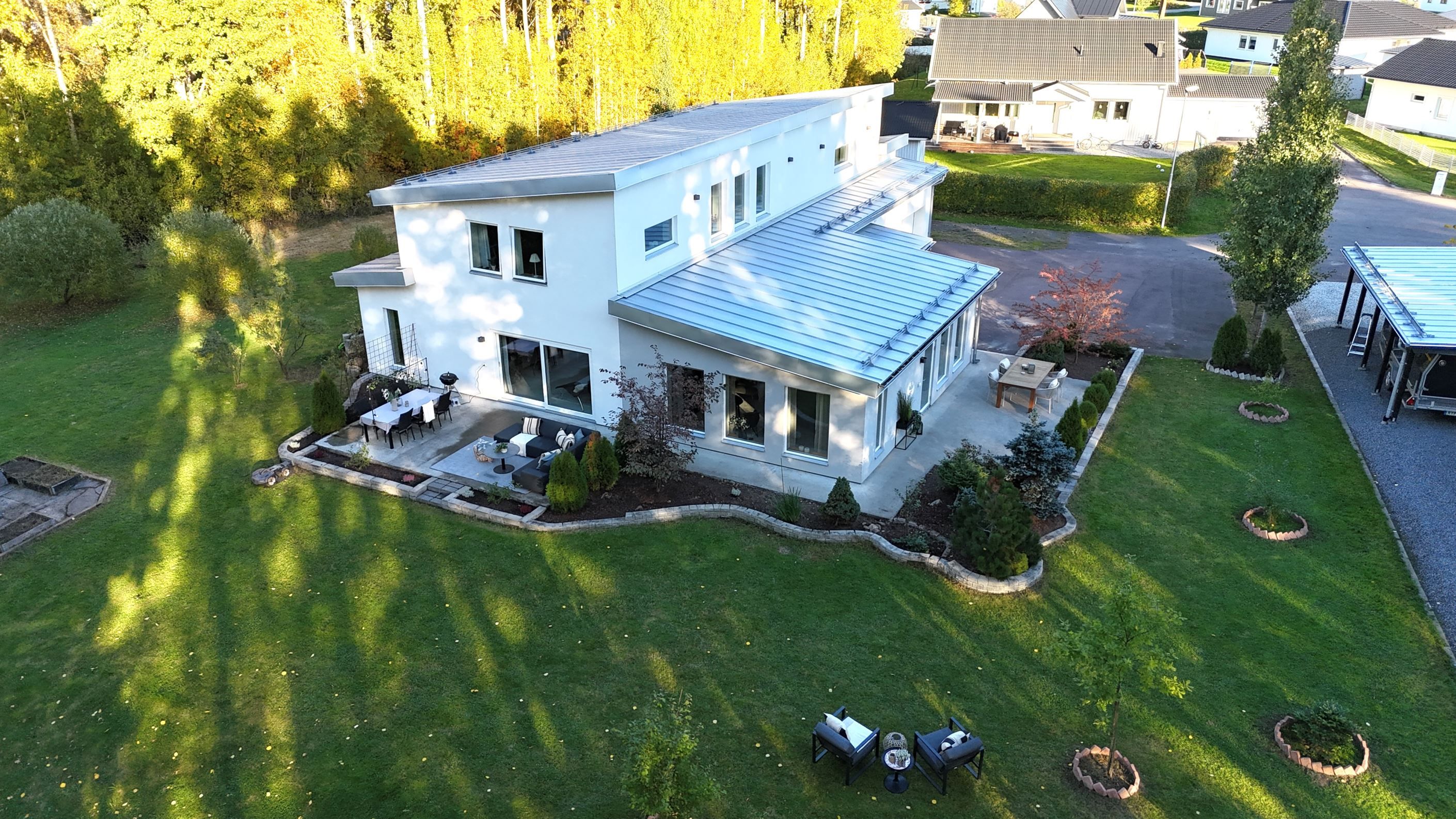 Redan vid infarten möts du av den eleganta fasaden, den breda uppfarten och det rymliga dubbelgaraget. Innanför dörren fortsätter känslan, en luftig hall med trappa i trä och glas leder in i ett hem där varje detalj är genomtänkt.