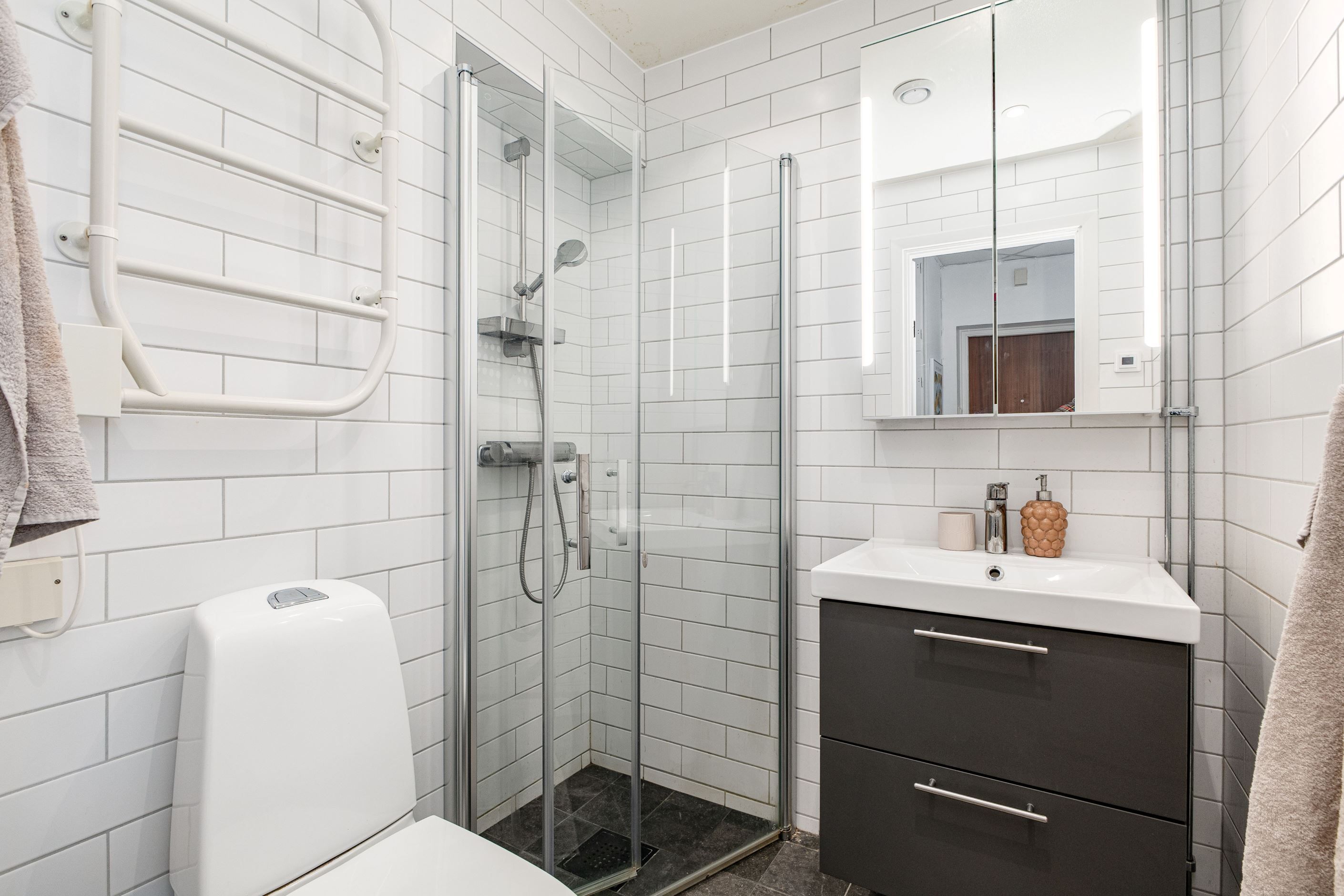 Den smart disponerade sovalkoven skapar en naturlig och rofylld plats för säng och bidrar till en genomtänkt planlösning. Det helkaklade badrummet är nyligen renoverat och håller en fräsch och modern standard.
