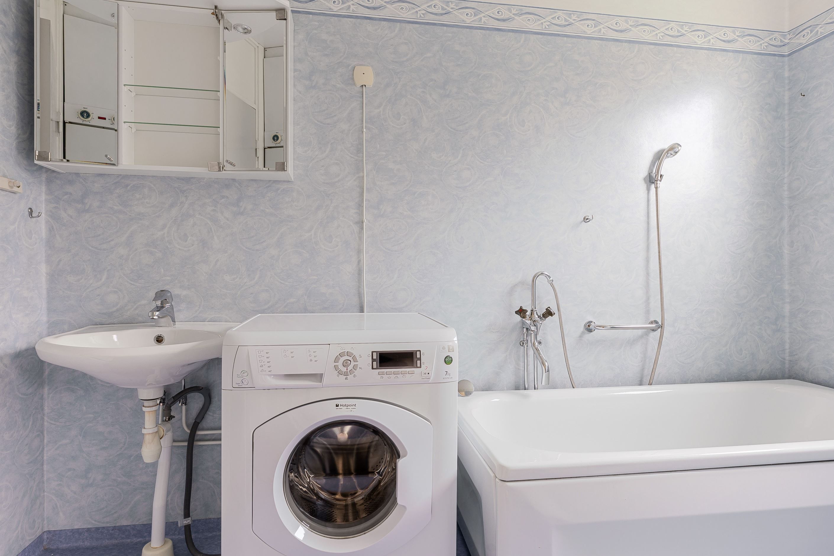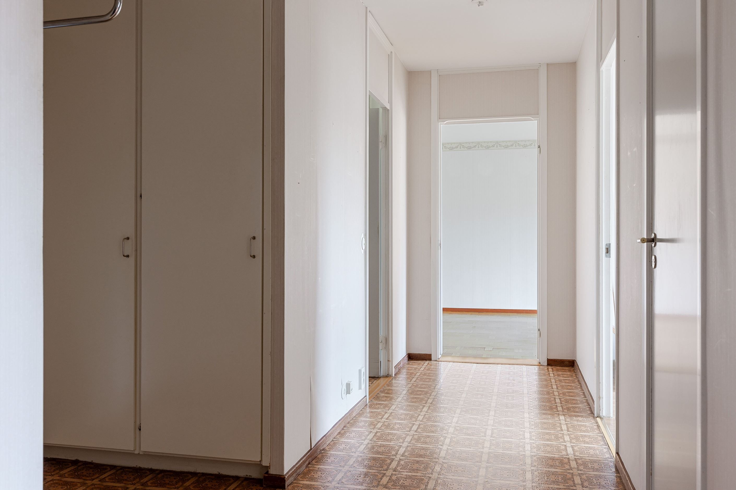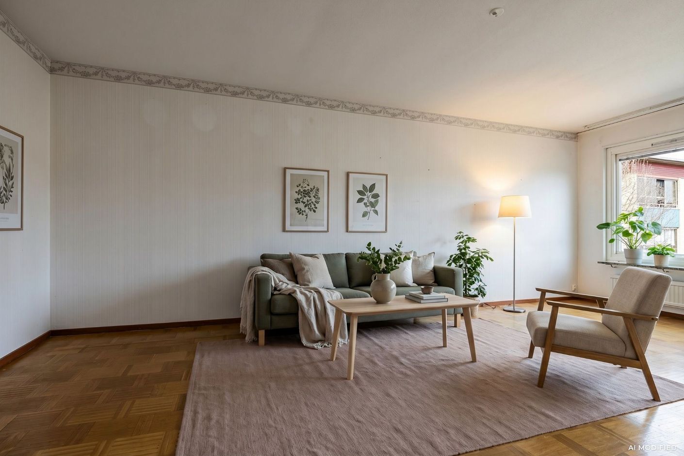 Interiört möts du av en välplanerad hall med kappavhängningsyta och garderobsförvaring. Vardagsrummet är luftigt - här får du plats med både matsalsbord och soffgrupp. Köket har gott om förvaringsutrymmen och har utrymme för matbord intill stort fönsterparti. I lägenheten finns två bra badrum, det ena med badkar och det andra med dusch. I det stora badrummet finns tvättmaskin.