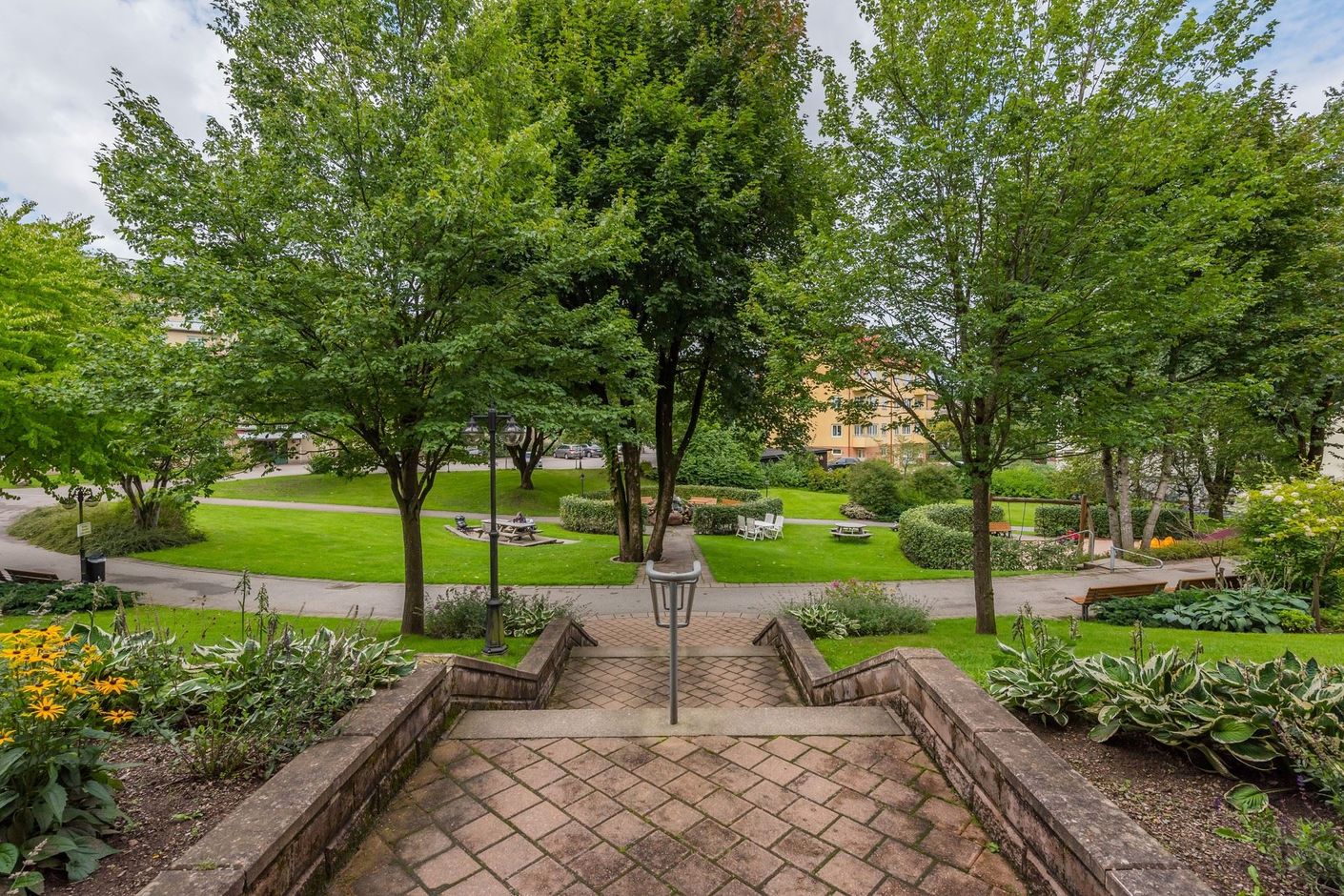 platsbyggda utemöbeln inkluderas. Badrummet är helkaklat och utrustat med både tvättmaskin och torktumlare, vilket ger en bekväm och praktisk vardag. Lägenheten är belägen på markplan med egen ingång. Föreningen har ledig parkering för köparen att hyra. Med sitt centrala läge nära högskolan erbjuder denna bostad närhet till allt man kan önska sig. Här finns även en stor