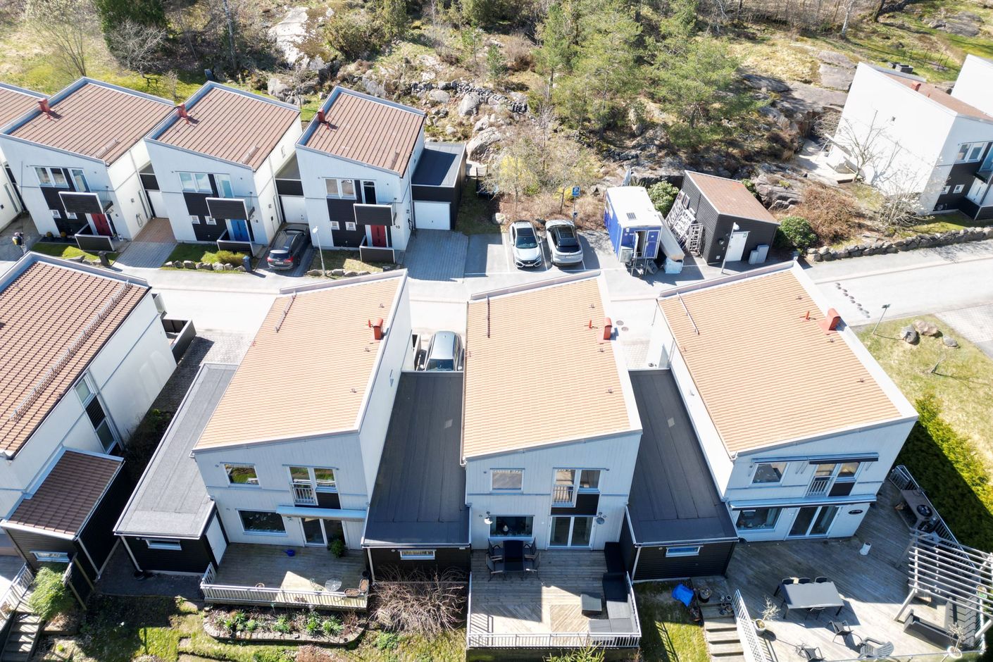 Här erbjuds ett modernt och välplanerat hem med ett av områdets kanske bästa lägen, helt utan insyn tack vare det fria läget med gästparkering framför huset och grönskande omgivning på baksidan. Entréplanet präglas av en öppen och social planlösning där kök och vardagsrum samspelar på ett naturligt sätt. De generösa ytorna bjuder in till både vardag och umgänge, och de stora fönsterpartierna ger ett fint ljusinsläpp. Härifrån nås den trälagda altanen på baksidan, en privat och rofylld plats med grönska och träd som fond, perfekt för avkoppling eller sociala tillställningar. På entréplan finns även badrum samt en praktisk tvättstuga som underlättar vardagen. Vattenburen golvvärme på hela nedre plan bidrar till hög komfort, och bostaden är även utrustad med centraldammsugare för extra bekvämlighet.
