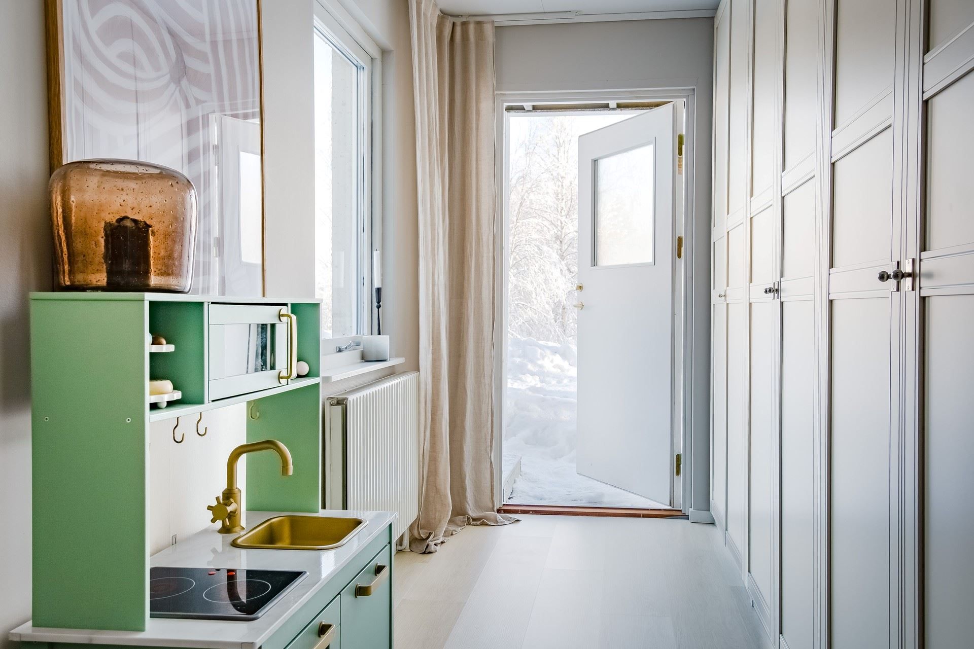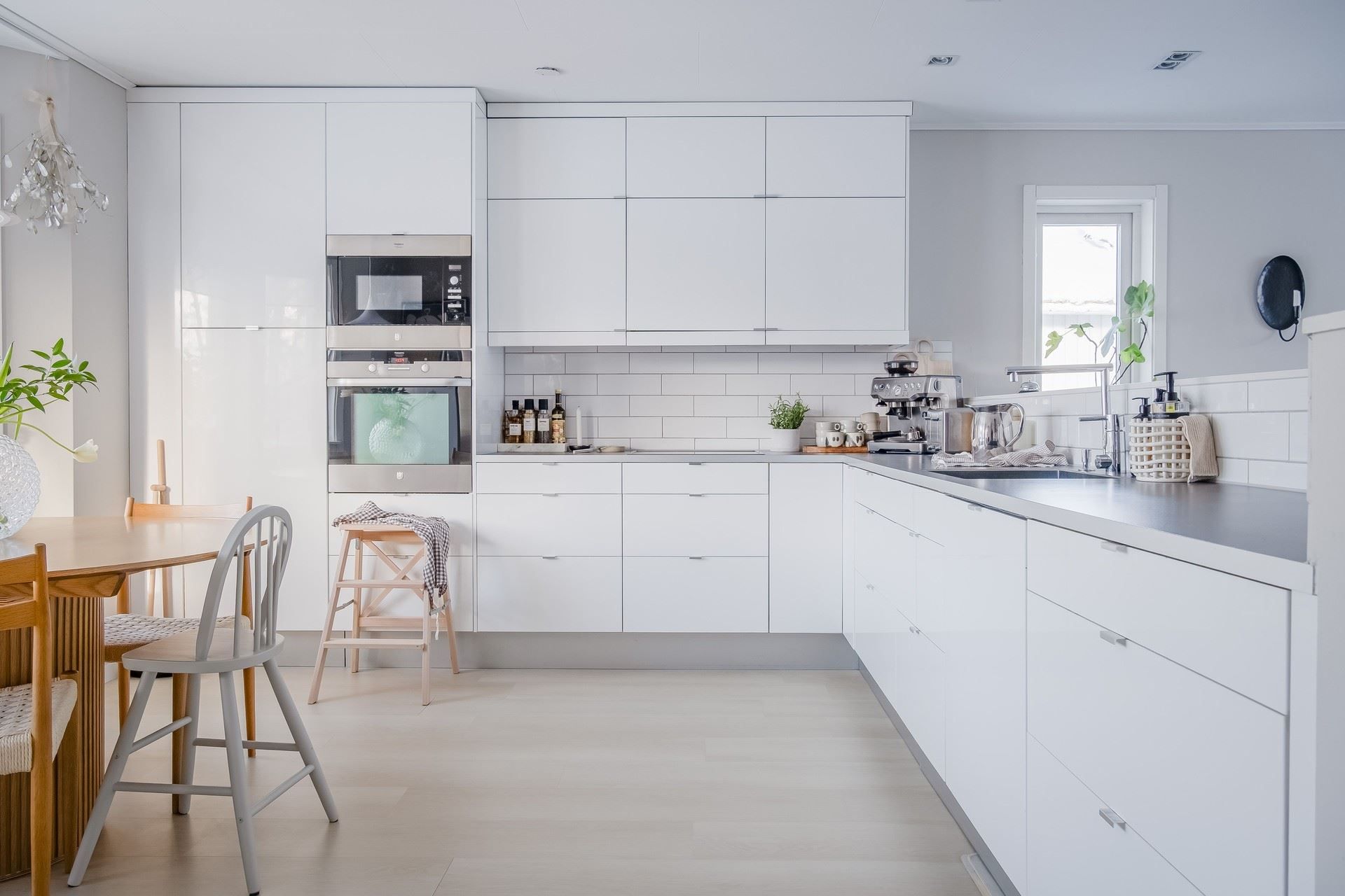 Hela bostaden har genomgående ljusa ytskikt som är renoverade och enhetligt nytt vinylklickgolv (2023).