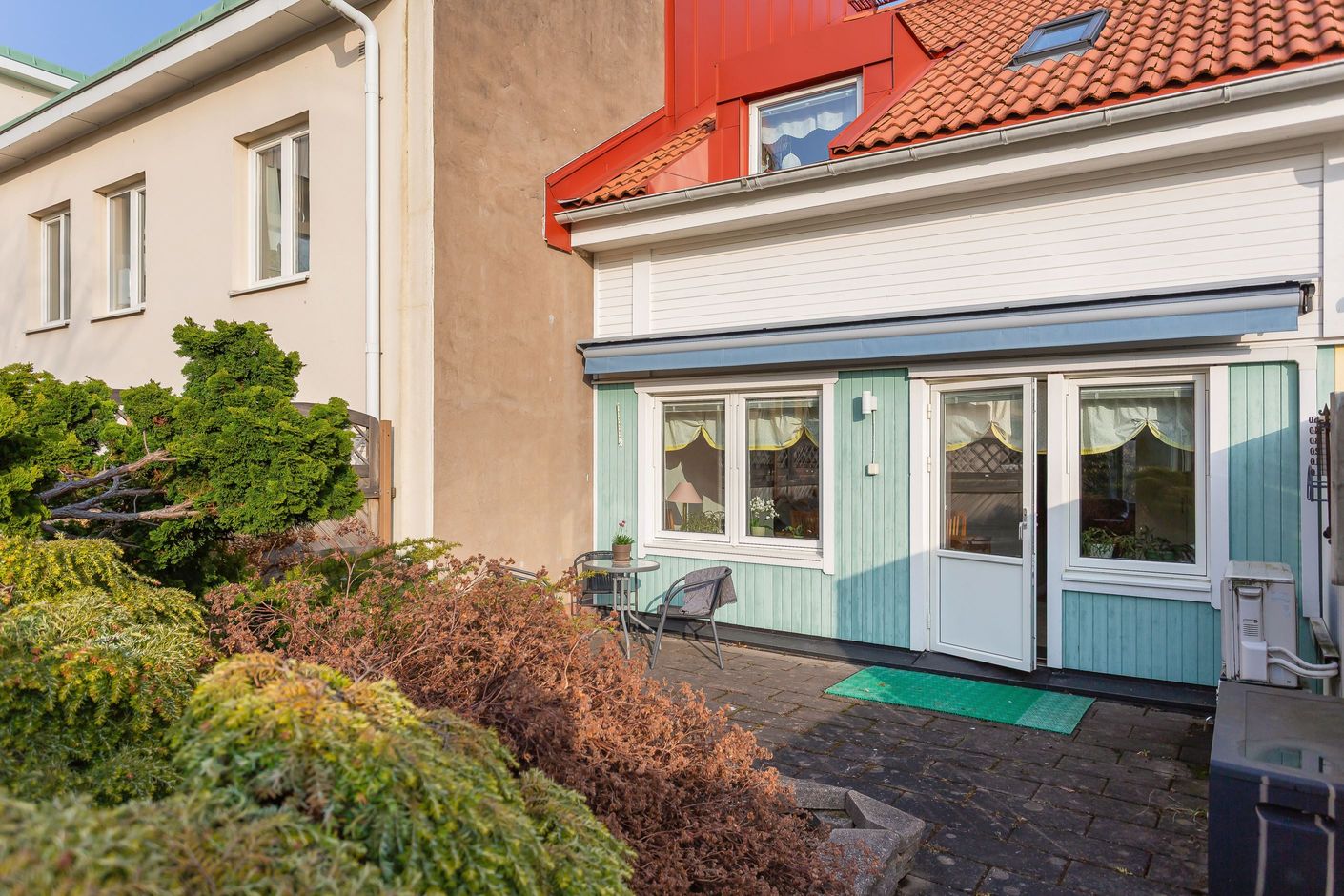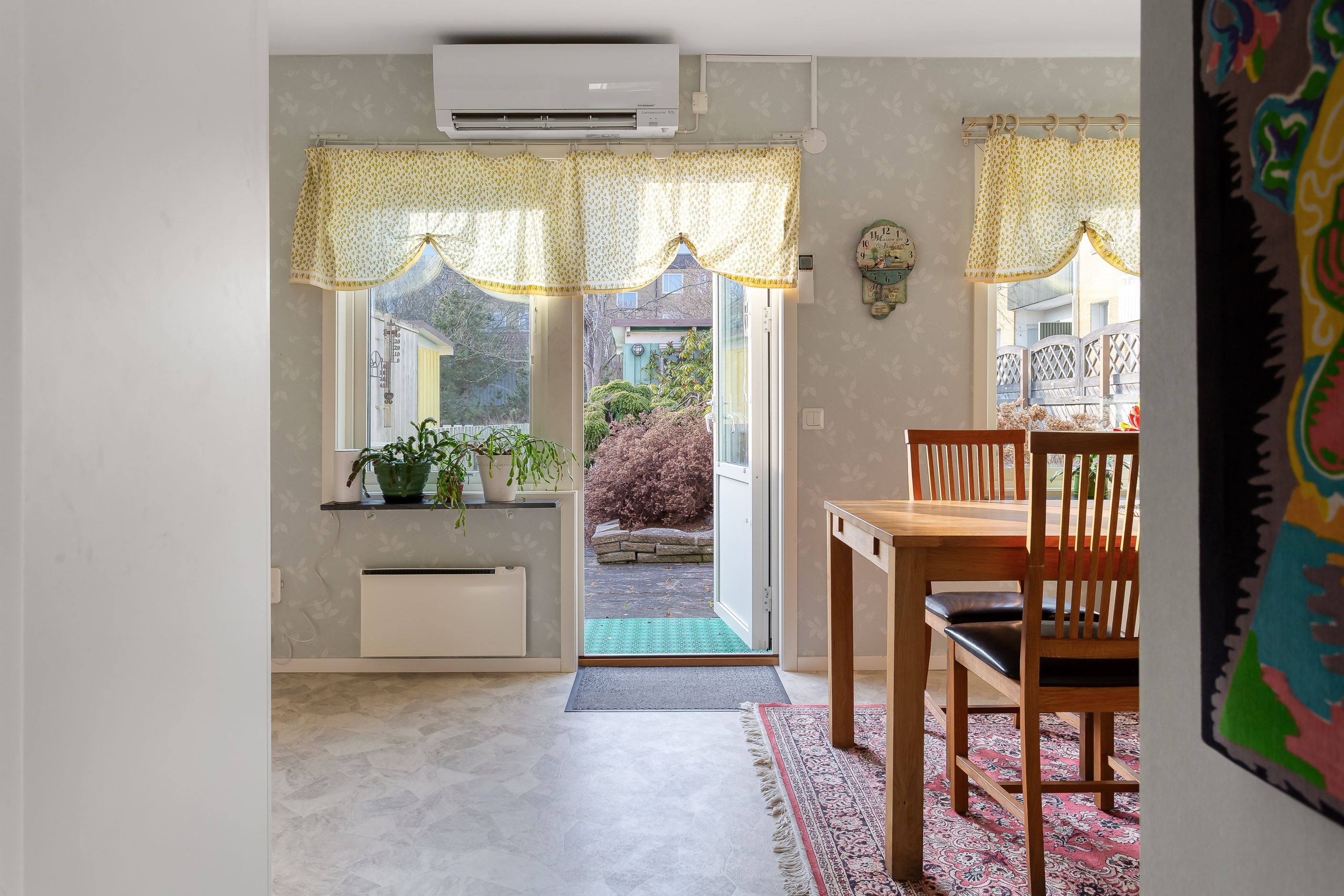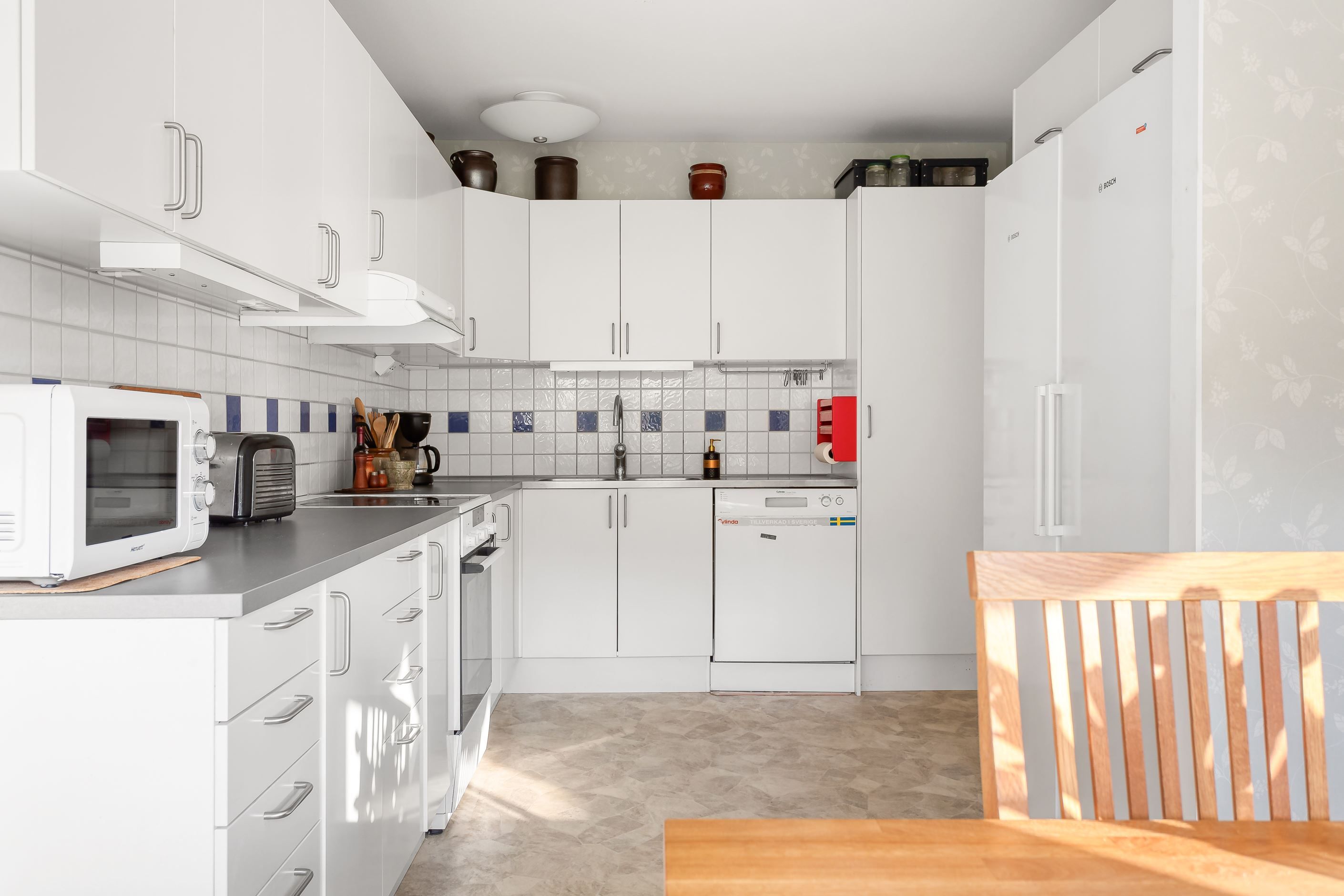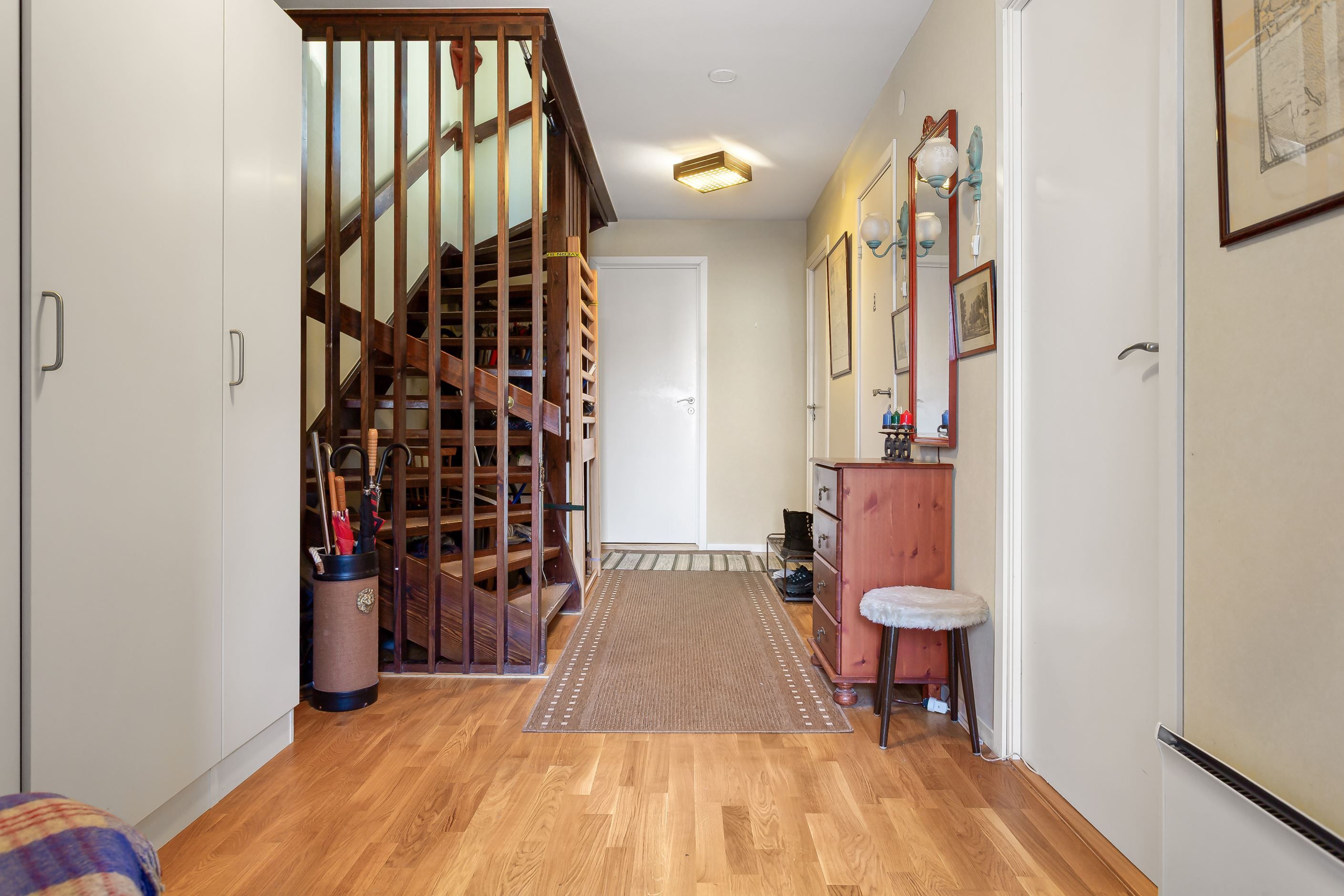 Bostaden renoverades till stora delar under ca. 2016 då hela radhuslängan drabbades av en brand och mycket fick återuppbyggas. Det betyder att det mesta i bostaden är nytt sedan dess, några undantag finns.
