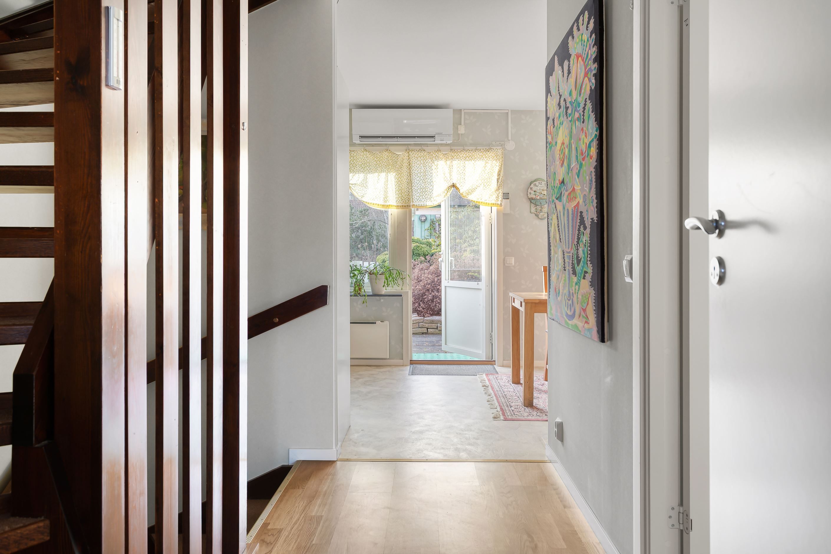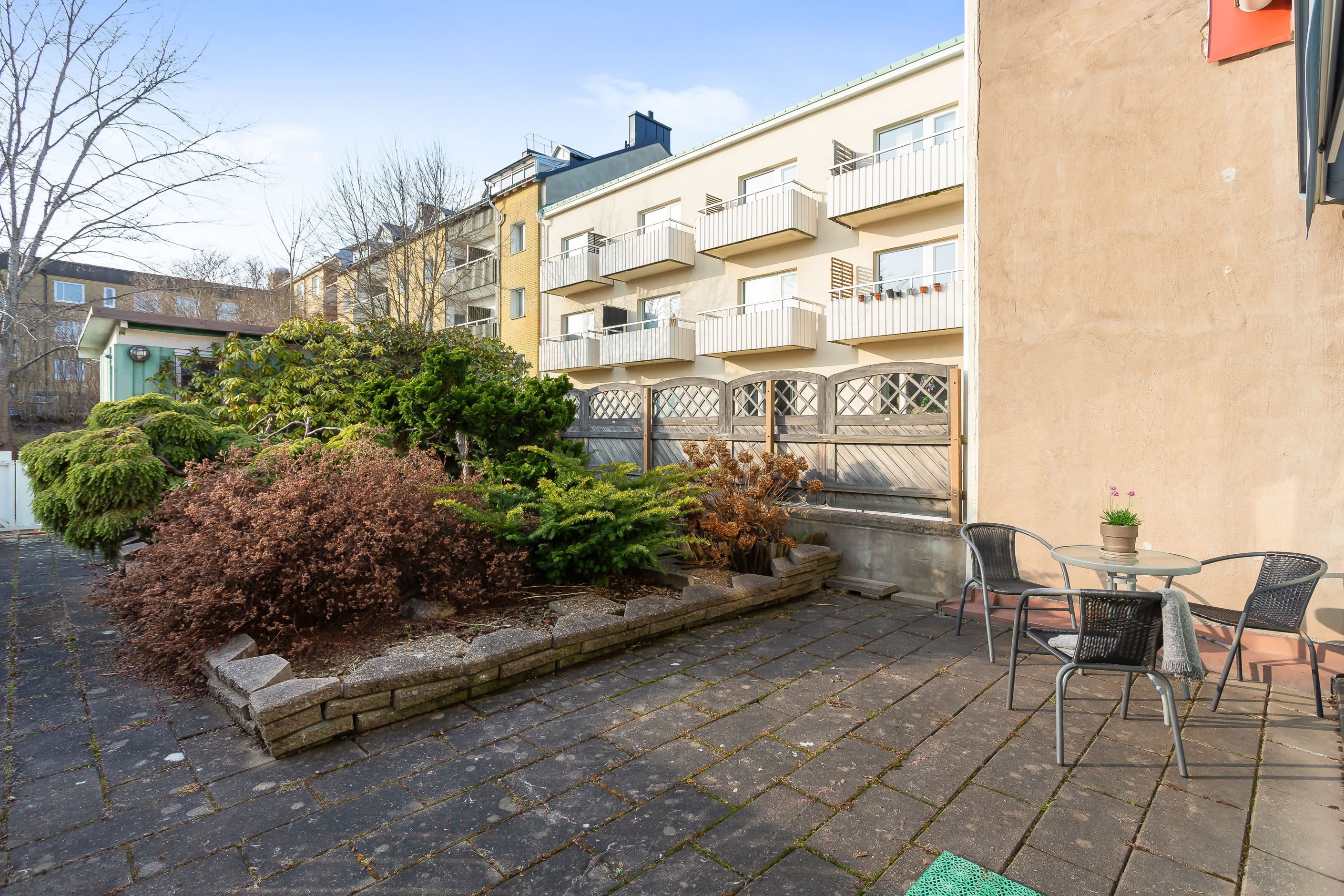 Nästa våningsplan rymmer bostadens sociala ytor med kök och vardagsrum. Från köket nås bostadens trevliga uteplats som ligger mot en stor innergård, uteplatsen vetter mot väster och erbjuder härlig eftermiddags- och kvällssol.