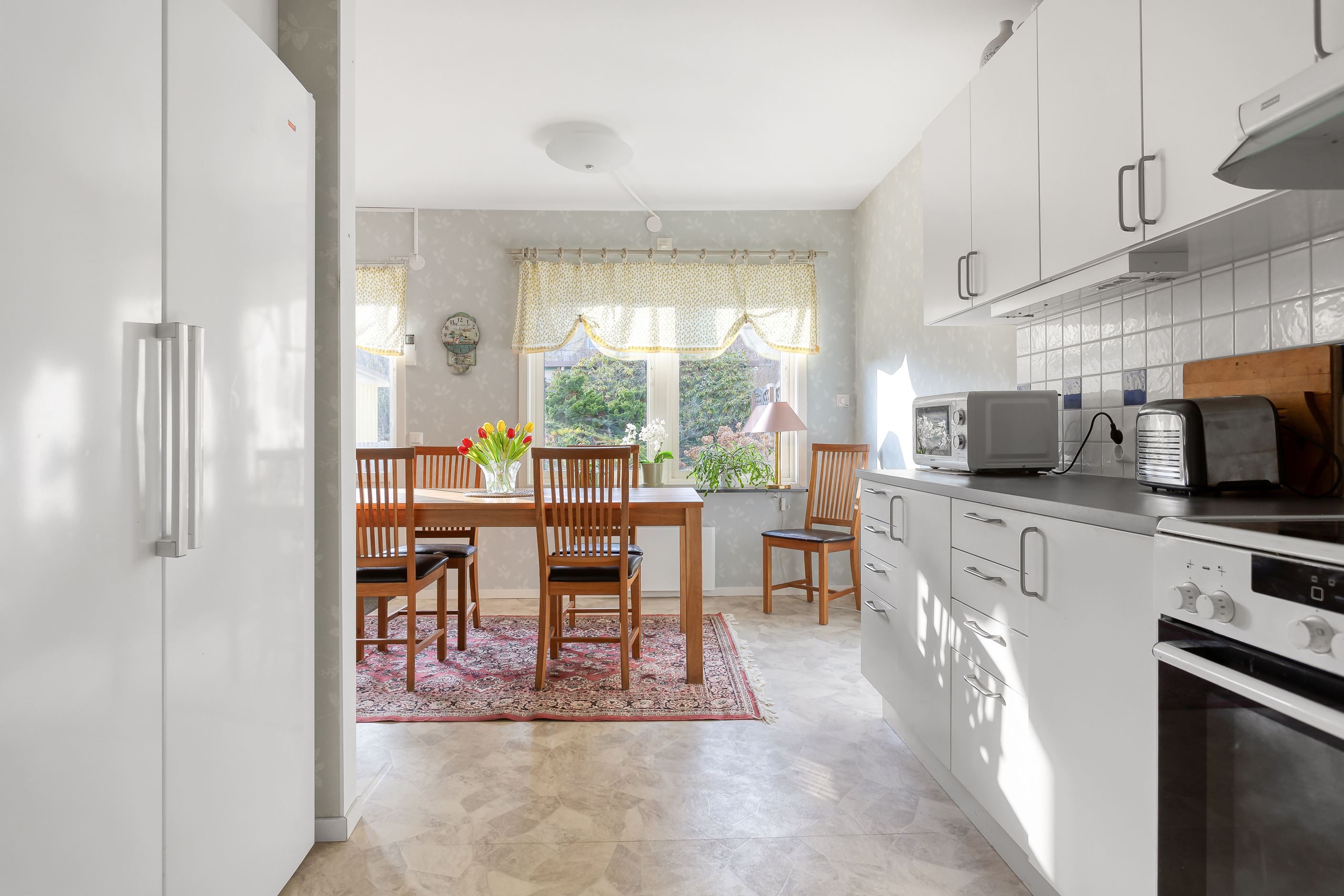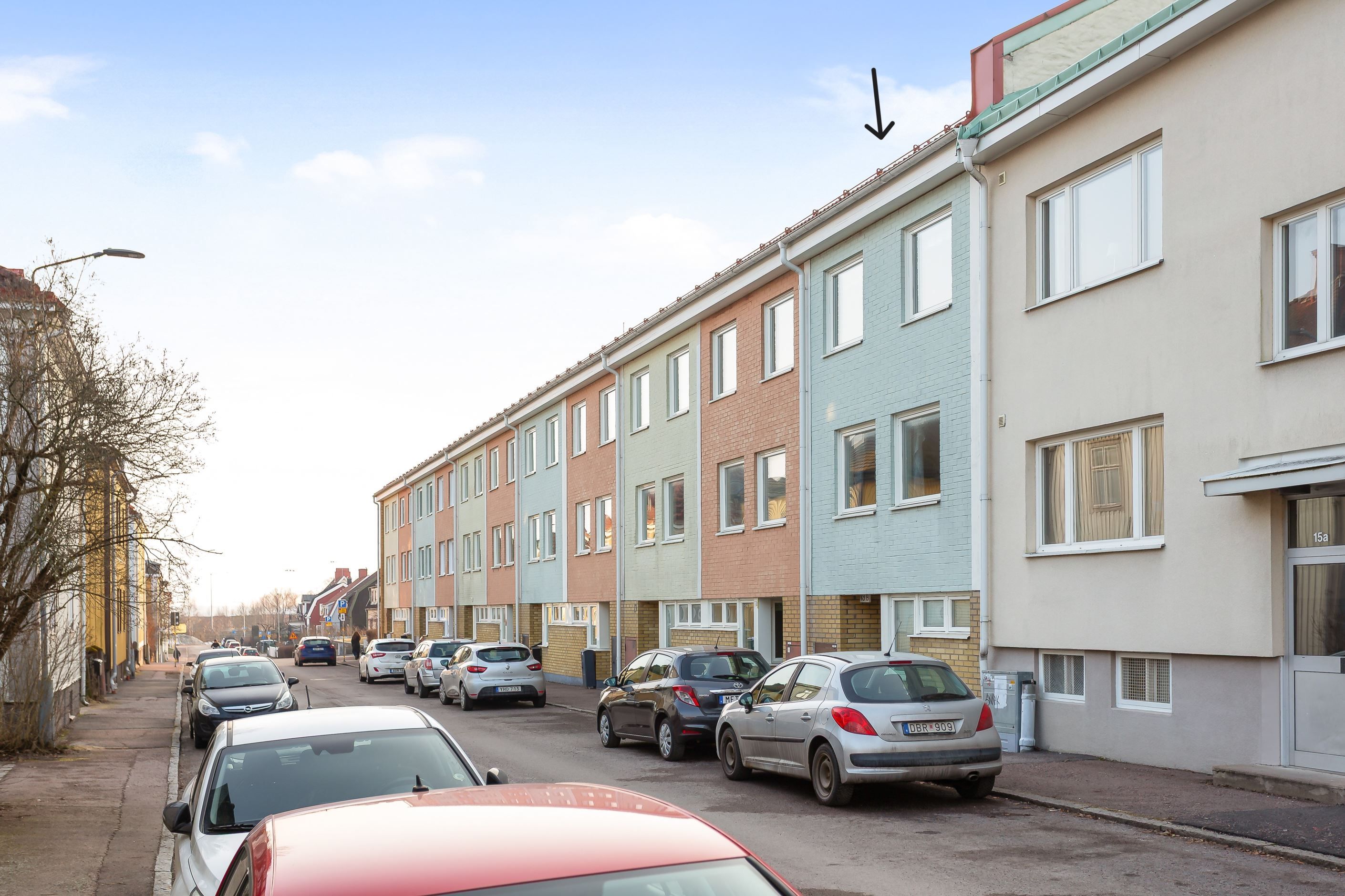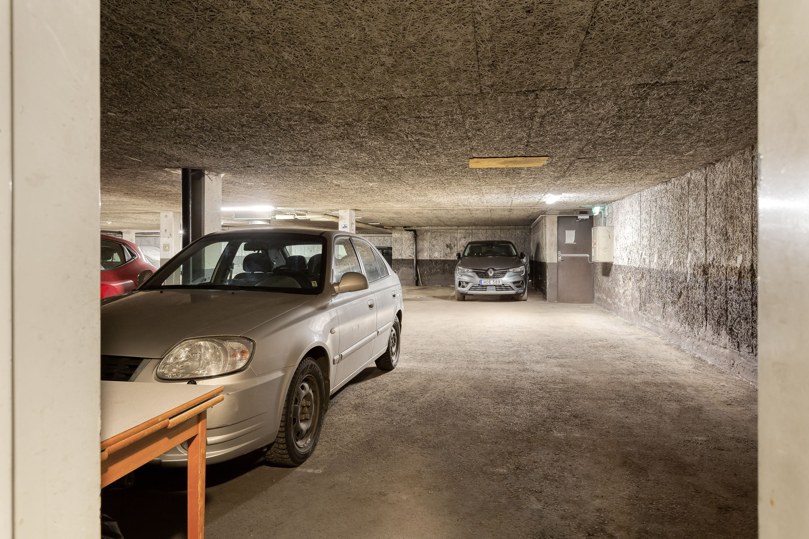 Bostaden sträcker sig över tre våningar där entréplanet välkomnar med en generös entré mot gatan. Från entréplan nås även garaget och de två tillhörande parkeringsplatserna, en genomtänkt lösning som gör vardagen smidig och bekväm.