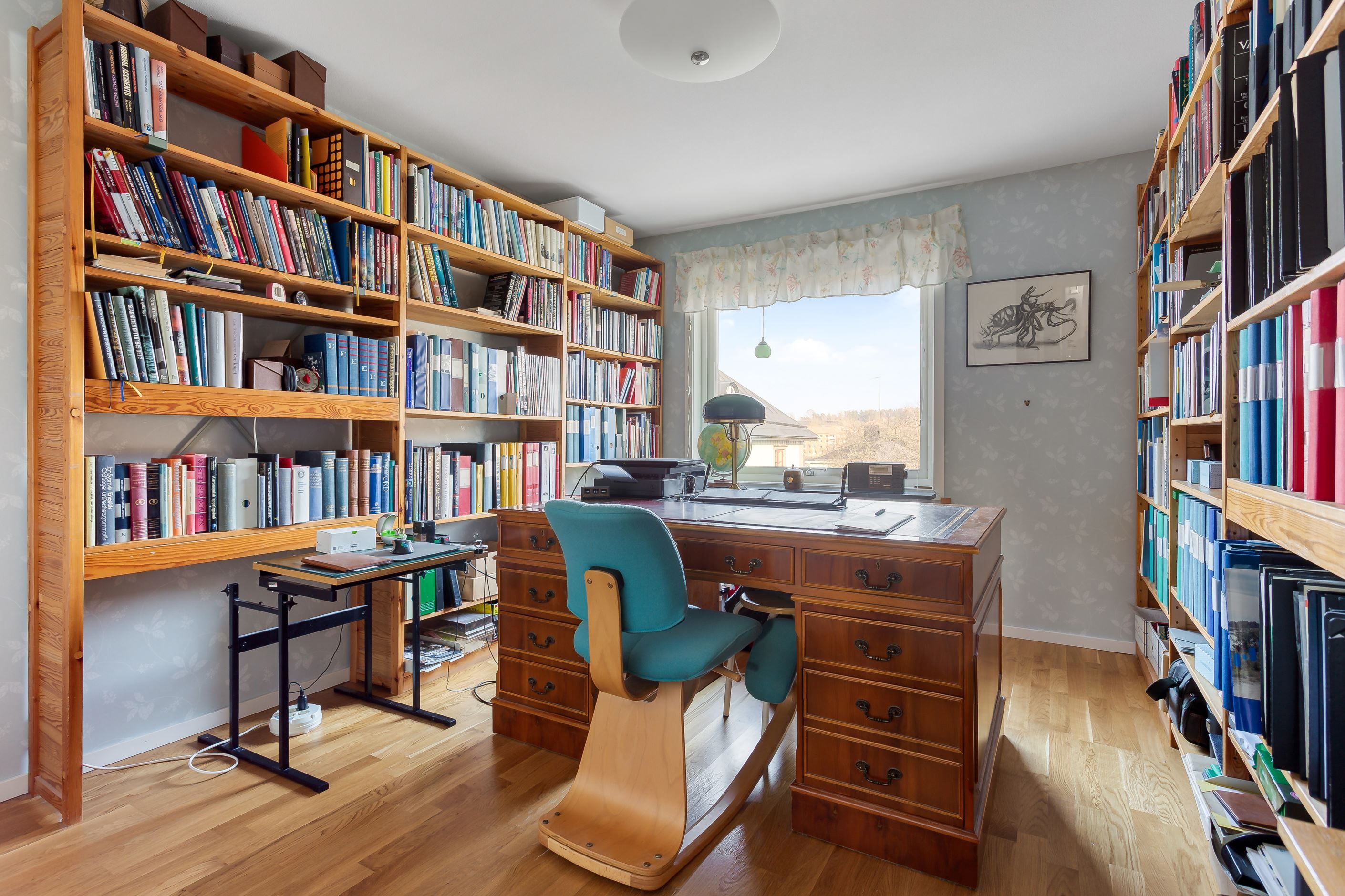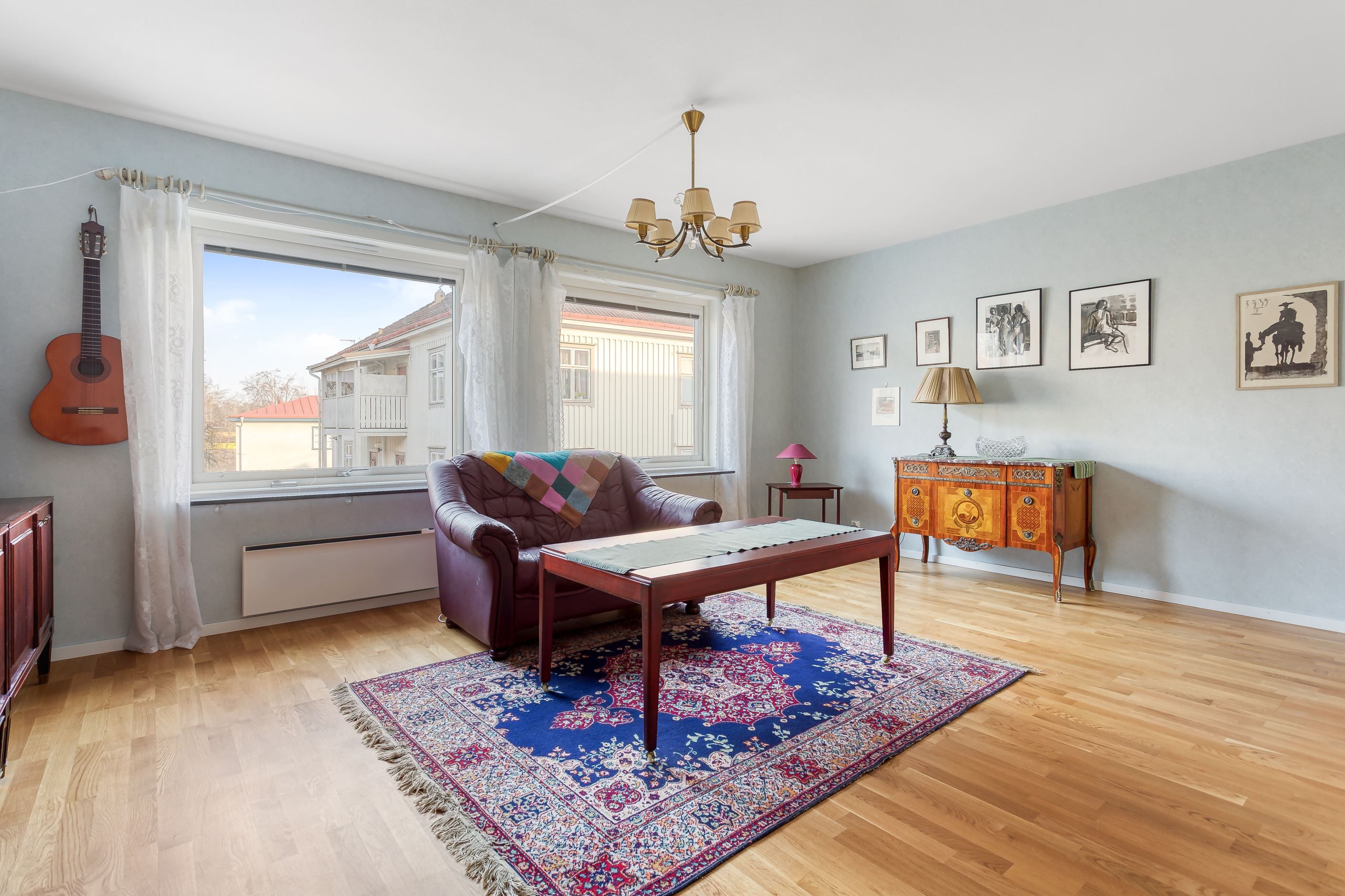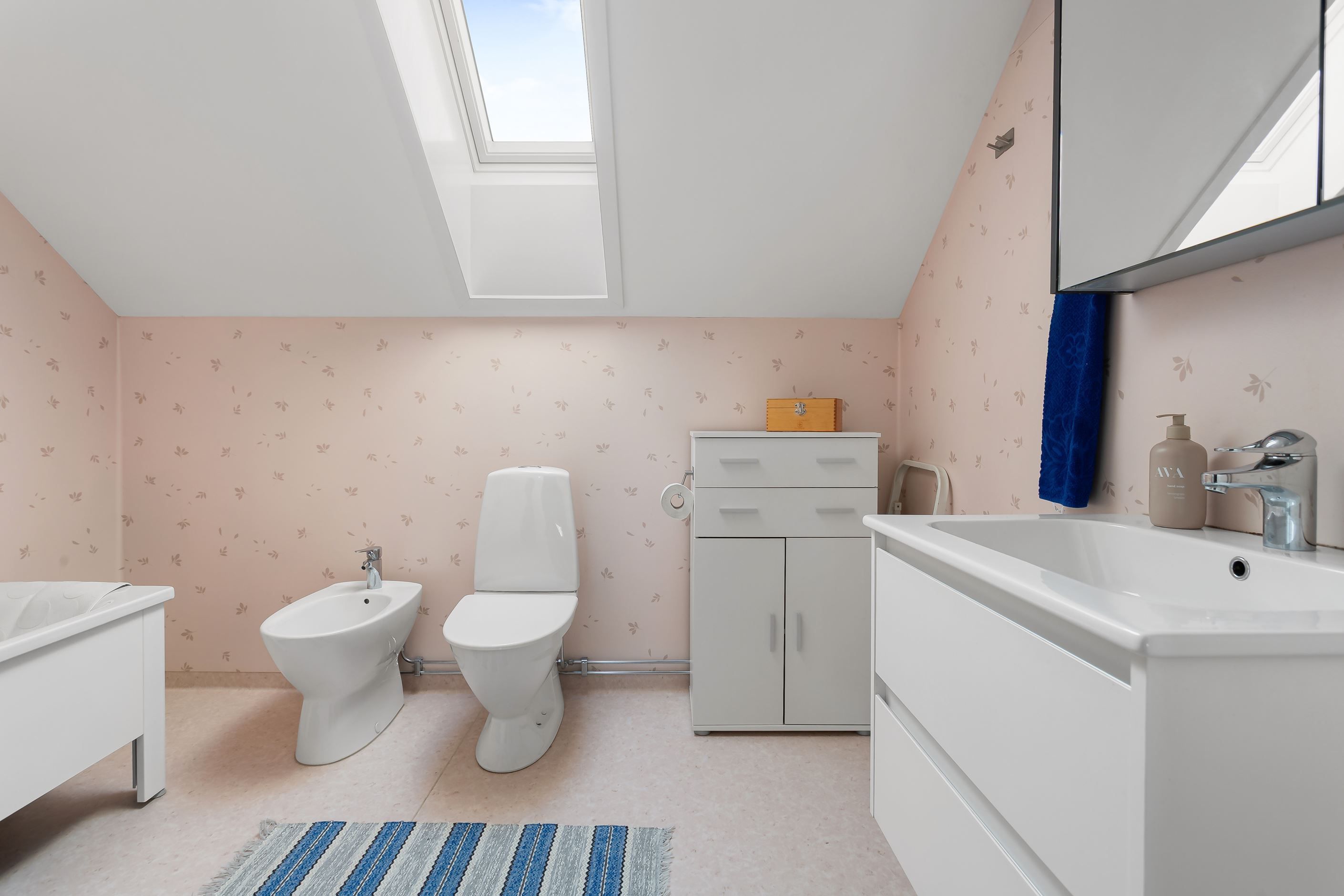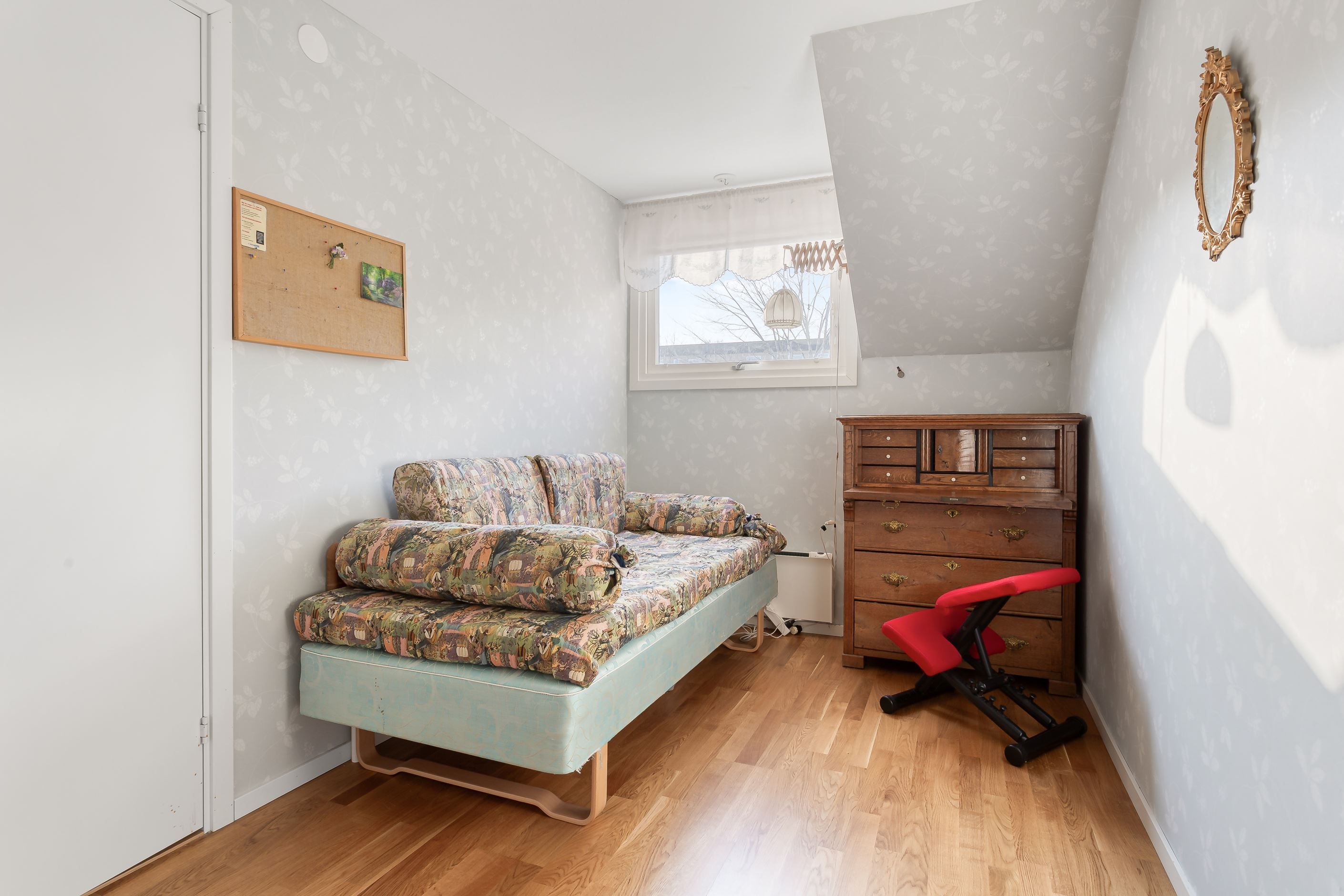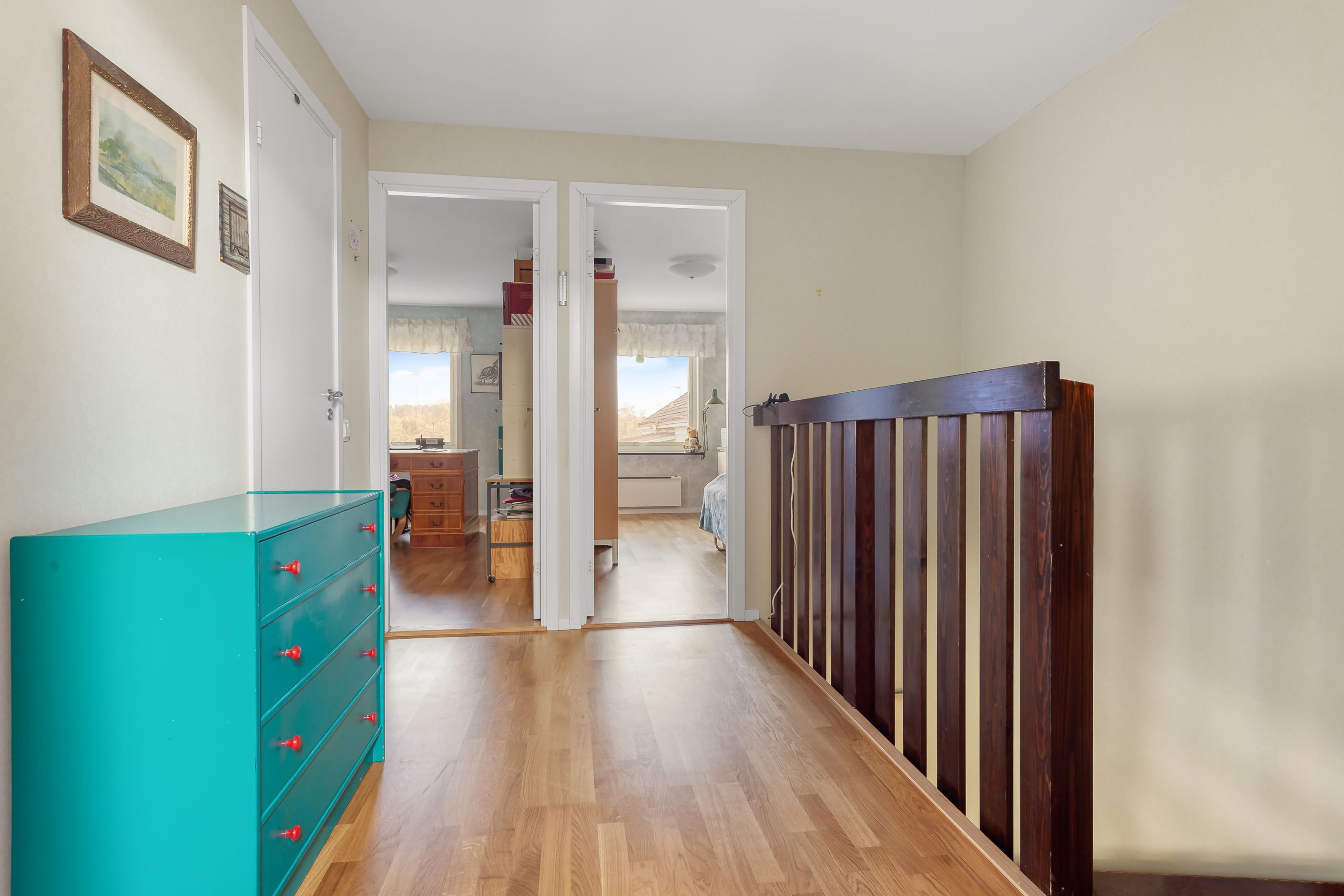 På den översta våningen hittar du istället de mer privata delarna med tre sovrum och ett badrum.
