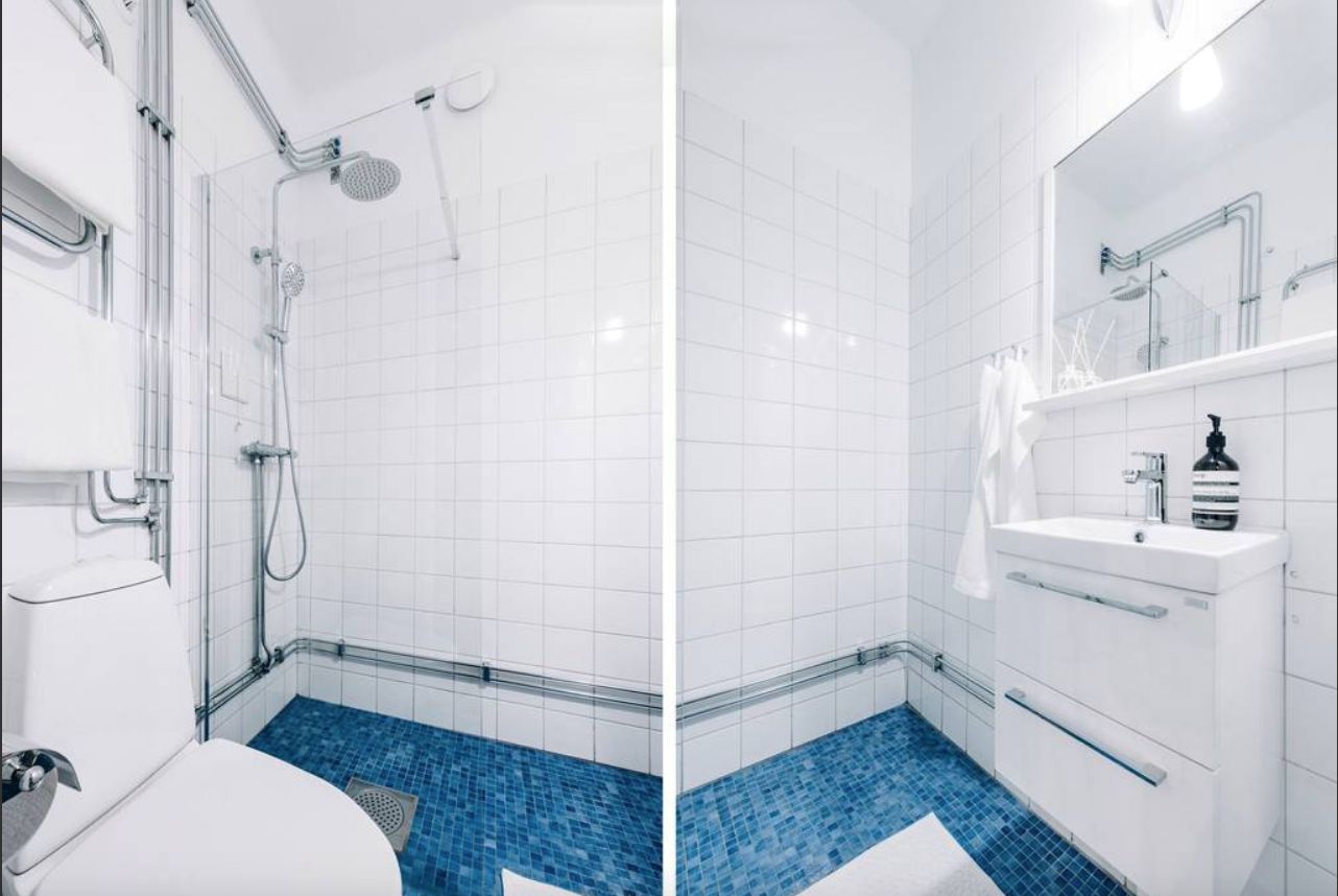 I det ljusa vardagsrummet finns gott om plats för både soffa och matbord, medan den smart planerade sovalkoven rymmer en 1,4-säng på ett naturligt och avskilt sätt. De stora fönsterpartierna fyller rummet med ljus och framhäver de vackra detaljerna – fiskbensmönstrad parkett och ljust målade väggar. Badrummet är fräscht och ljust, kaklat och utrustat med dusch.