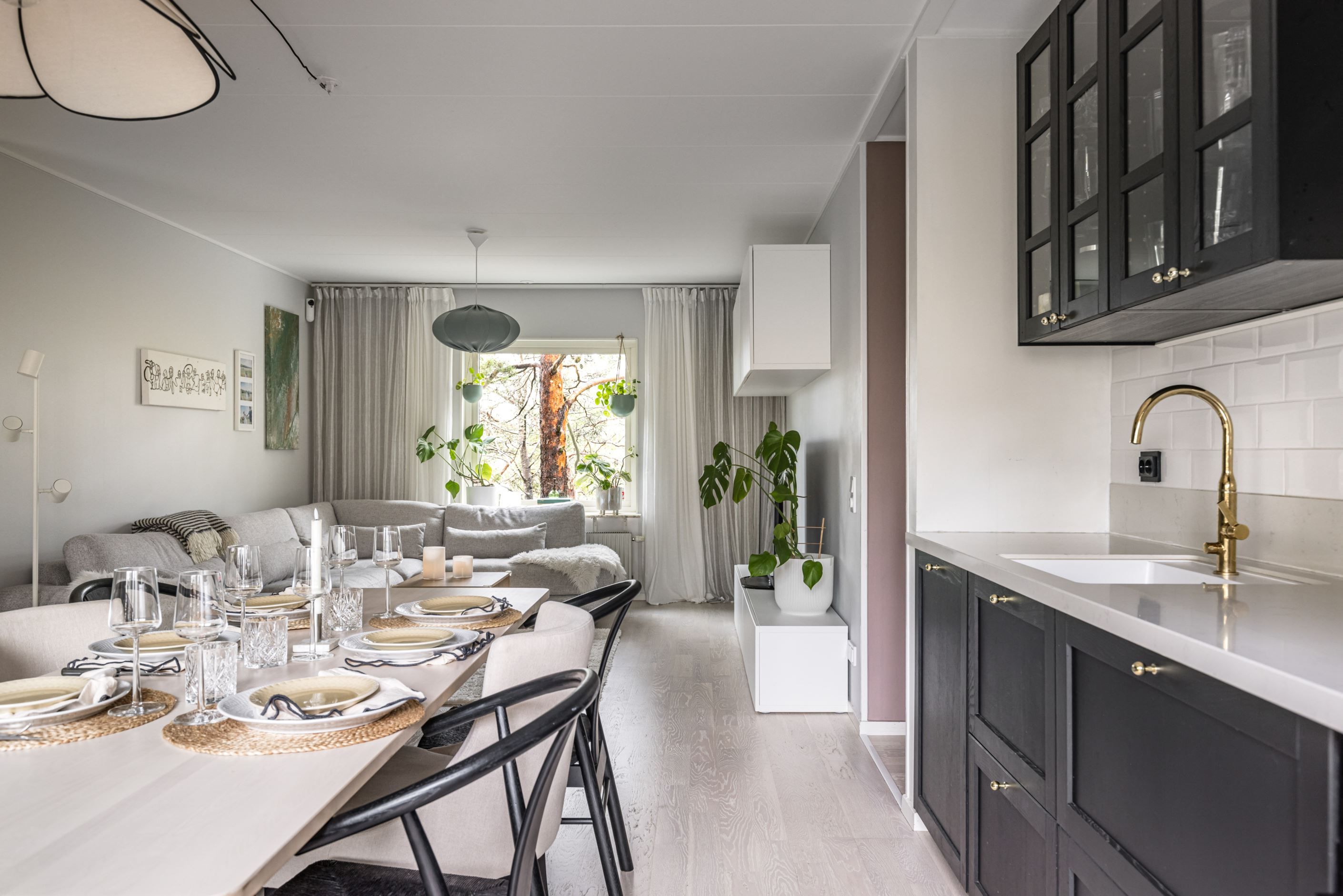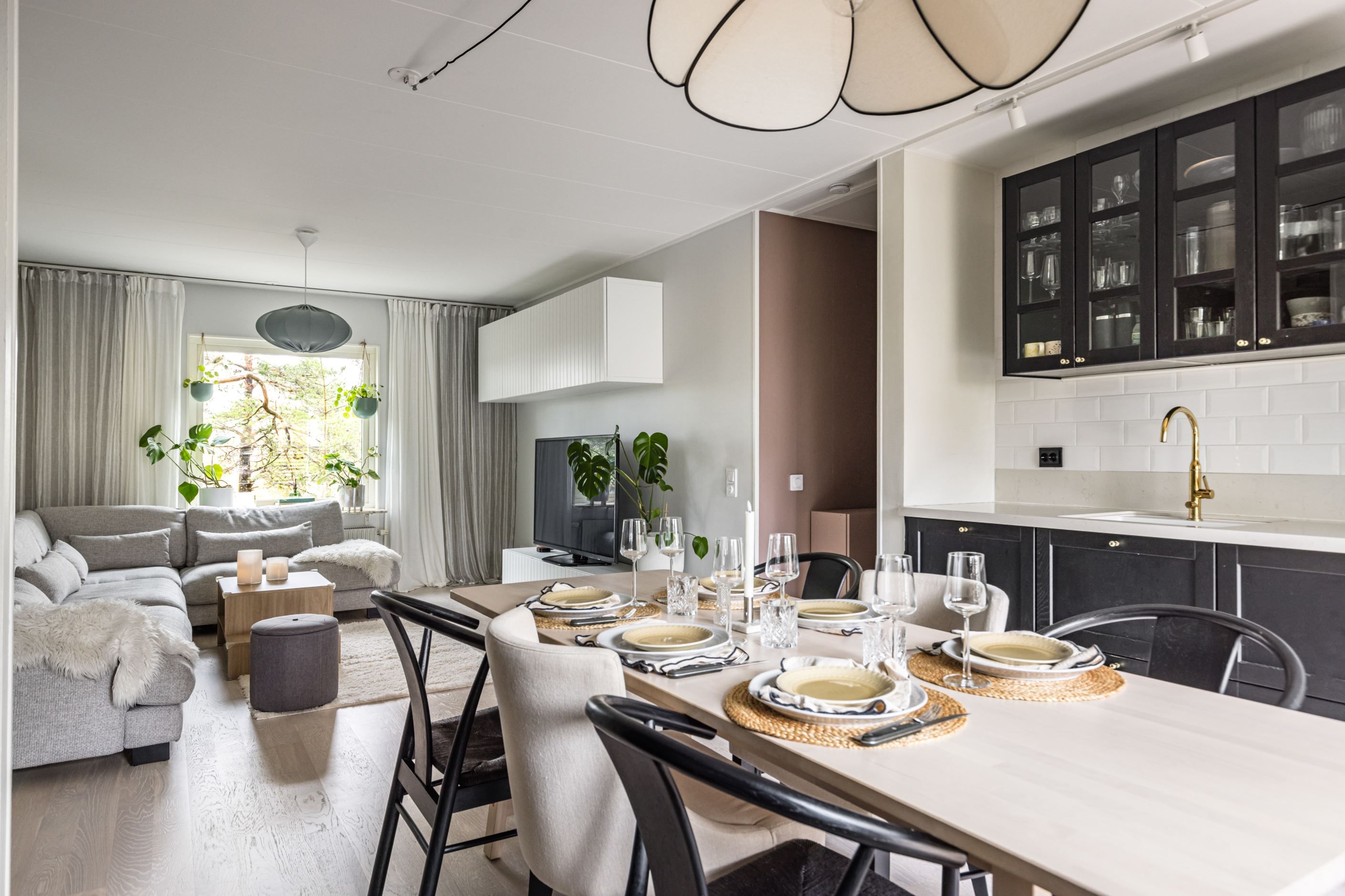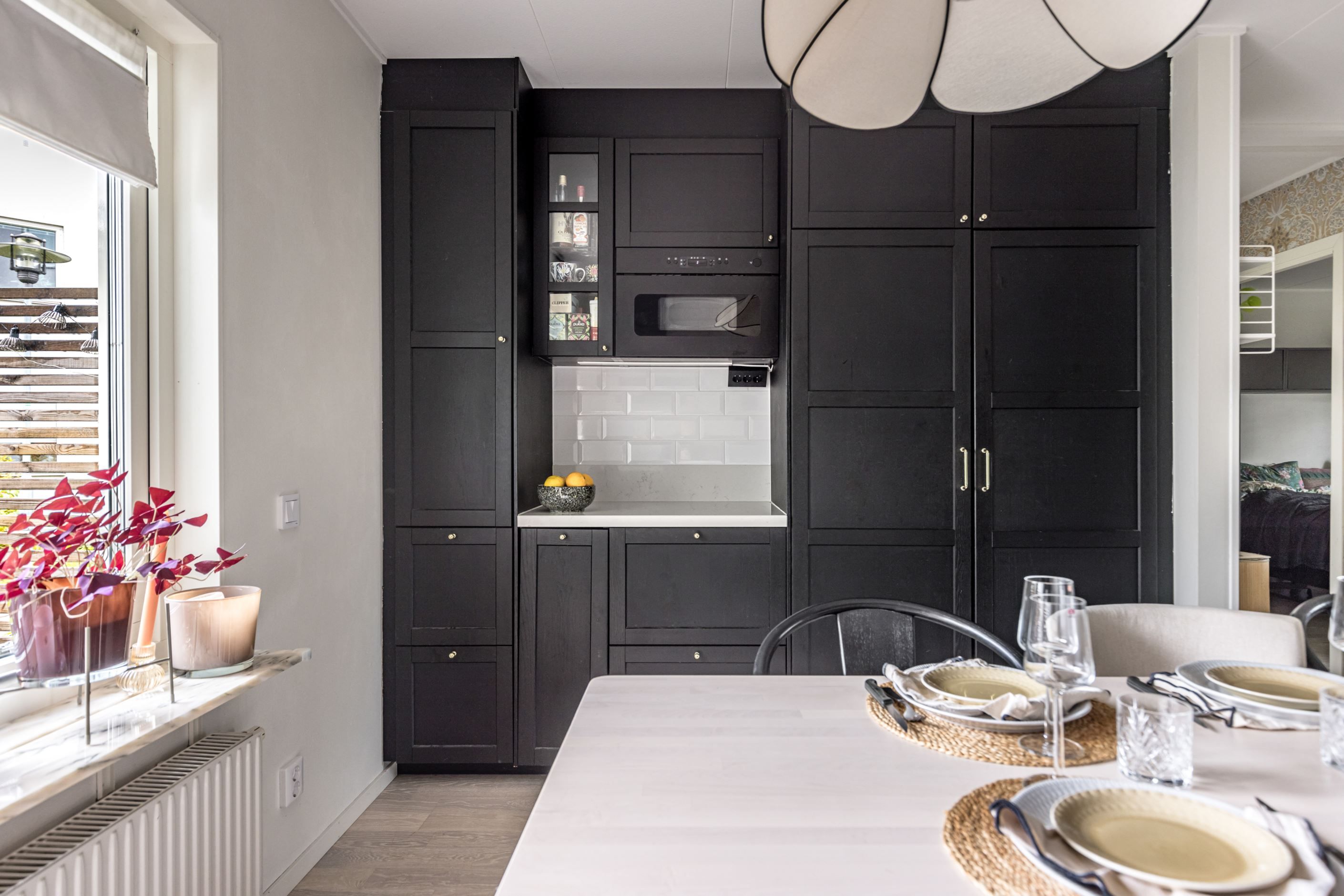 Ni stiger in i bostaden genom den inbjudande hallen med goda förvaringsmöjligheter. Från hallen nås det stilrena, helkaklade badrummet som totalrenoverades 2024 och är utrustat med både tvättmaskin och torktumlare. Vidare in öppnar bostaden upp sig med en luftig och social planlösning mellan vardagsrum och det elegant utformade köket. Köket är fullt utrustat och inrett med svarta fanerade luckor som snyggt kombineras med en exklusiv bänkskiva i kompositsten och en stor vit underfräst diskho. Här finns flera detaljer att uppskatta – som vackra vitrinluckor och en charmig kaffehörna vid högskåpen. Matplatsen rymmer med lätthet ett större bord för 6–8 personer, perfekt för middagar med familj och vänner. Från köket nås den trivsamma uteplatsen i västläge, som erbjuder plats för både sittgrupp och växter.