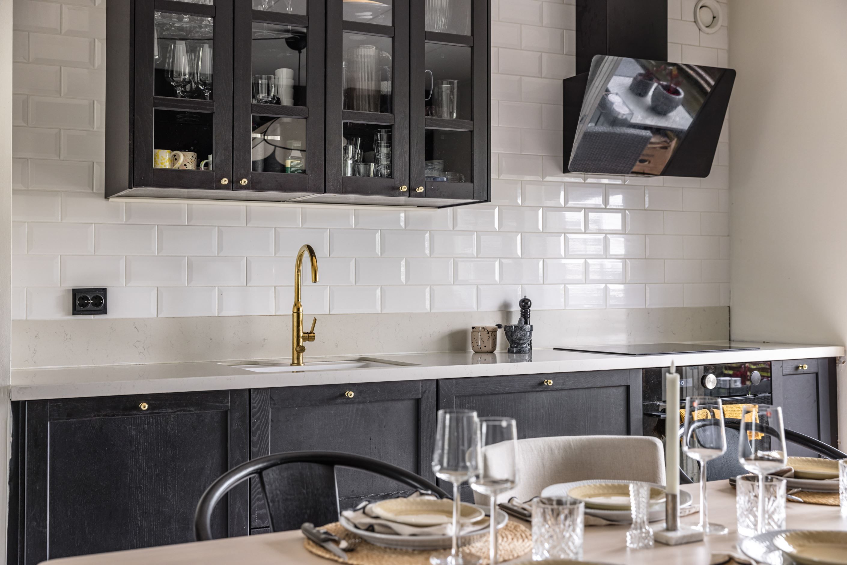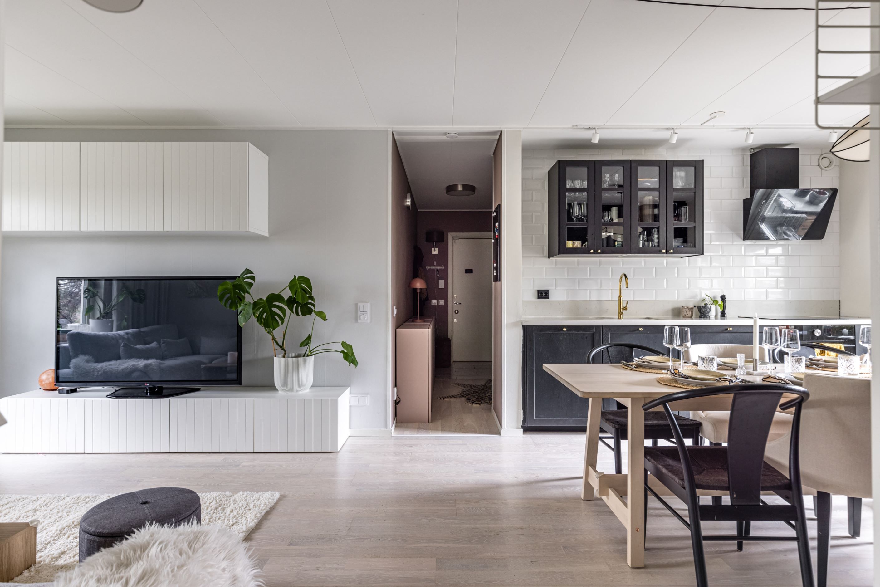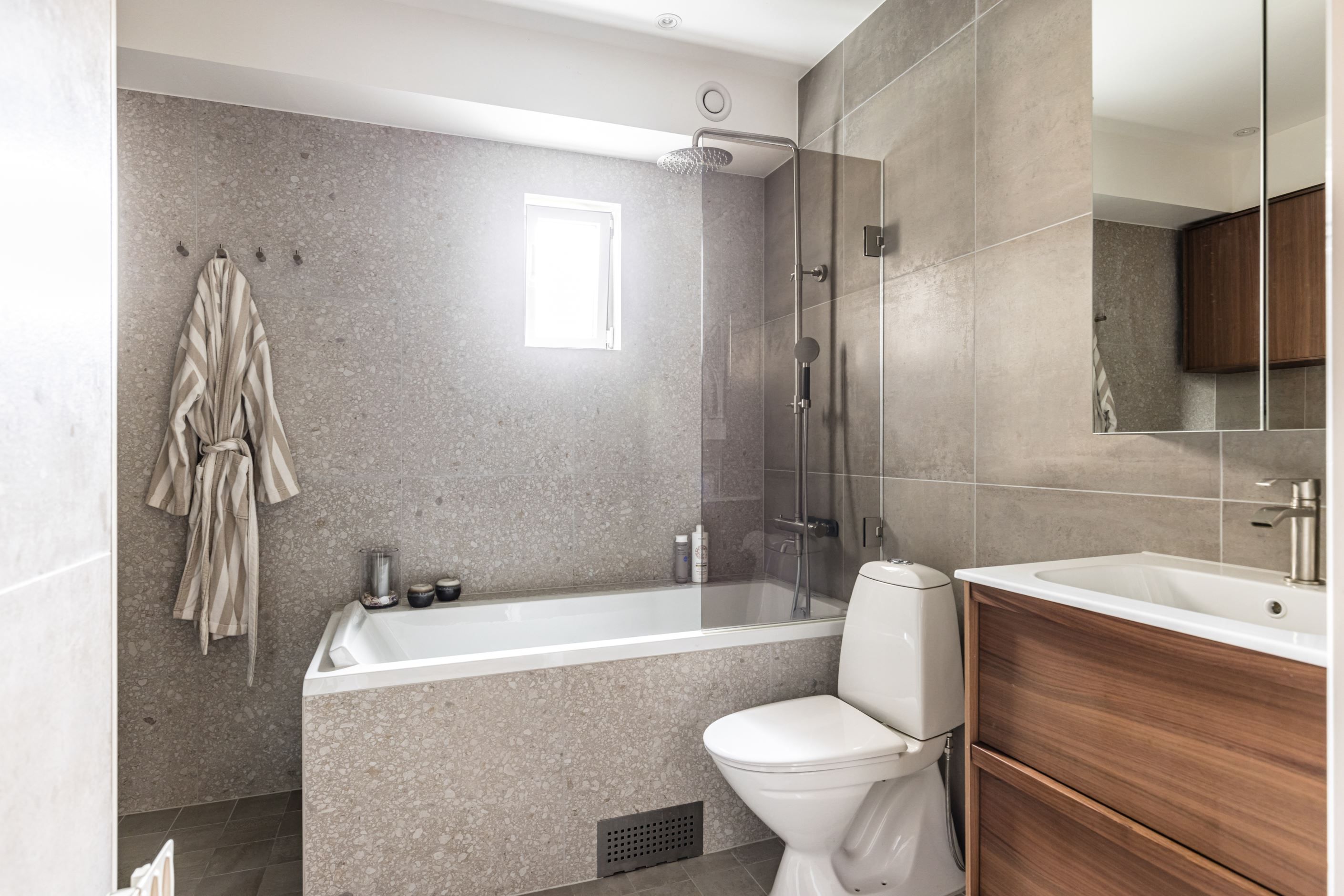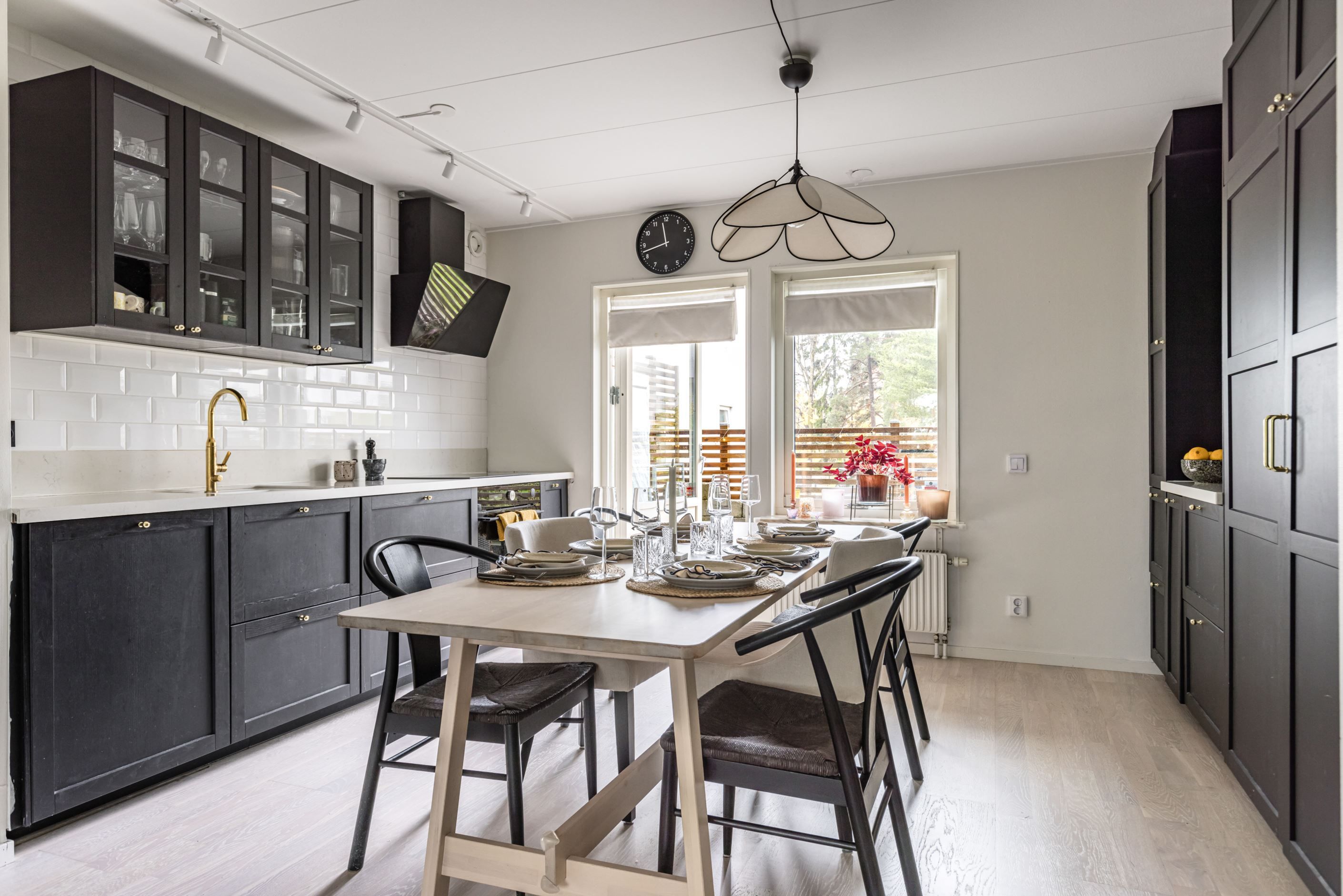 Ni stiger in i bostaden genom den inbjudande hallen med goda förvaringsmöjligheter. Från hallen nås det stilrena, helkaklade badrummet som totalrenoverades 2024 och är utrustat med både tvättmaskin och torktumlare. Vidare in öppnar bostaden upp sig med en luftig och social planlösning mellan vardagsrum och det elegant utformade köket. Köket är fullt utrustat och inrett med svarta fanerade luckor som snyggt kombineras med en exklusiv bänkskiva i kompositsten och en stor vit underfräst diskho. Här finns flera detaljer att uppskatta – som vackra vitrinluckor och en charmig kaffehörna vid högskåpen. Matplatsen rymmer med lätthet ett större bord för 6–8 personer, perfekt för middagar med familj och vänner. Från köket nås den trivsamma uteplatsen i västläge, som erbjuder plats för både sittgrupp och växter.