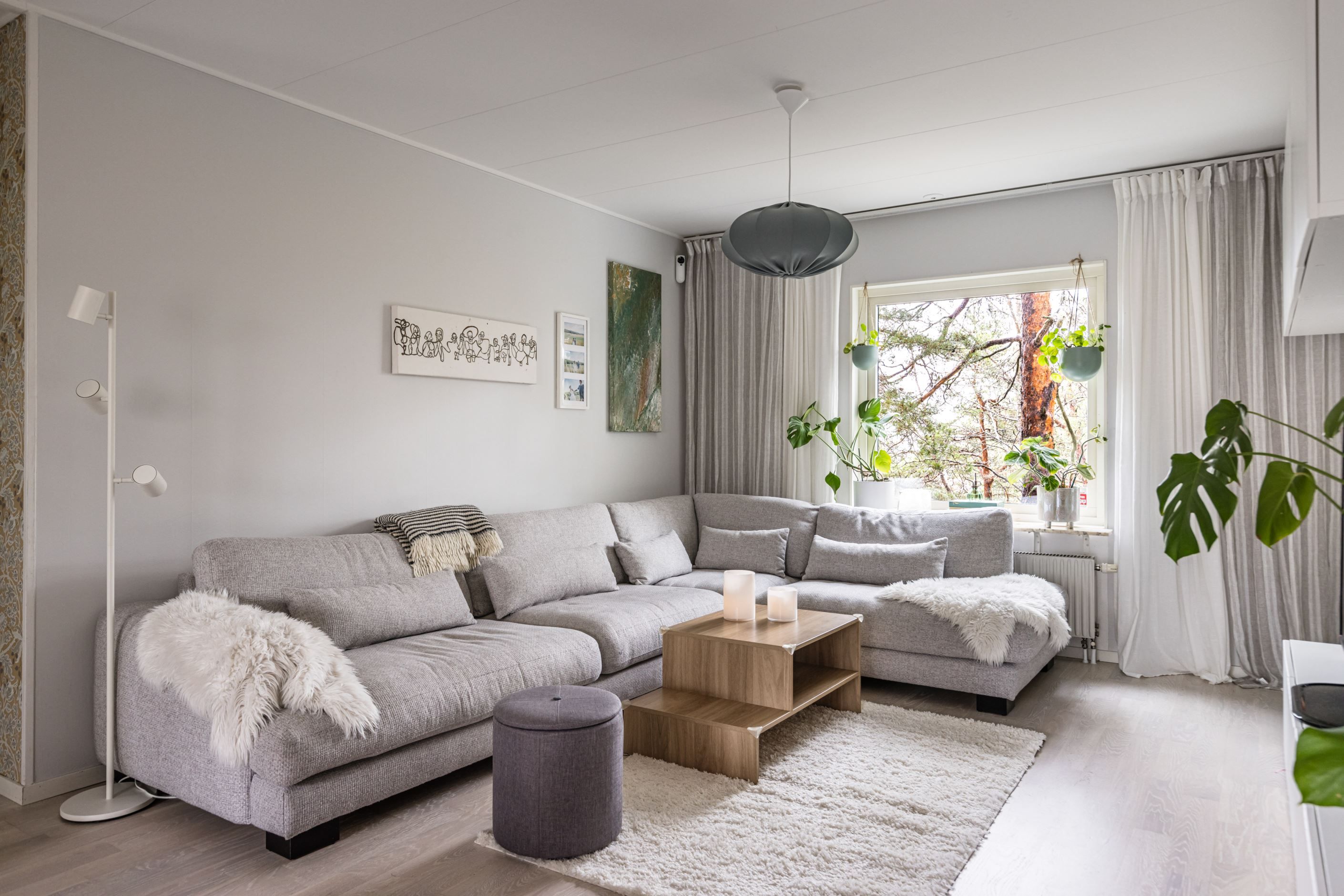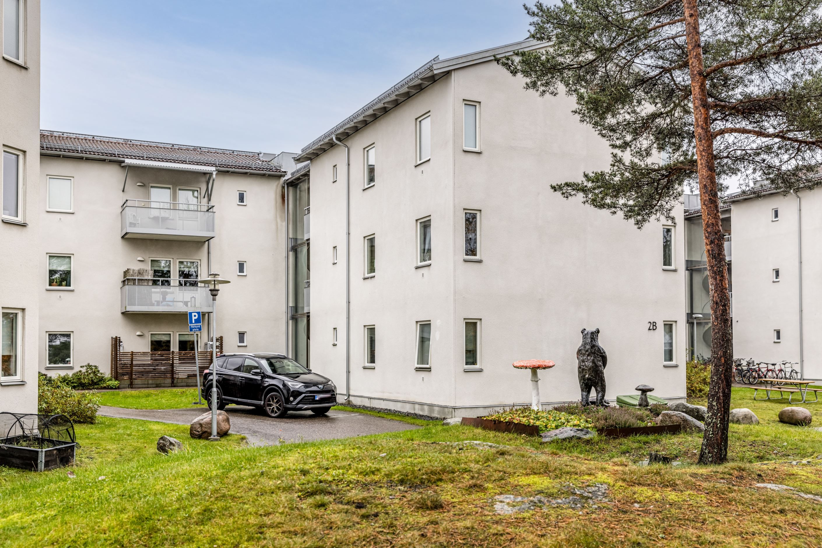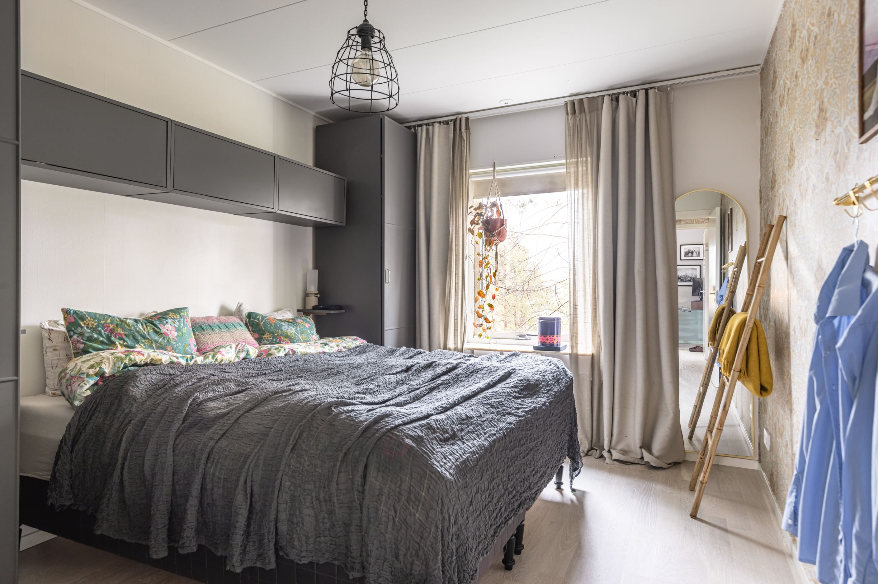Det inbjudande vardagsrummet skapar en härlig plats för umgänge och har gott om plats för soffa och tv-möbel. Ett stort fönsterparti med rofylld utsikt över grönska ger ett generöst ljusinsläpp. Bostadens två lättmöblerade sovrum rymmer båda dubbelsäng, förvaring och övrigt möblemang. Det mindre sovrummet lämpar sig utmärkt som barnrum, gästrum eller hemmakontor. Mellan rummen finns dessutom en praktisk klädkammare.