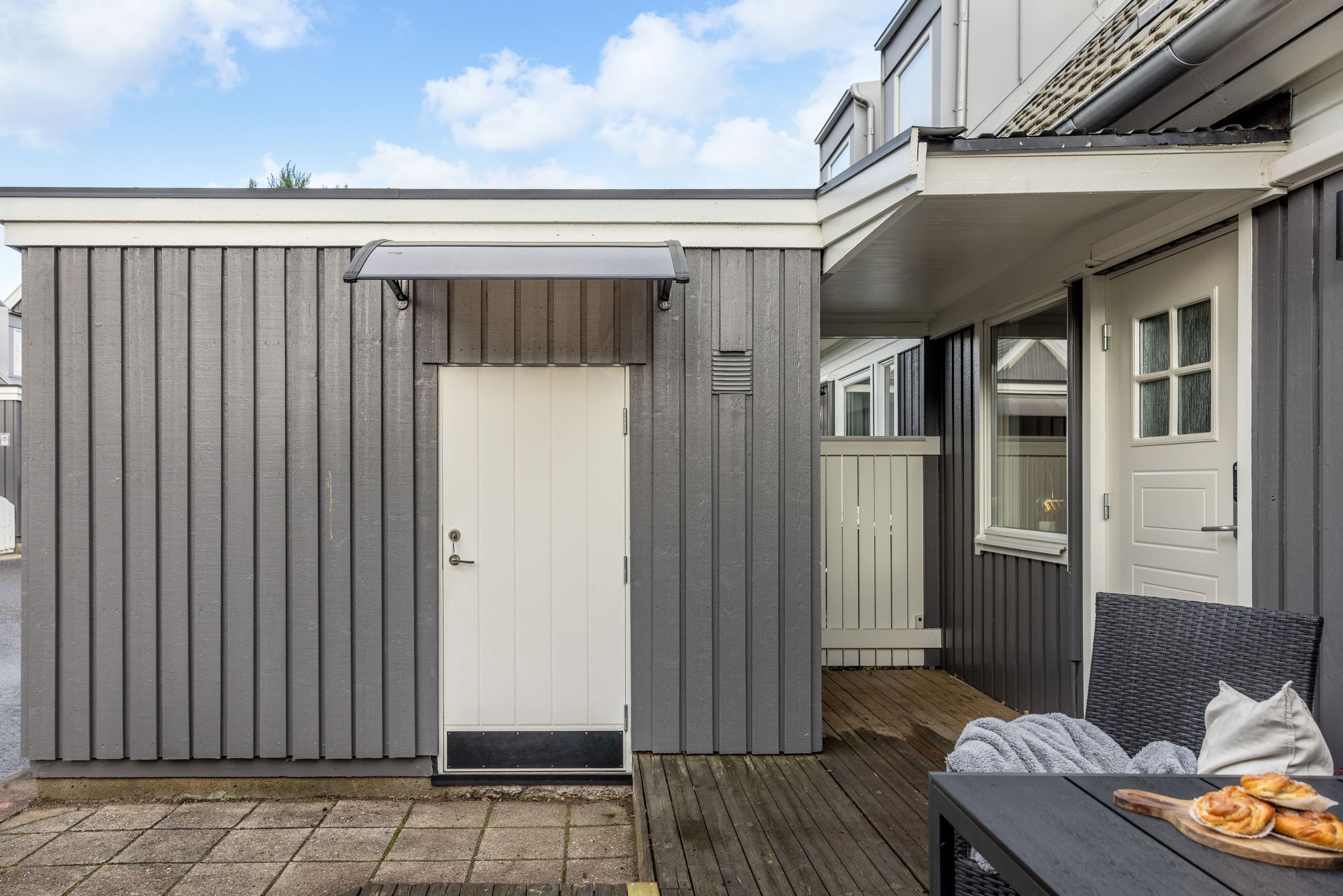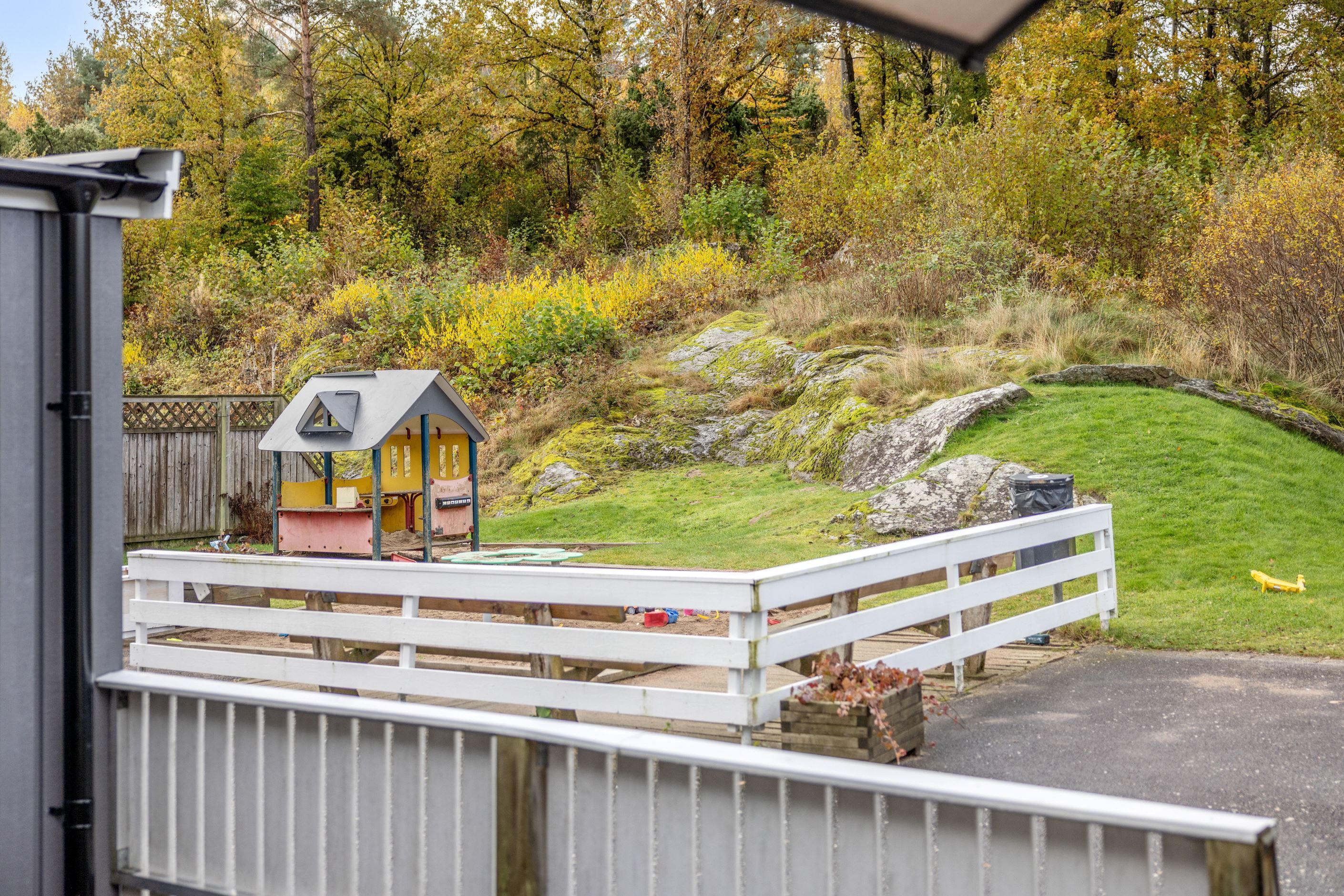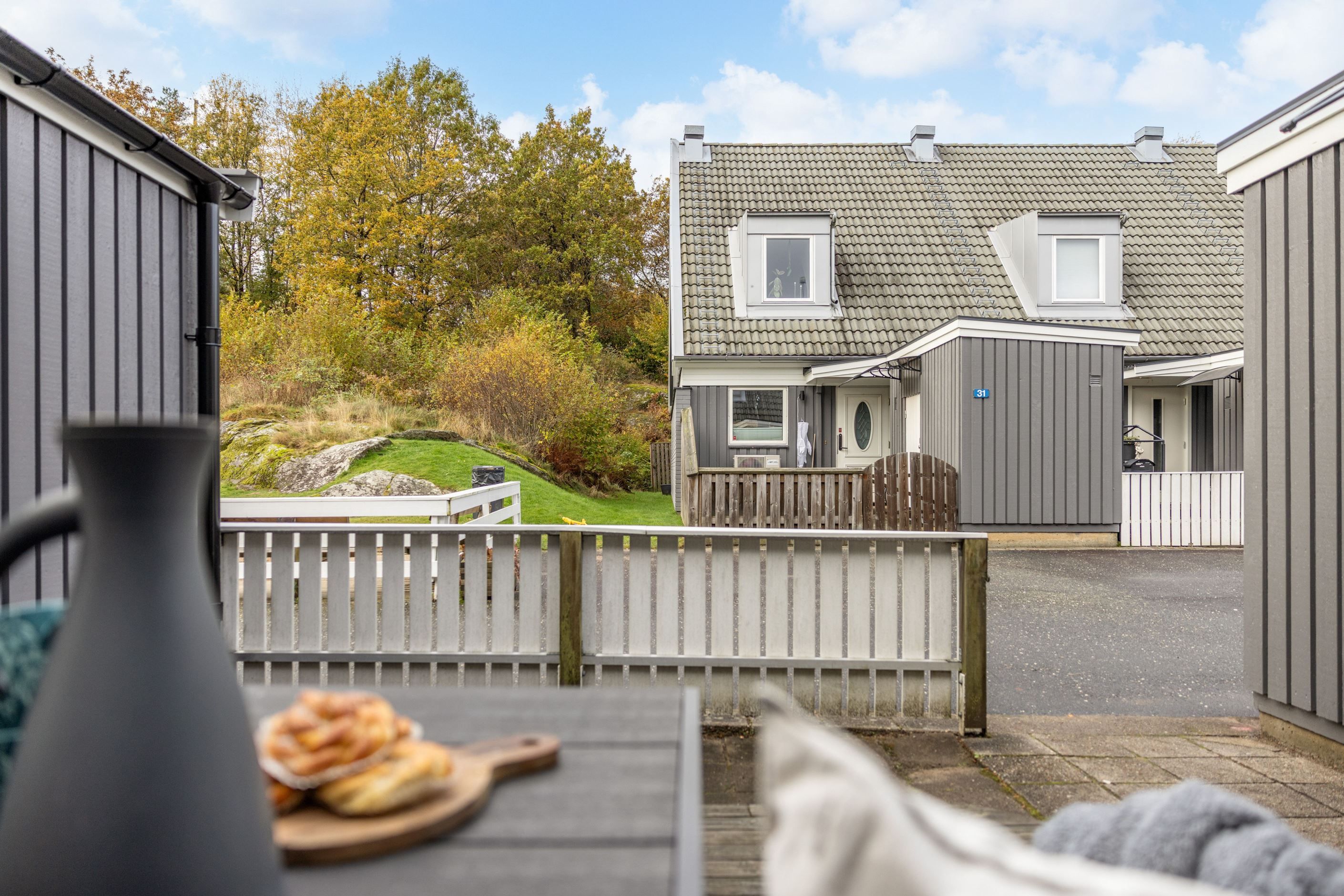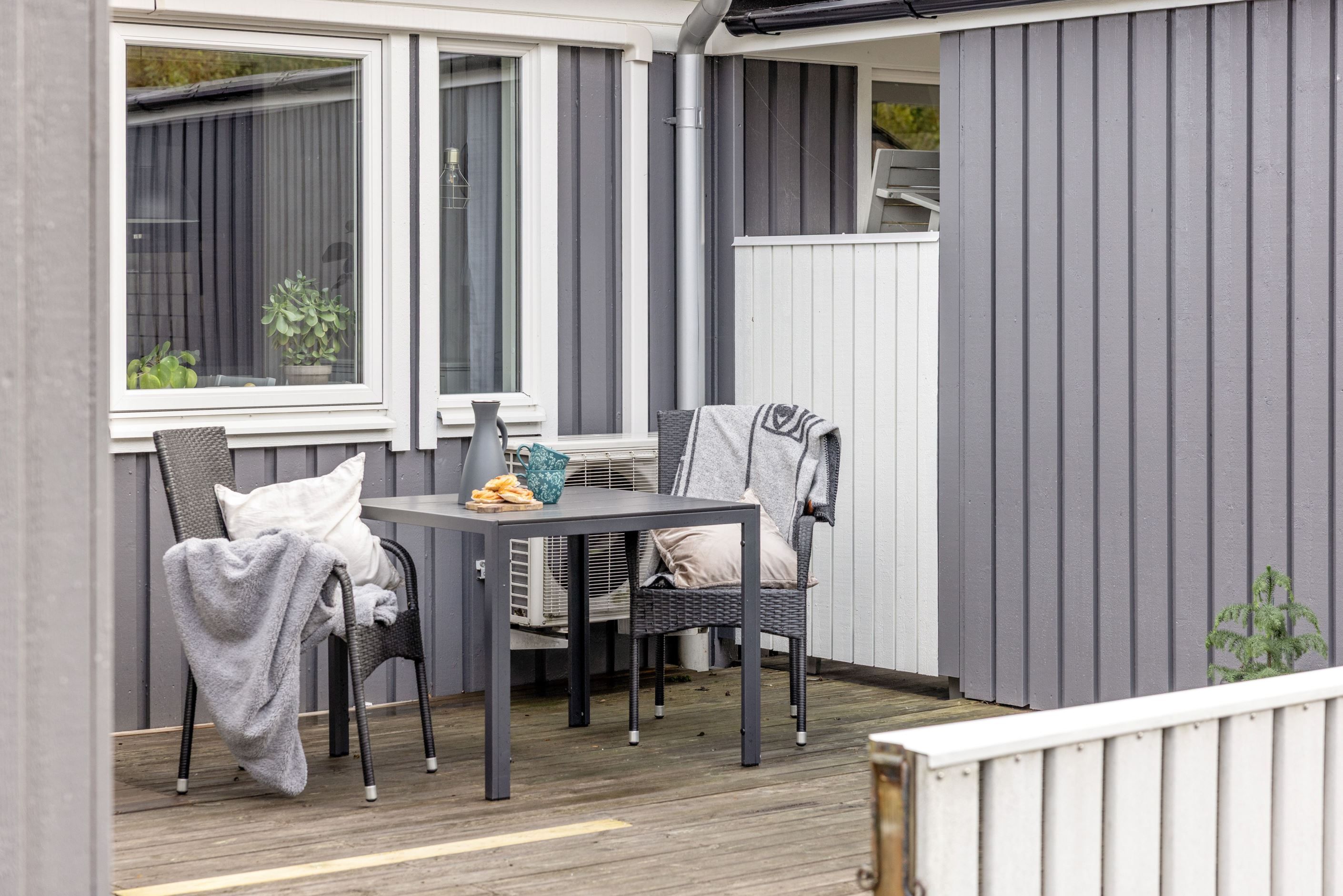 Utomhus njuter du av sol från morgon till kväll. Med altan på både fram- och baksida. Precis utanför huset finns dessutom en lekplats, så barnen kan leka tryggt medan du håller uppsikt från altanen.