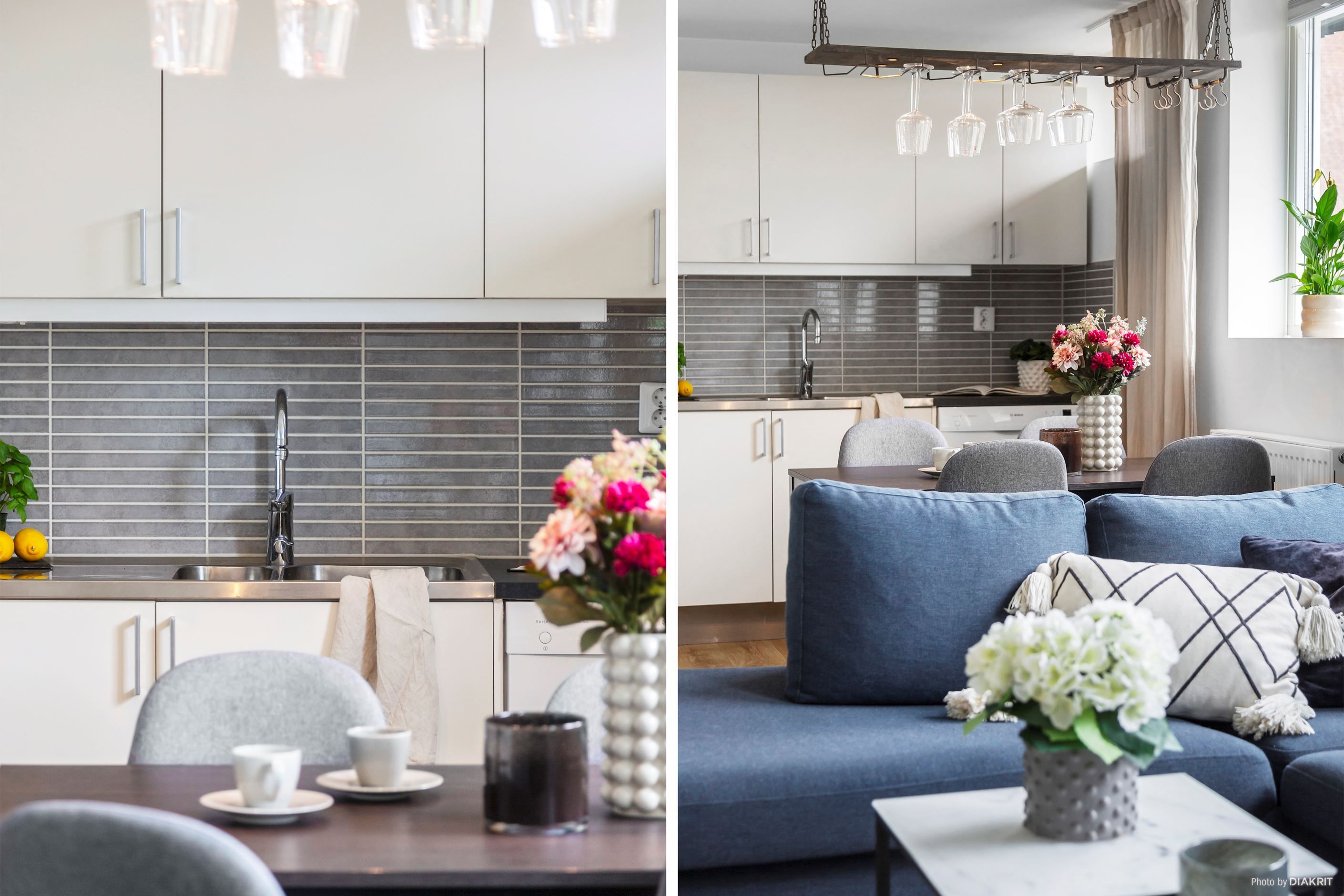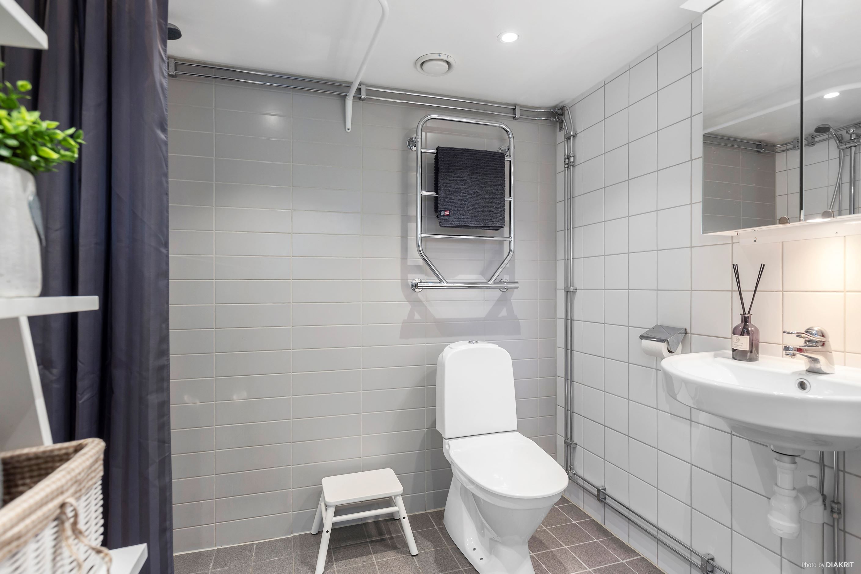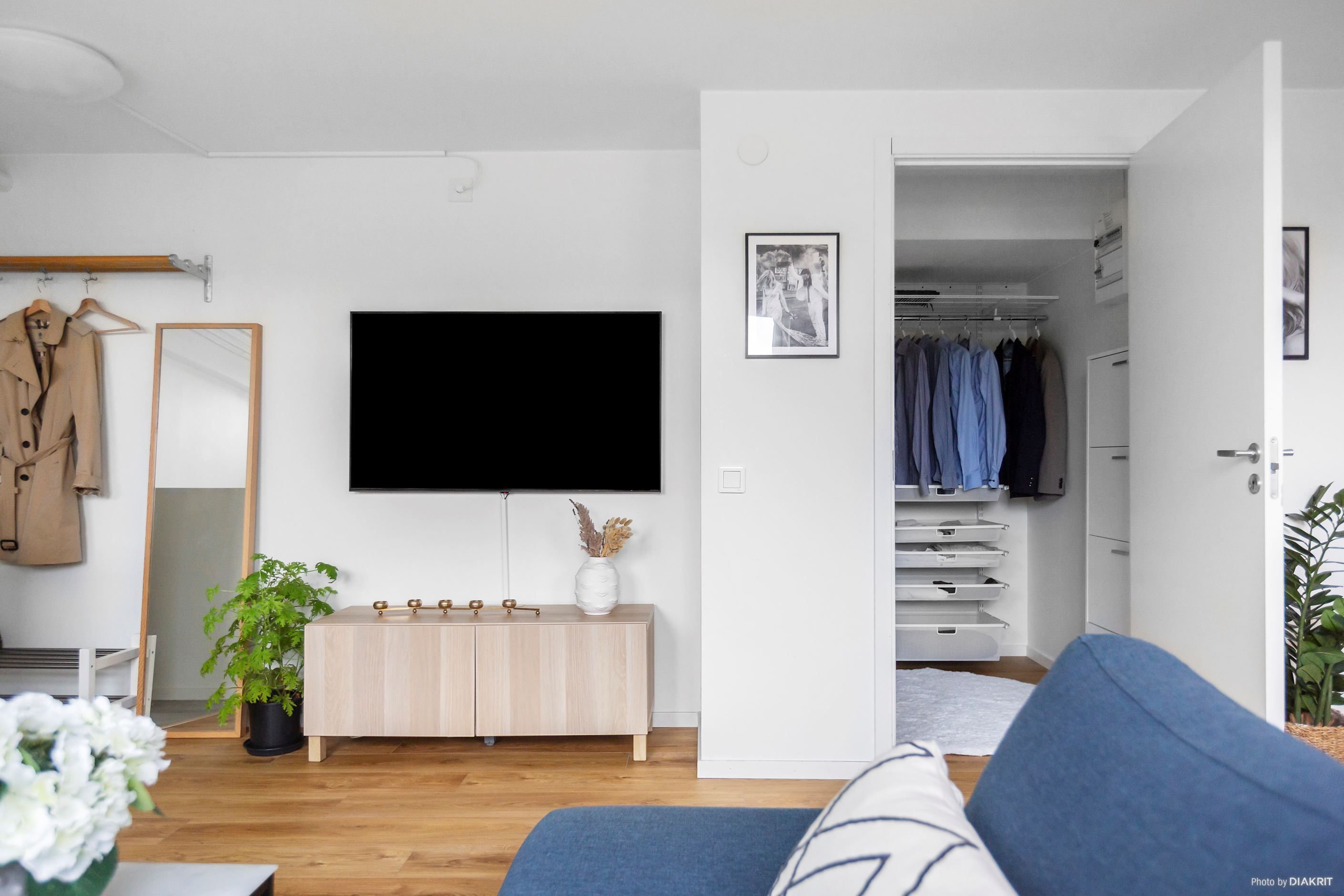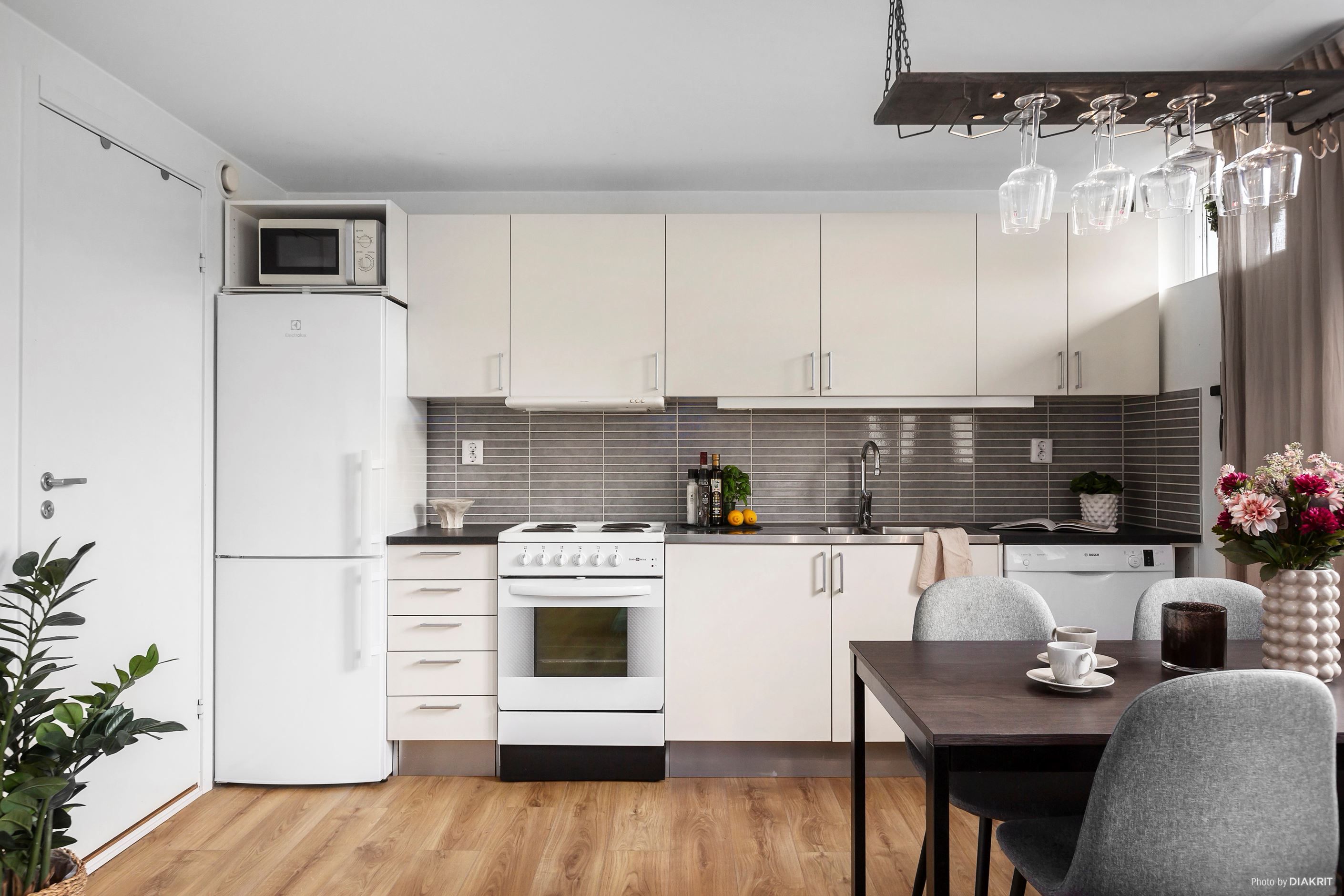 Det ljusa köket, som har plats för ett matbord vid fönstret, ligger i öppen anslutning till rummet och skapar en trivsam miljö för både matlagning och umgänge. Köket är utrustat med en kombinerad kyl och frys, spis, ugn och vardagslyx med diskmaskin! Tack vare den sömlösa övergången till vardagsrumsdelen så kan du mingla med gästerna medan middagen tillagas. Sängen placeras med fördel längst bort från köket, intill hallen. Badrummet är helkaklat i grått och vitt, utrustat med WC, handfat och dusch. I lägenheten finns också en praktisk klädkammare som underlättar förvaringen.