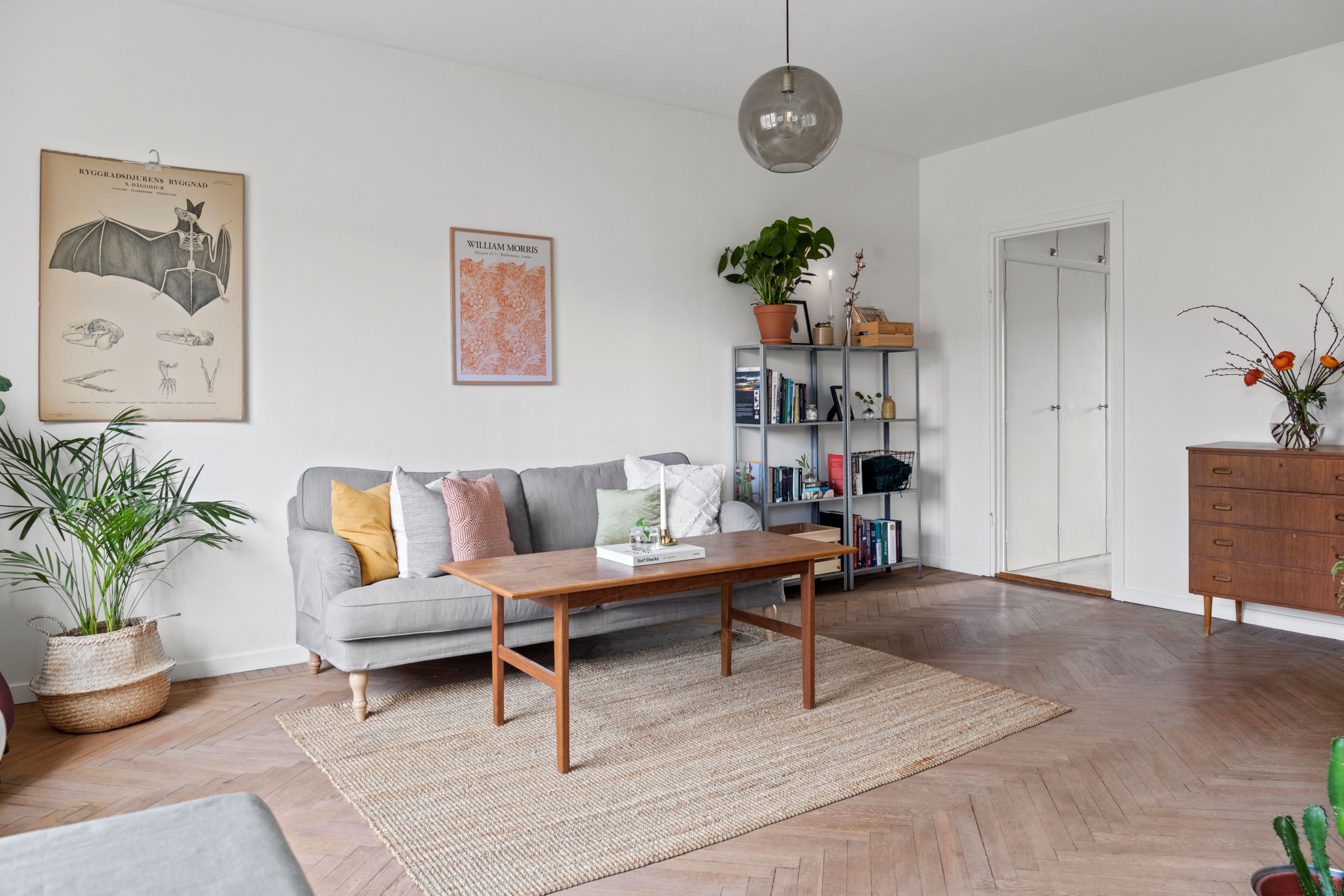 Bostaden har delvis öppen planlösning mellan kök och vardagsrum som ger härlig rymd och sociala ytor med möjlighet att ha många vänner över på middag. Köket har en bra kombination av originalskåp och nyare inredning. Rymligt sovrum med gott om plats för dubbelsäng och förvaring. Takhöjden i bostaden är ca 2,67 m. Bra förvaring i platsbyggda garderober och tillhörande förråd.