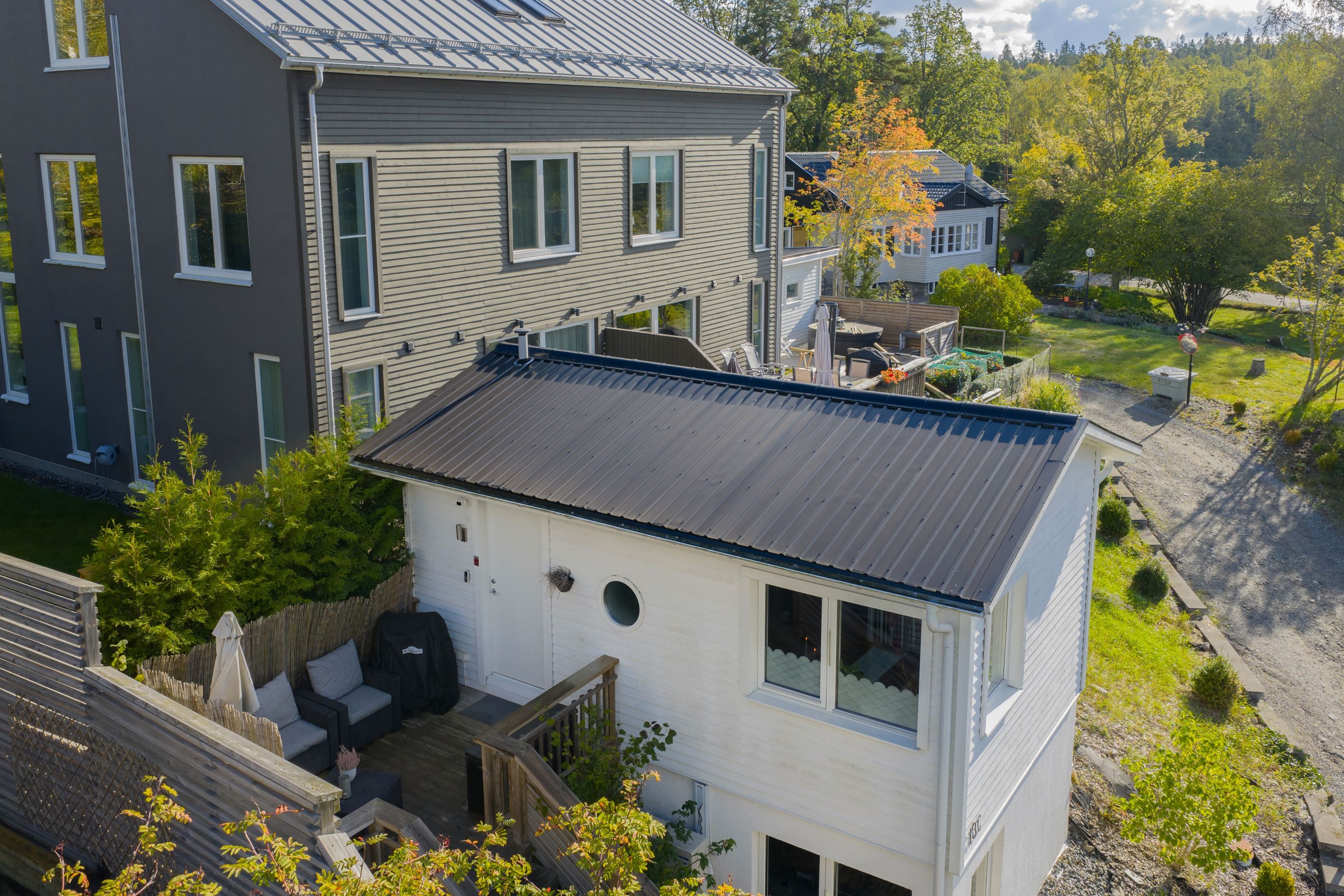 Bostaden har en egen trädäckad uppgång med trappbelysning och insynsskyddad uteplats.