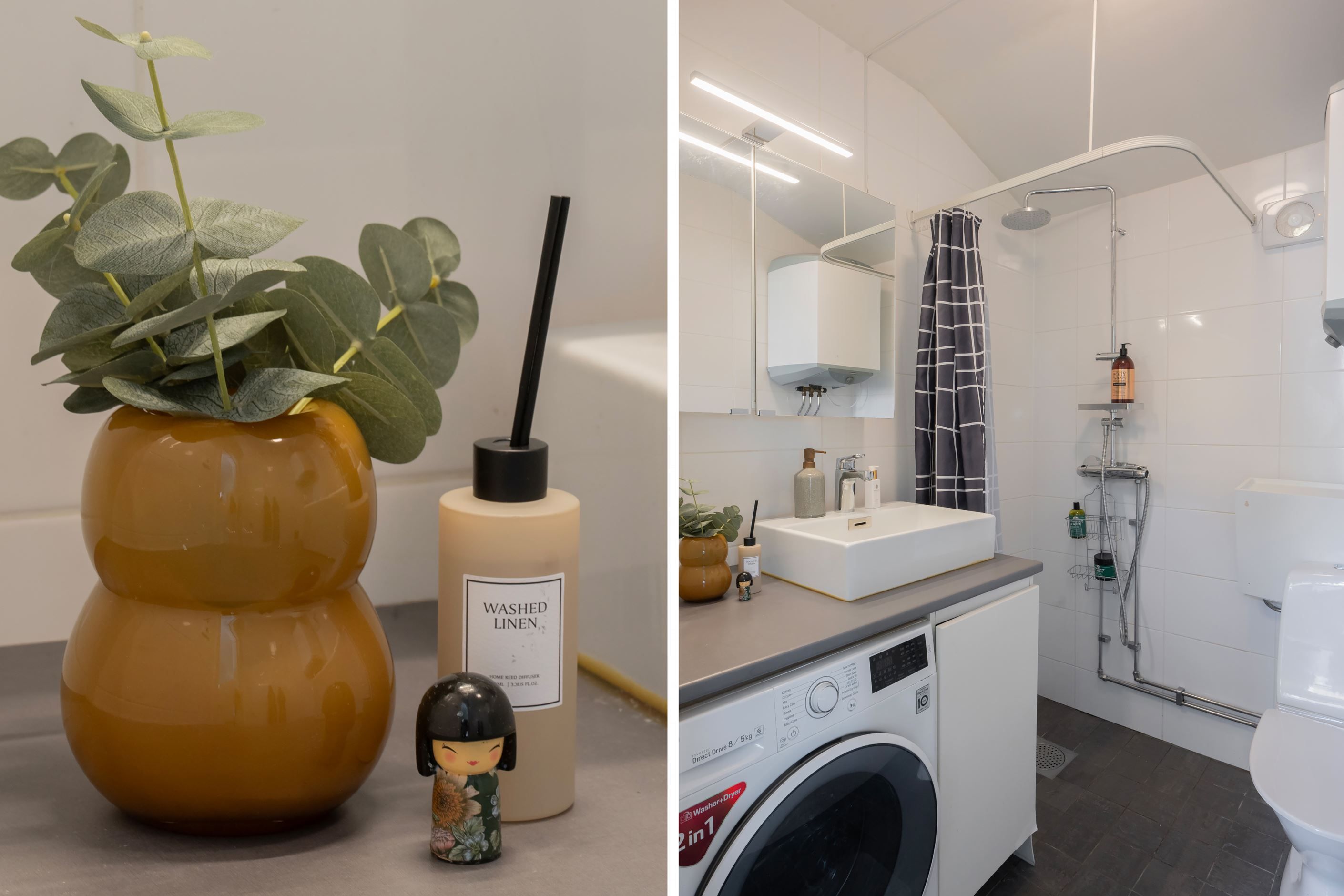 Det stilrena badrummet är helkaklat med dusch, golvvärme samt kombinerad tvätt-/torkmaskin. Det finns förvaringsutrymme främst vid entré och på nedre plan
