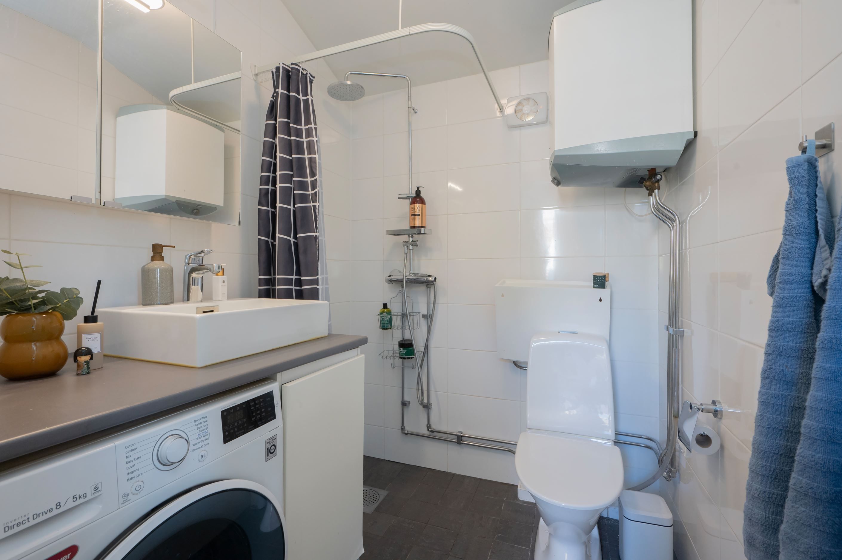 Helkaklat badrum med dusch och tvättutrustning