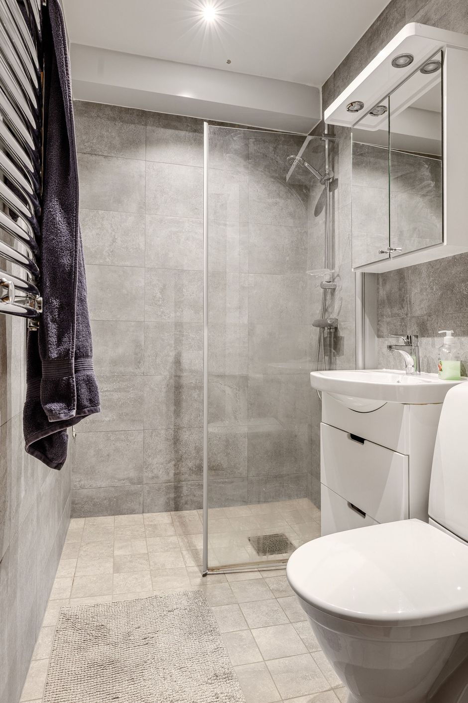 Läckert renoverat badrum med hotellkänsla. Här möts ni av kakel och klinkers i grå ton, glasvägg till dusch, kommod och spegelskåp. Dessutom handdukstork och spotlights i taket.