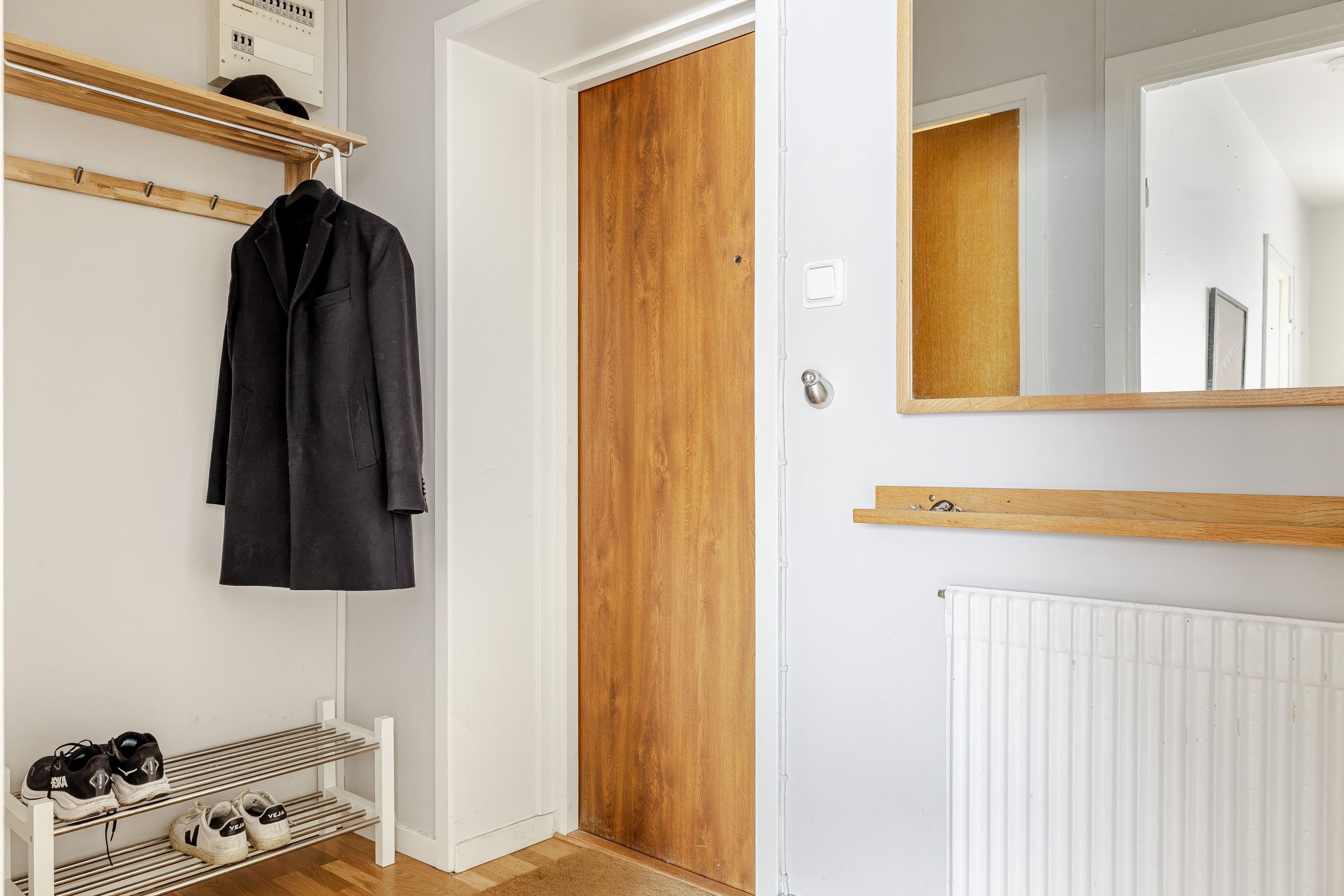 Entréhall med avhängningsdel och gott om förvaring. Ingång till badrum och vardagsrum.