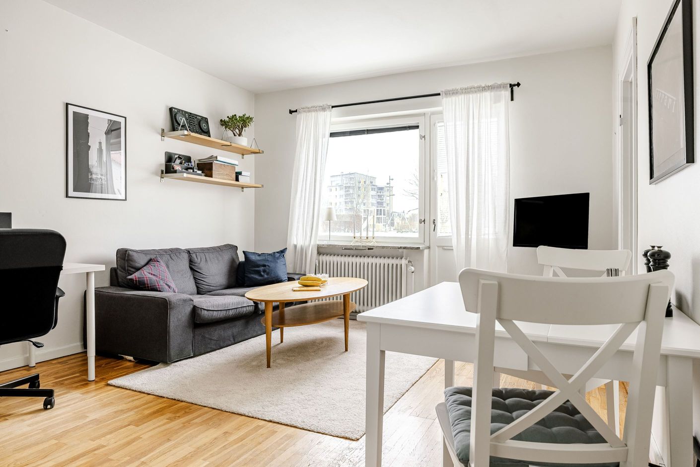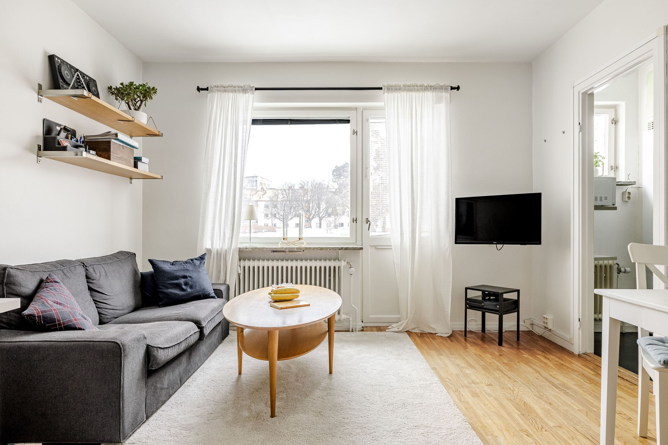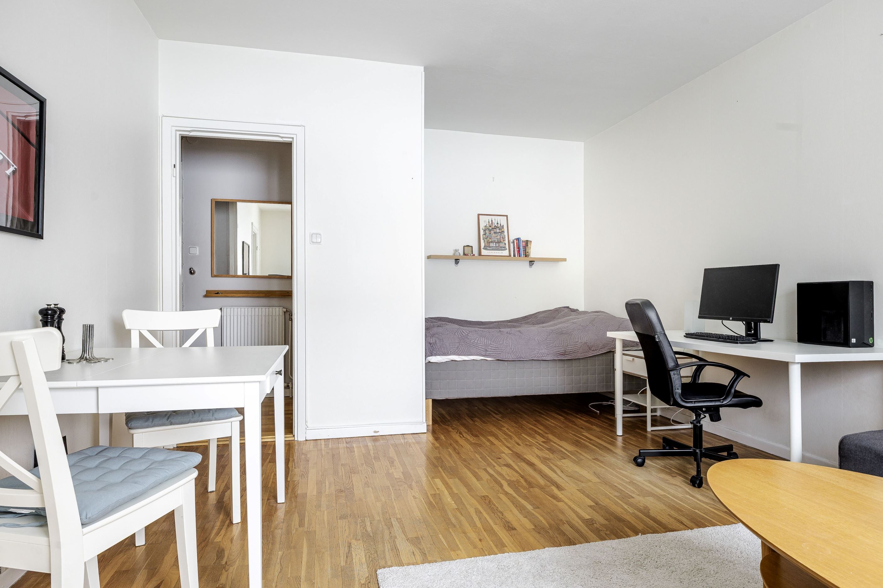 Ljust, rymligt vardagsrum med parkettgolv och sovalkov. Plats för soffa, skrivbord, säng och matbord.