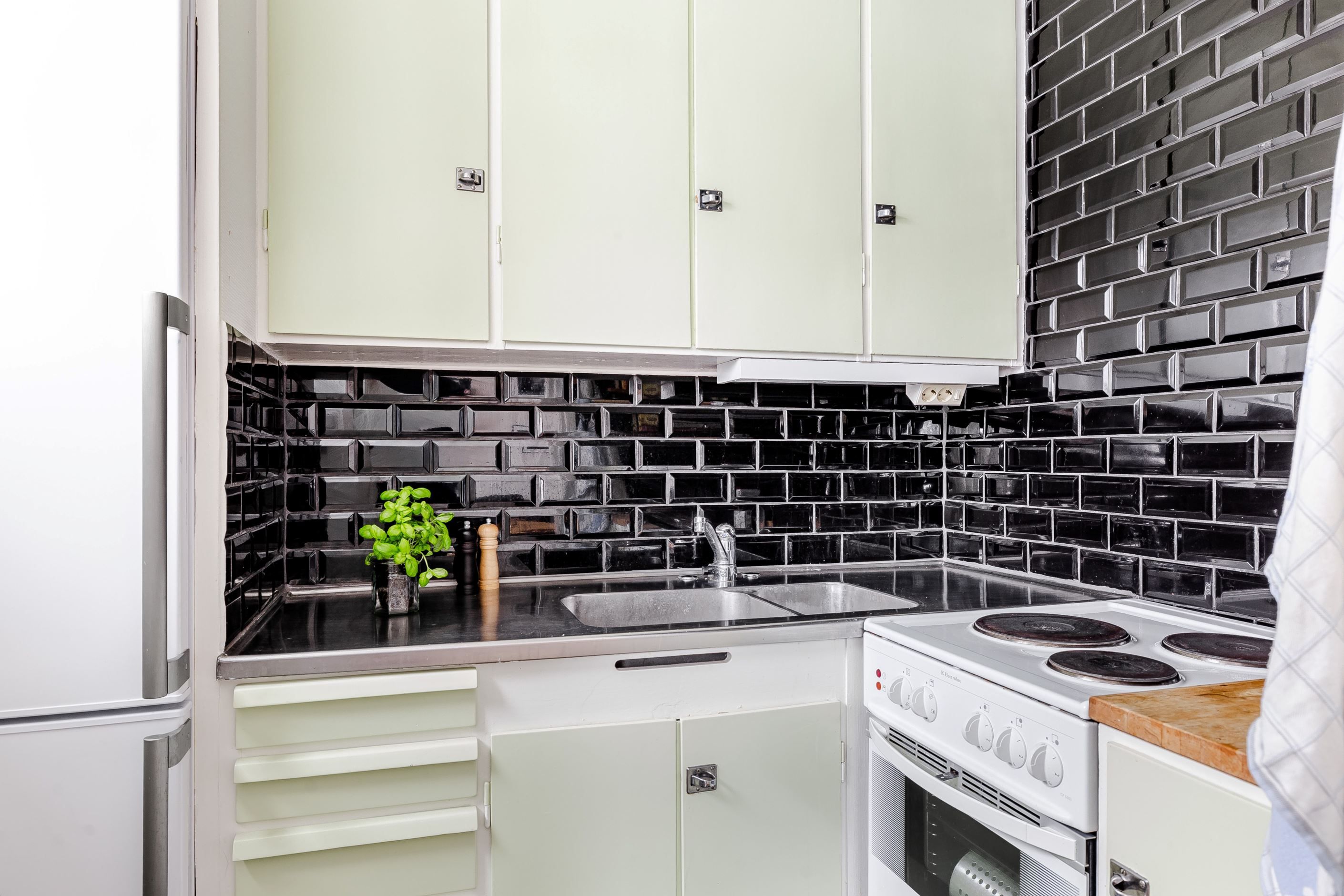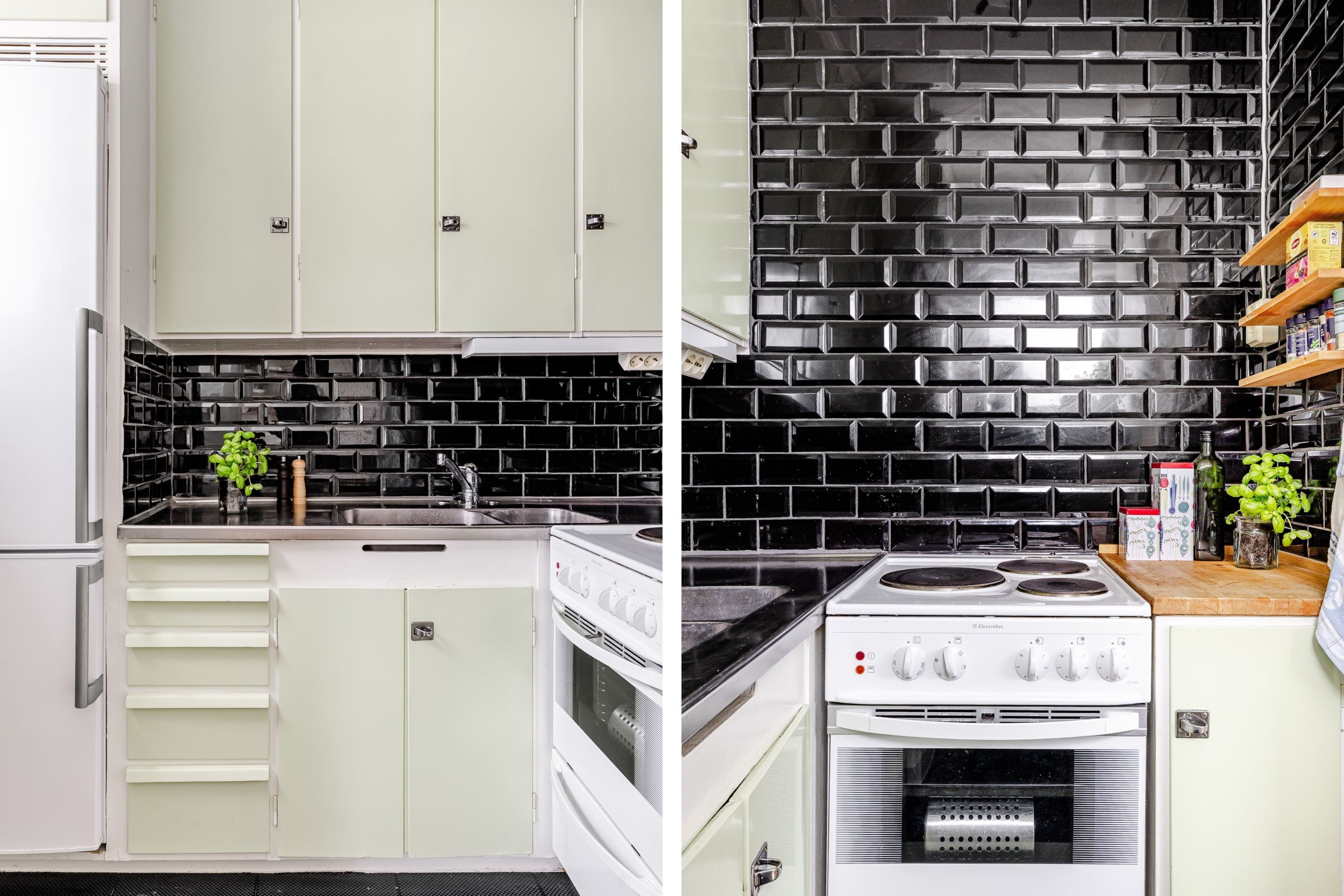 Kök med goda matlagningsmöjligheter, kyl/frys och spis/ugn. Snyggt och fräscht med svart kakel och ljusa luckor.