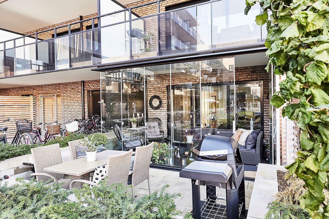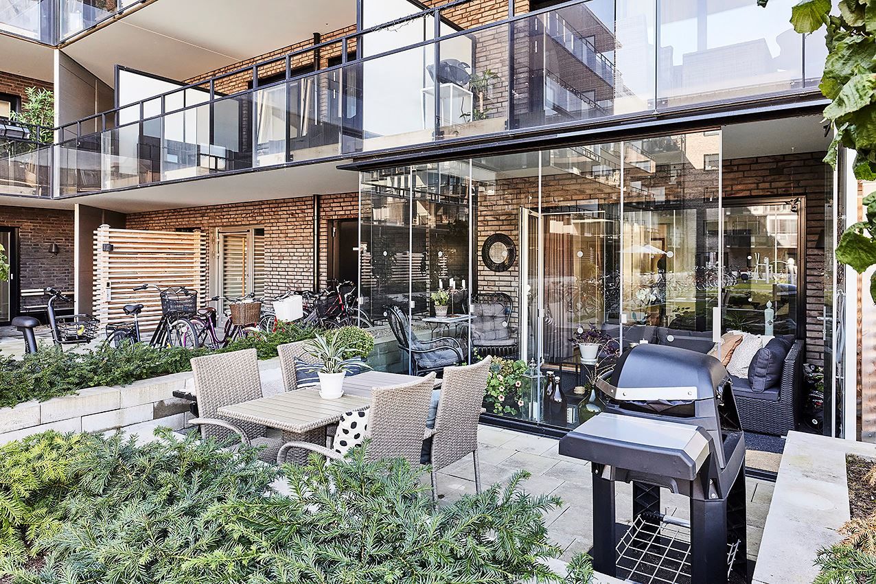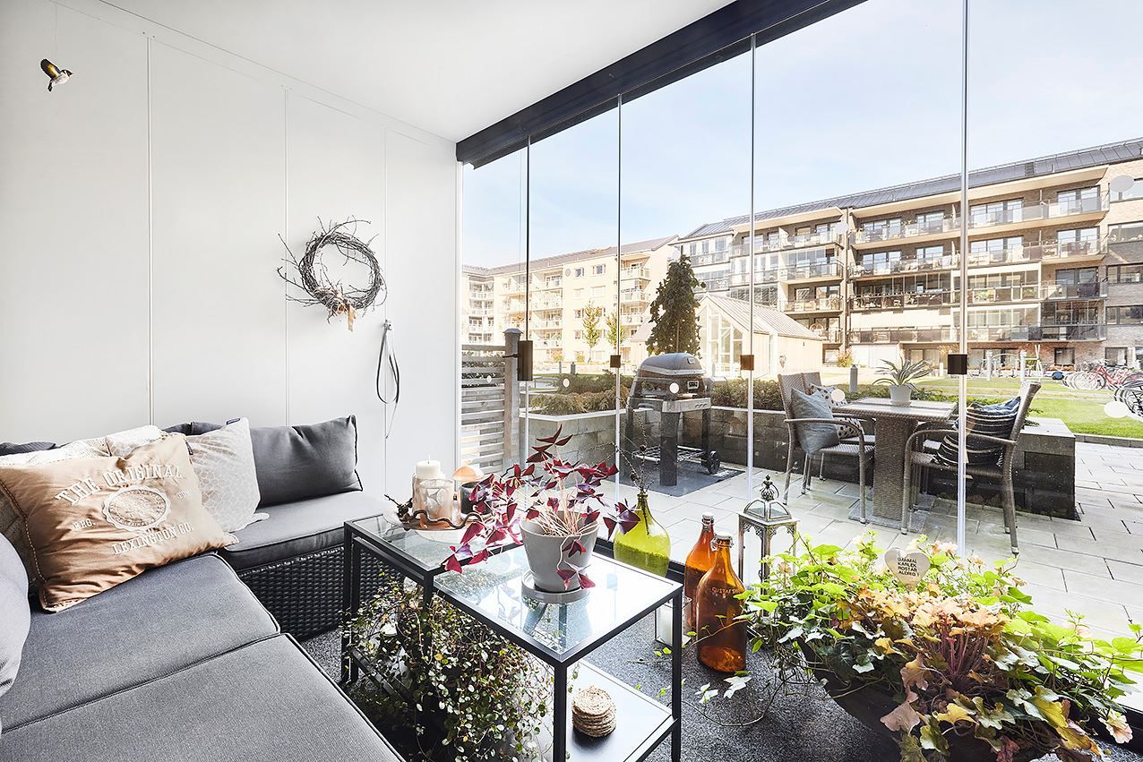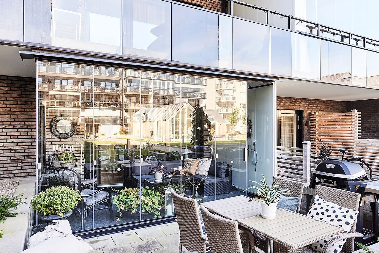 Inglasad balkong och uteplats mot innergårdsmiljön.