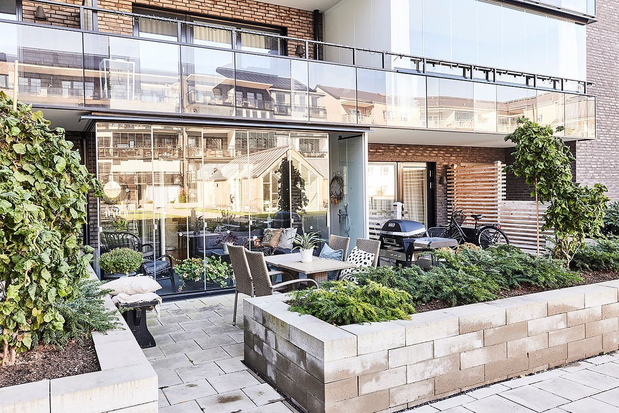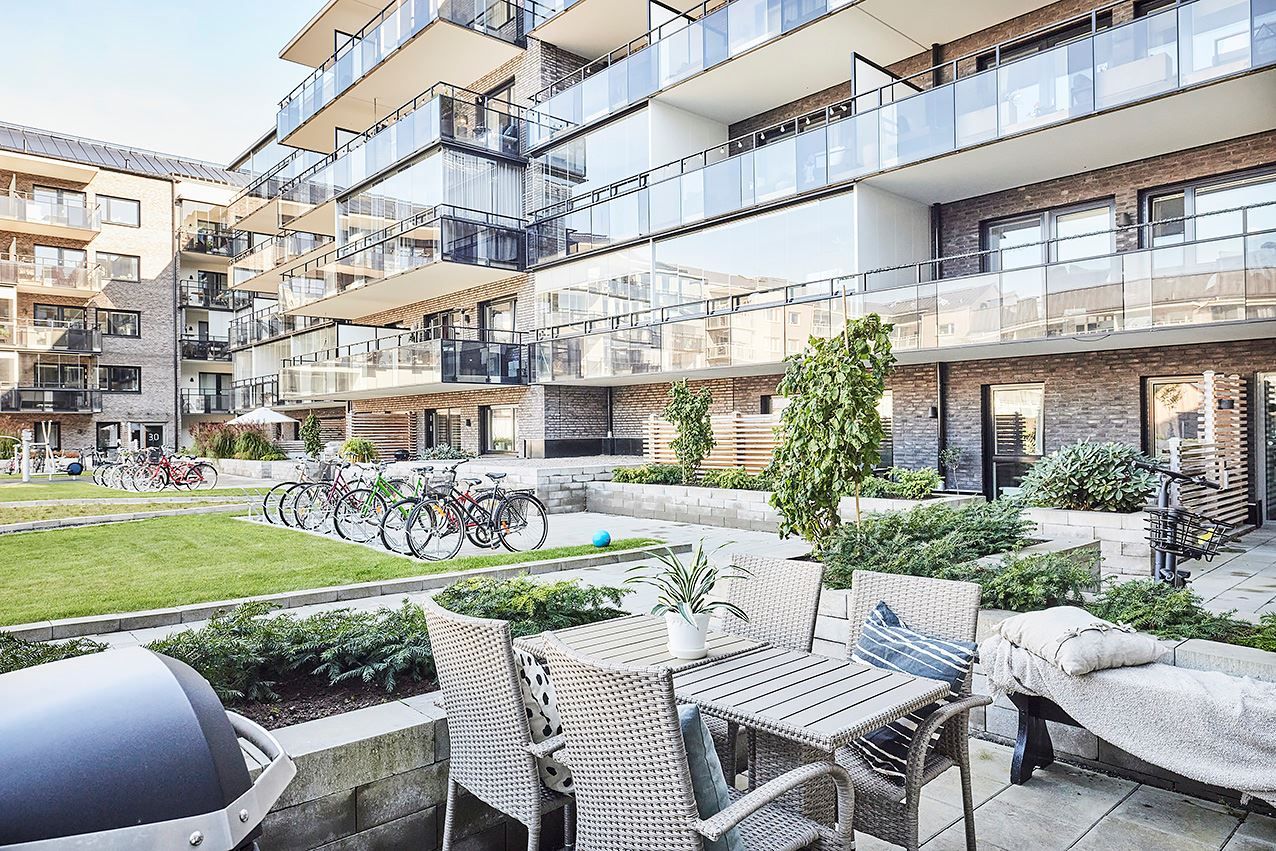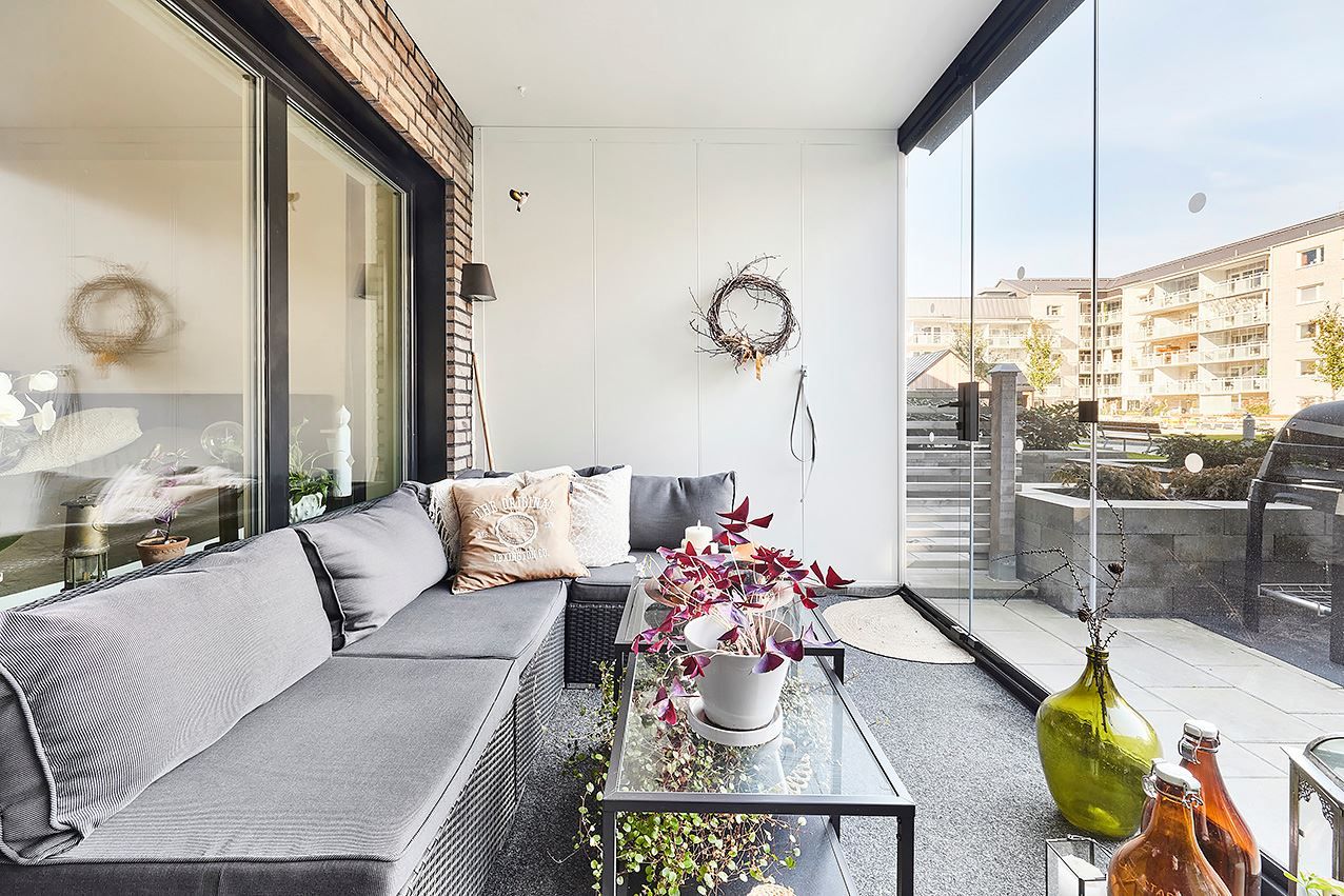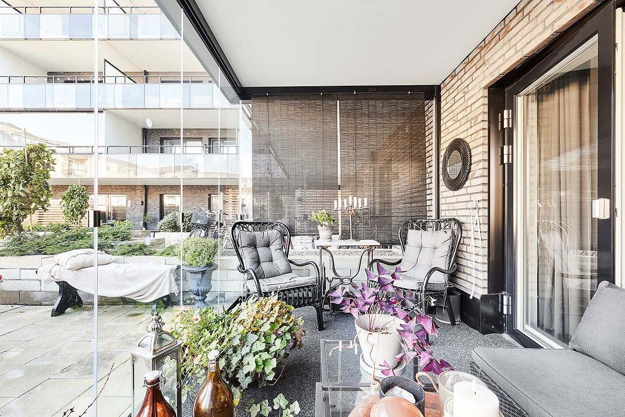 Inglasad balkong och uteplats mot innergårdsmiljön.