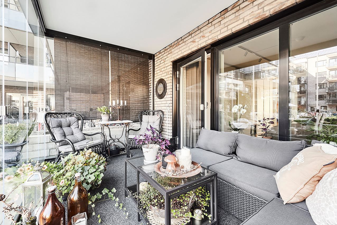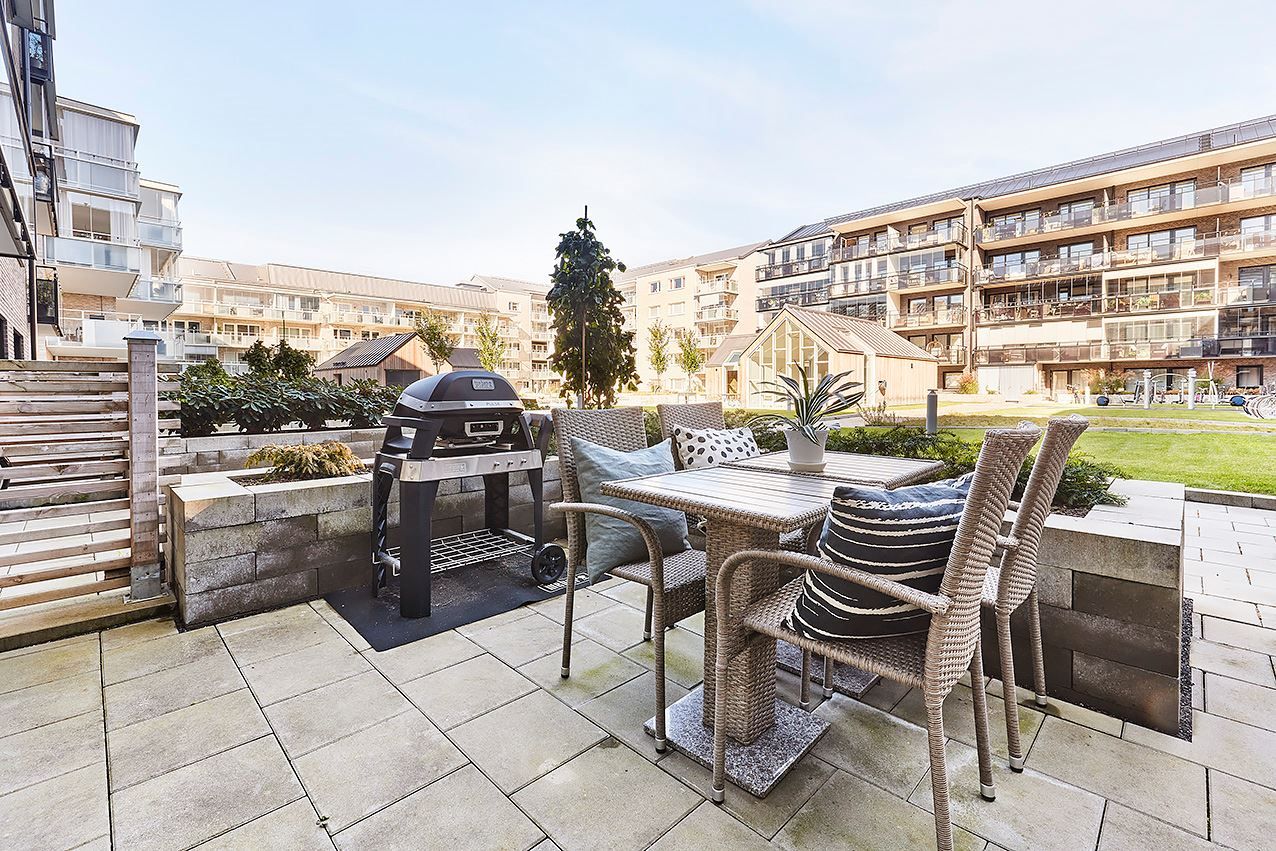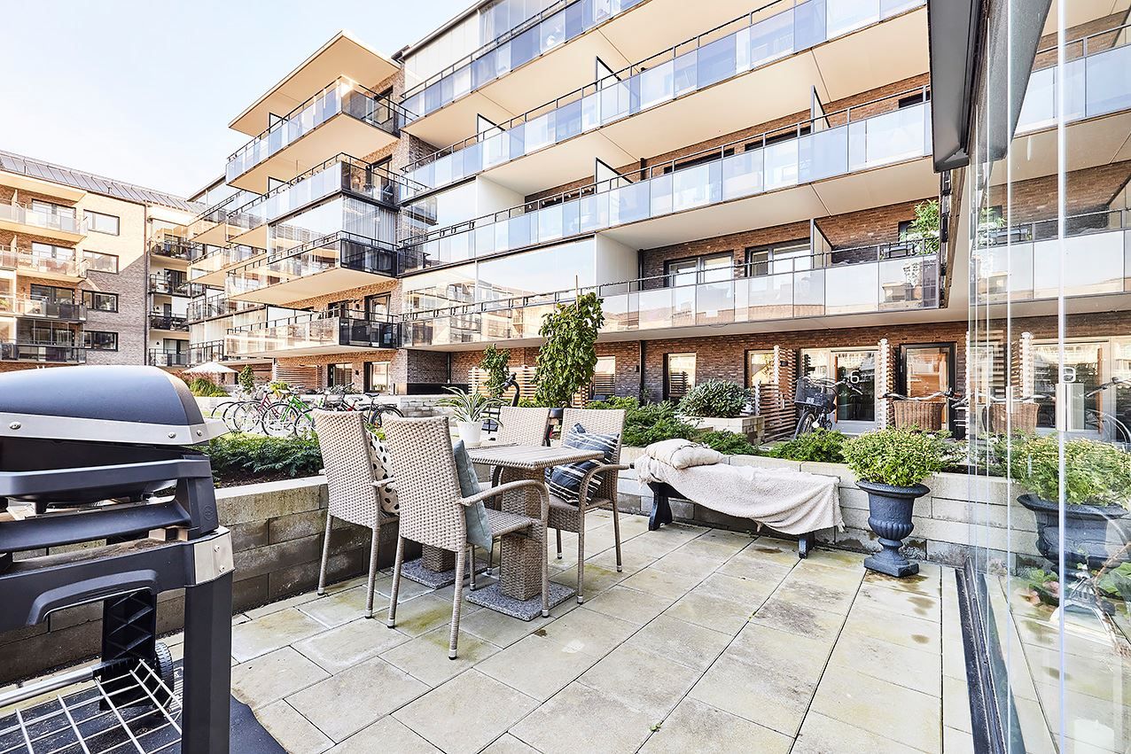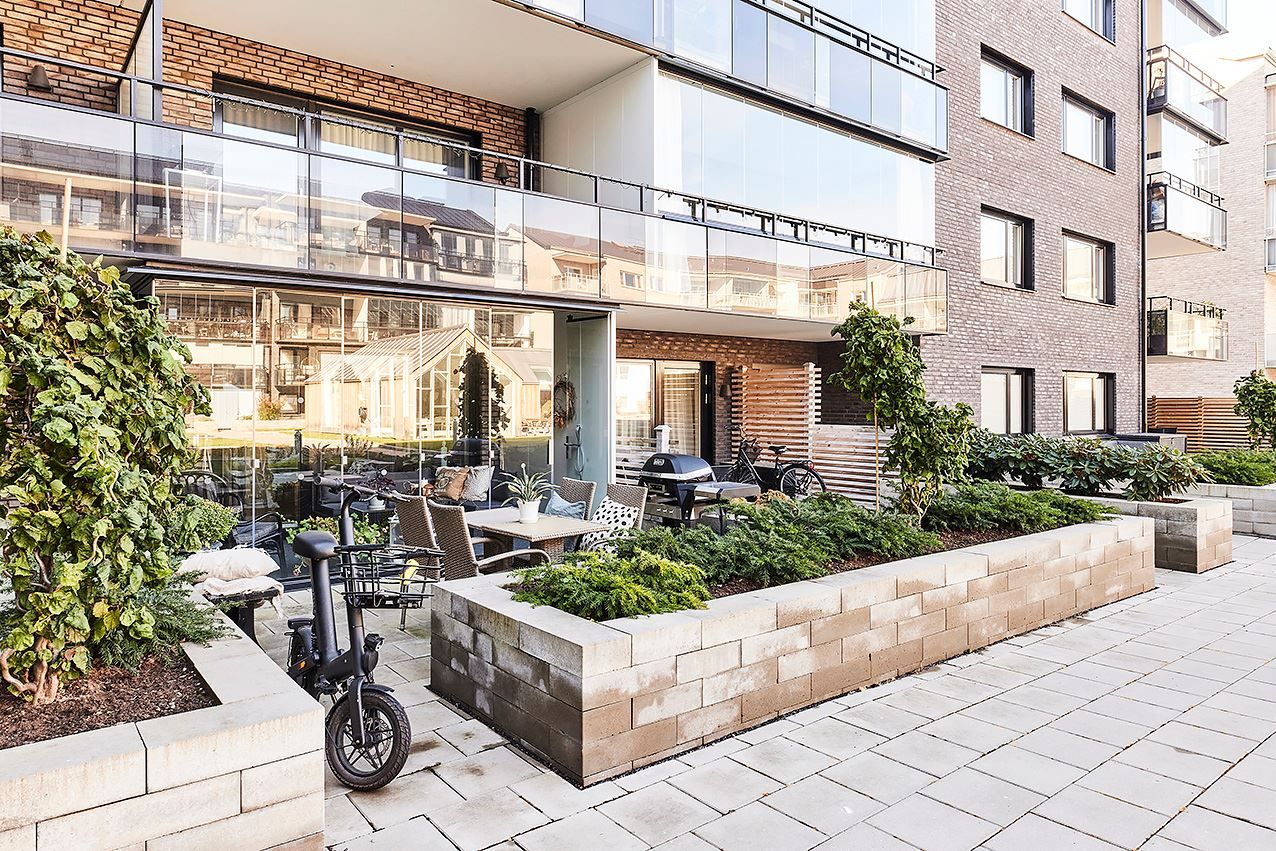 Inglasad balkong och uteplats mot innergårdsmiljön.