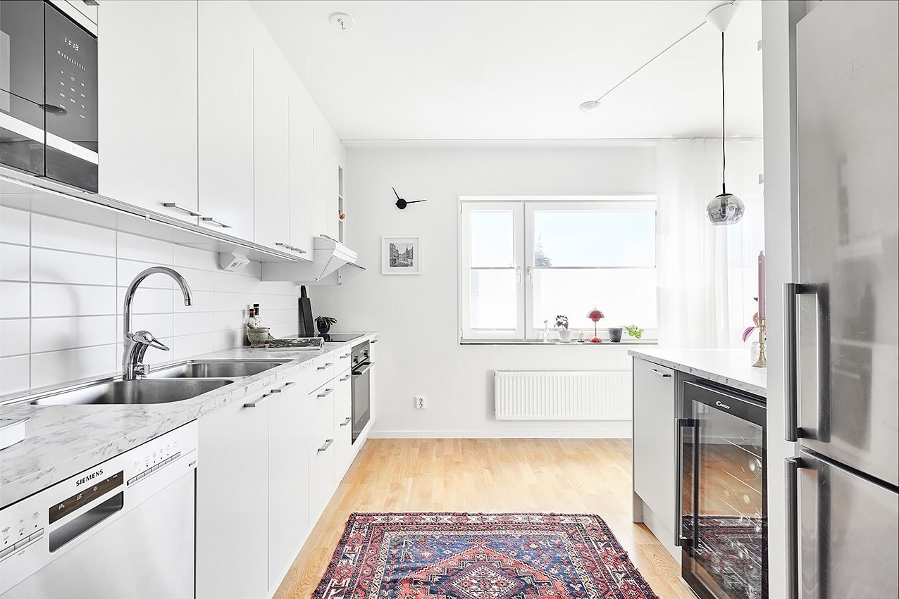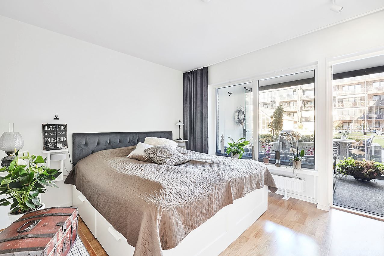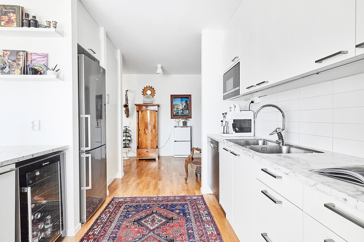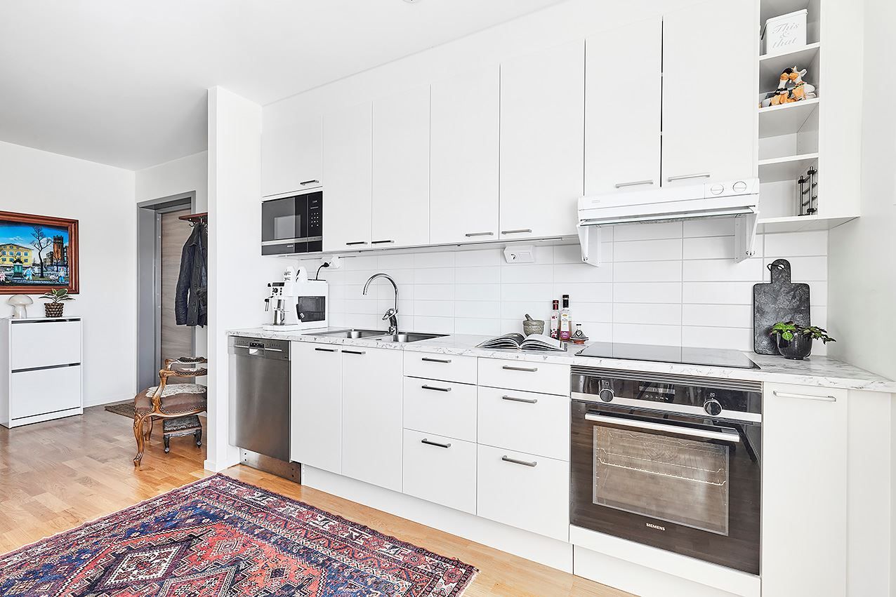 Köket är ett fint vitt kvalitétskök som öppnar upp mot allrummet och de sociala ytorna. Köket är även utrustat med köksö och vinkyl och är som gjutet för socialt häng! Sovrummet är välplanerat och stort vilket möjligör god möblering med både säng och skrivbord om så önskas. Även här finns mycket förvaring och här når du även den inglasade balkongen och uteplatsen mot den moderna och grönskande innergården. Här blir grillkvällarna både många och långa under sommarhalvåret!