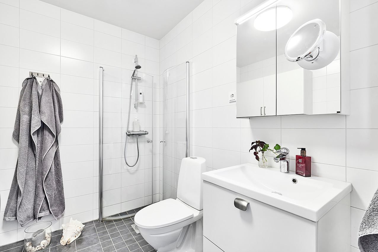 Badrummet är helkaklat i stilrena toner och bjuder både tvättmaskin och torktumlare som löser vardagstvätten ypperligt! Gott om bra förvaringslösningar i lägenheten och för sådant du önskar tillgång till mindre ofta placerar du med fördel i förrådet som följer med lägenheten på källarplan.