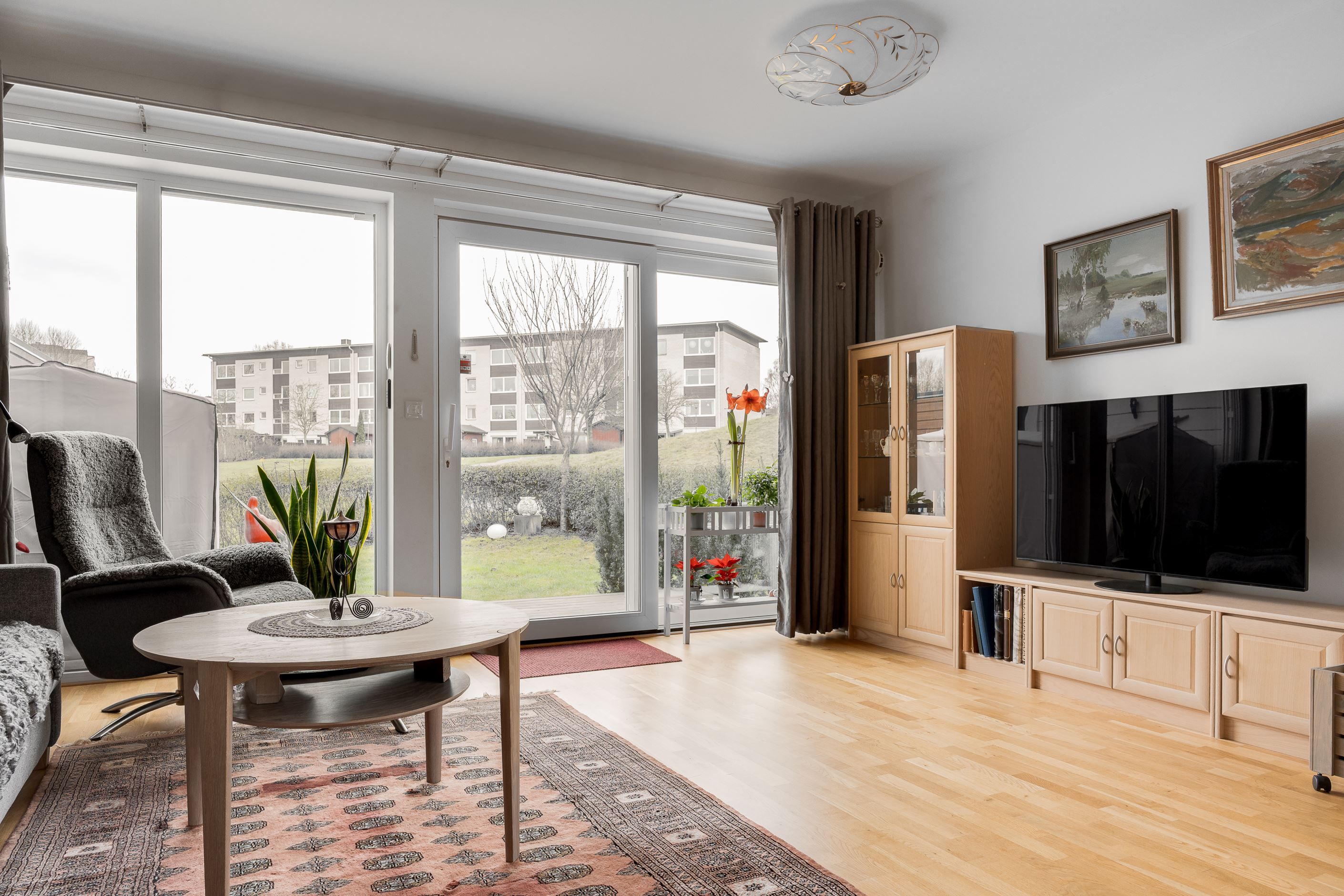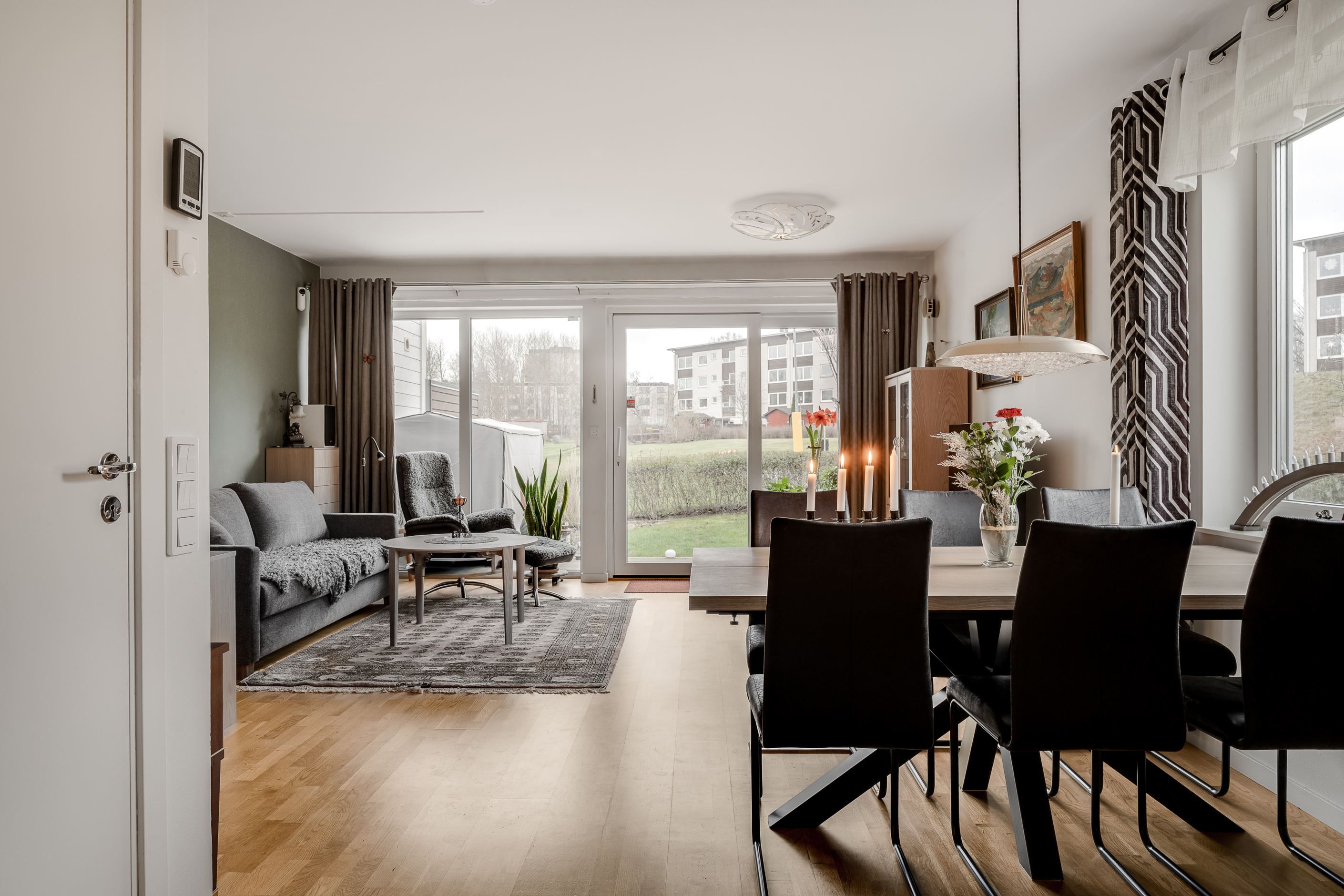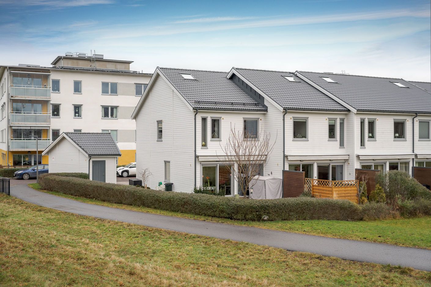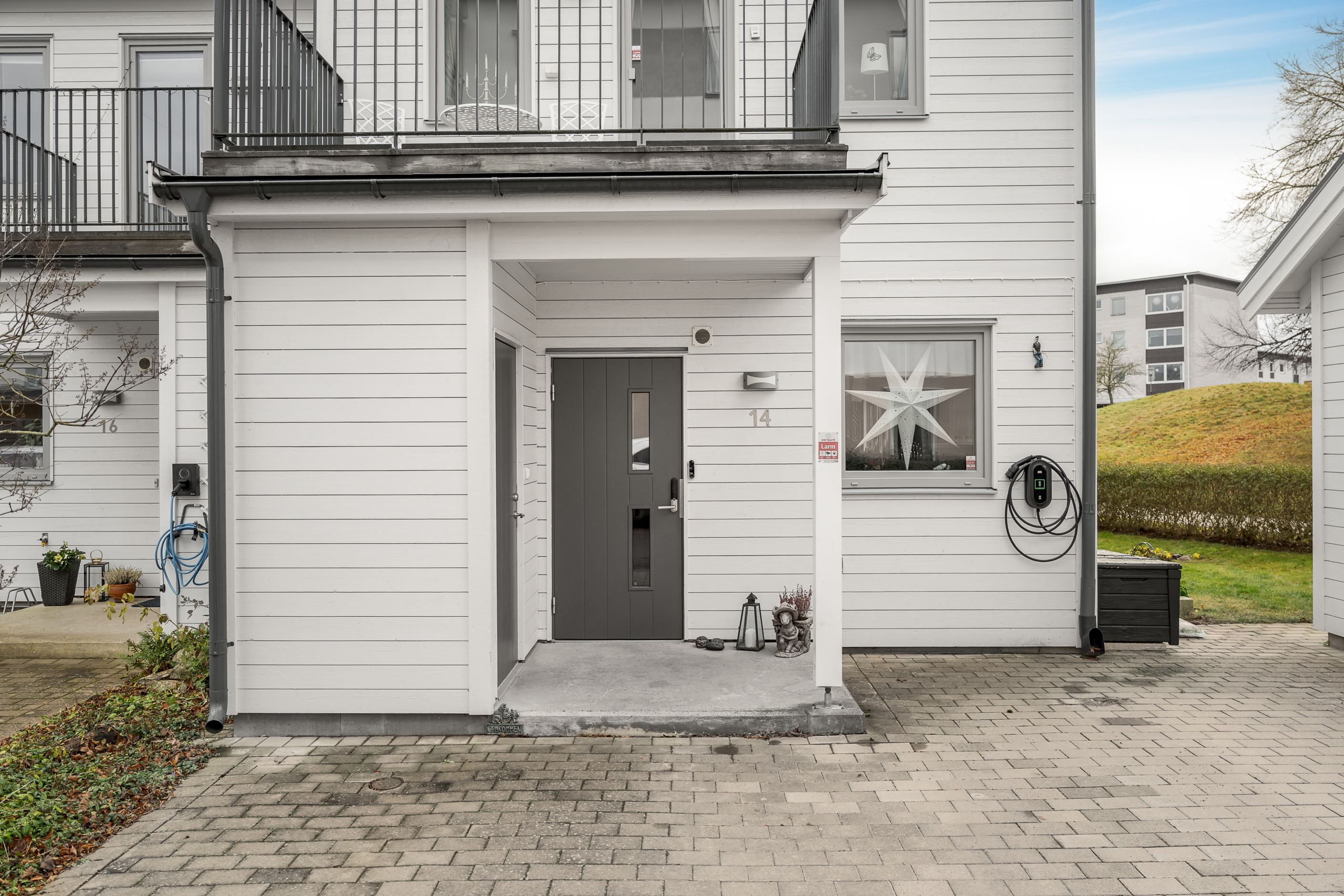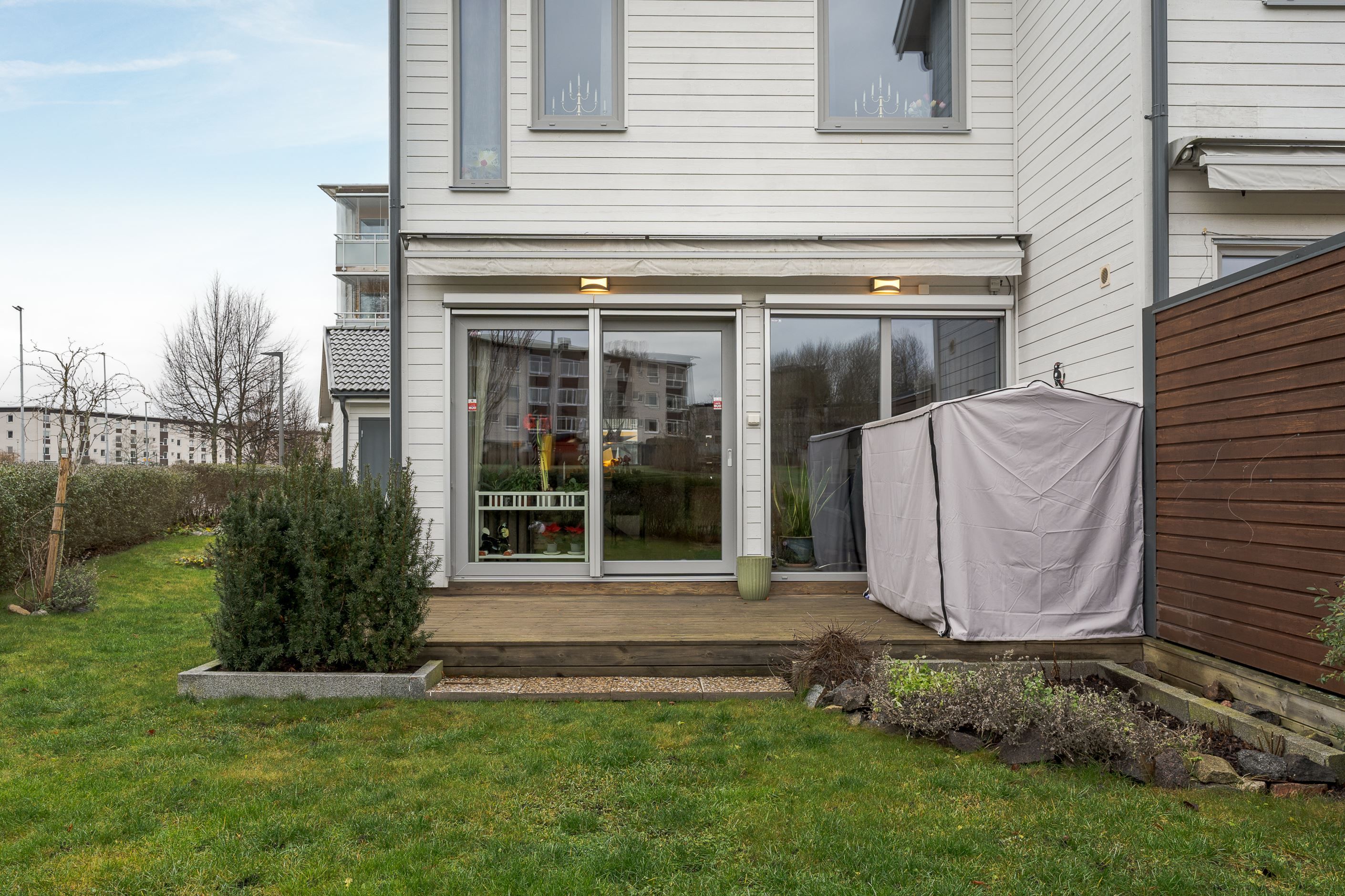 Entréplanet välkomnar med en rymlig hall med god förvaring bakom skjutdörrsgarderober. Här finns ett helkaklat badrum med badkar samt en praktisk tvättavdelning med tvättmaskin och torktumlare. Det stilrena köket har vita skåpsluckor, bra arbetsytor och moderna vitvaror, och ligger i öppen planlösning mot det ljusa vardagsrummet – en härlig samlingsplats med utrymme för både matplats och soffgrupp. Från vardagsrummet nås den trivsamma uteplatsen med trätrall och grönska, perfekt för sommarens måltider och avkoppling.