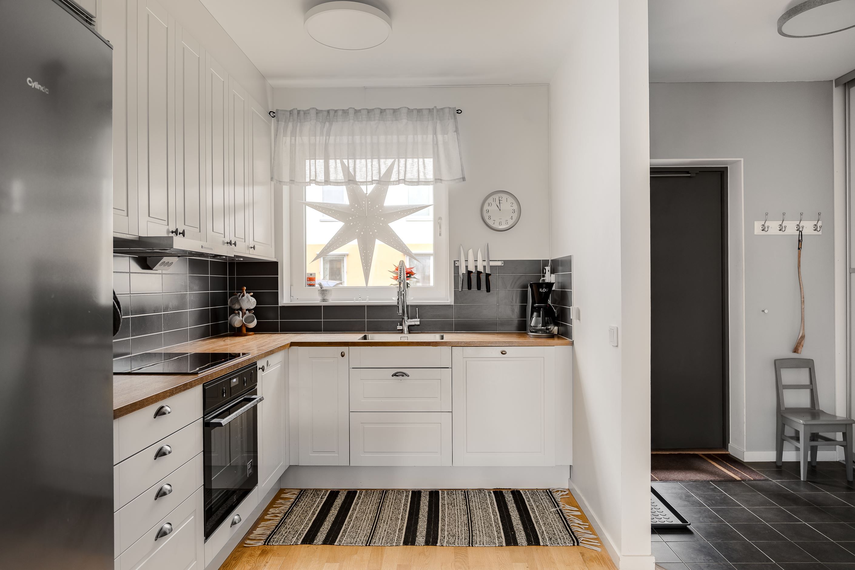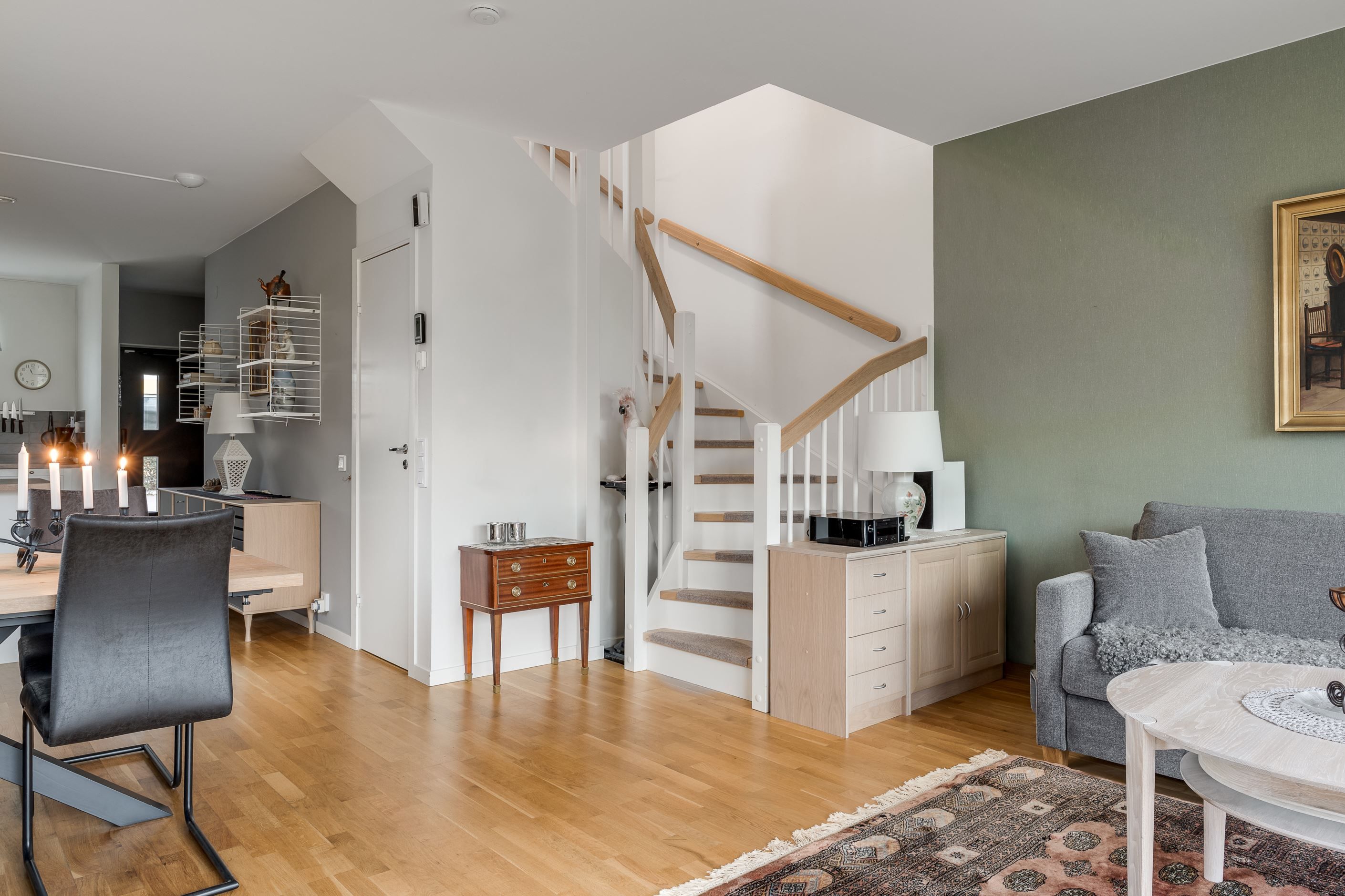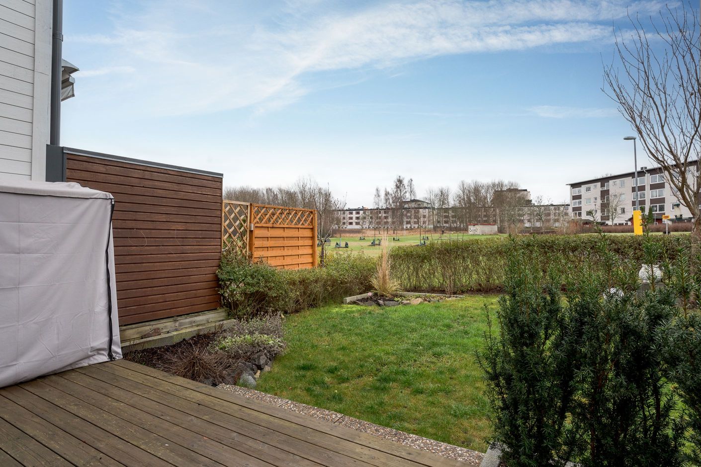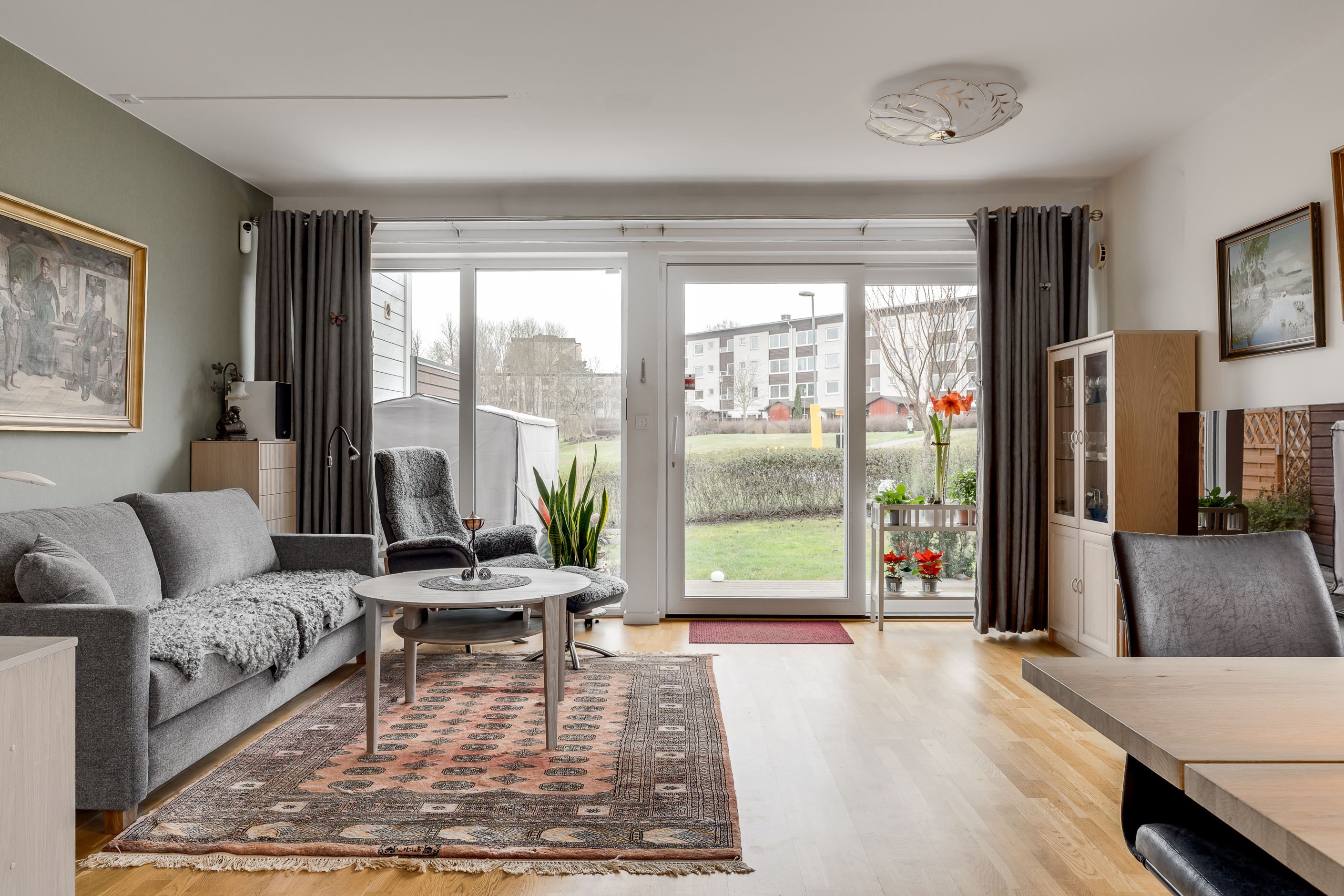 Entréplanet välkomnar med en rymlig hall med god förvaring bakom skjutdörrsgarderober. Här finns ett helkaklat badrum med badkar samt en praktisk tvättavdelning med tvättmaskin och torktumlare. Det stilrena köket har vita skåpsluckor, bra arbetsytor och moderna vitvaror, och ligger i öppen planlösning mot det ljusa vardagsrummet – en härlig samlingsplats med utrymme för både matplats och soffgrupp. Från vardagsrummet nås den trivsamma uteplatsen med trätrall och grönska, perfekt för sommarens måltider och avkoppling.