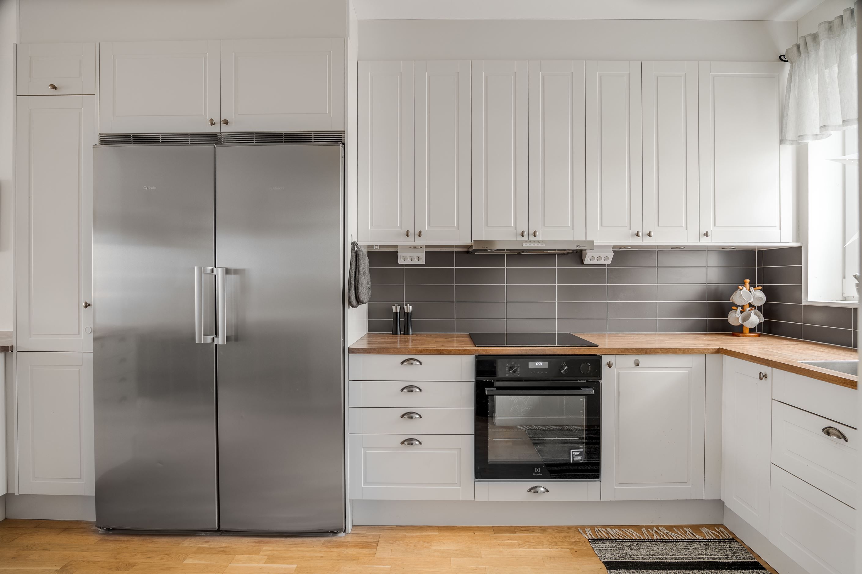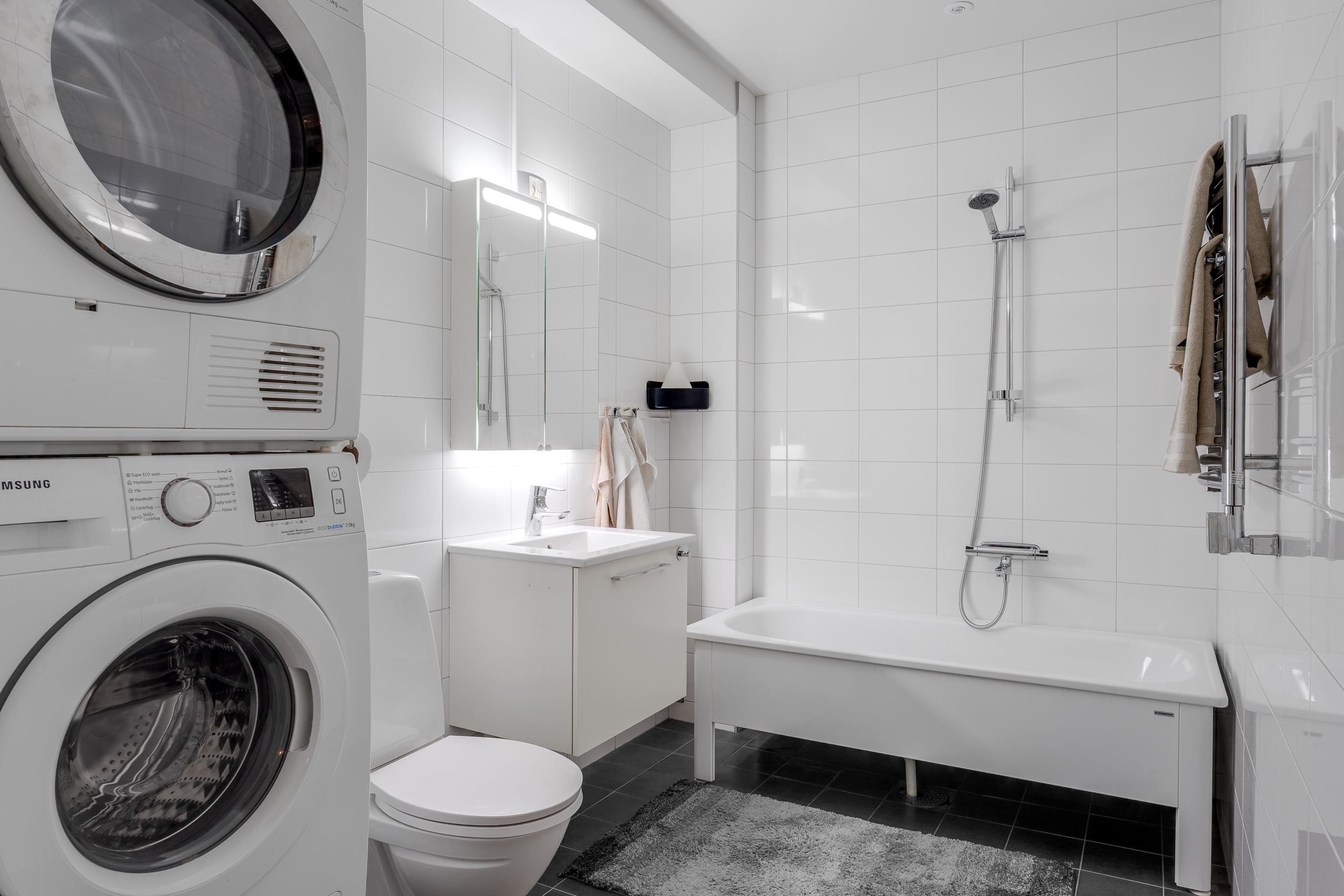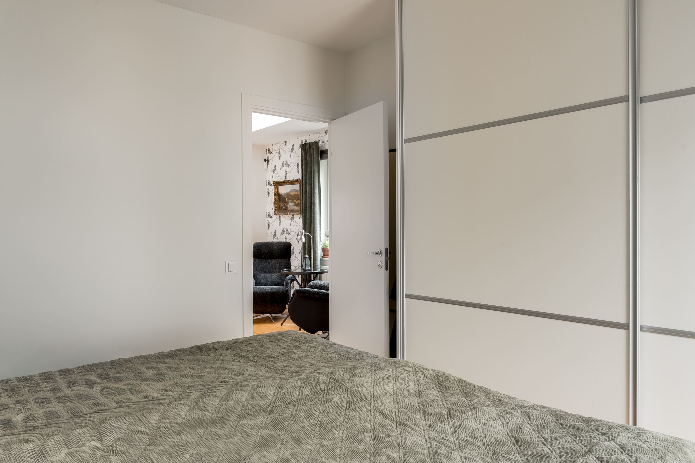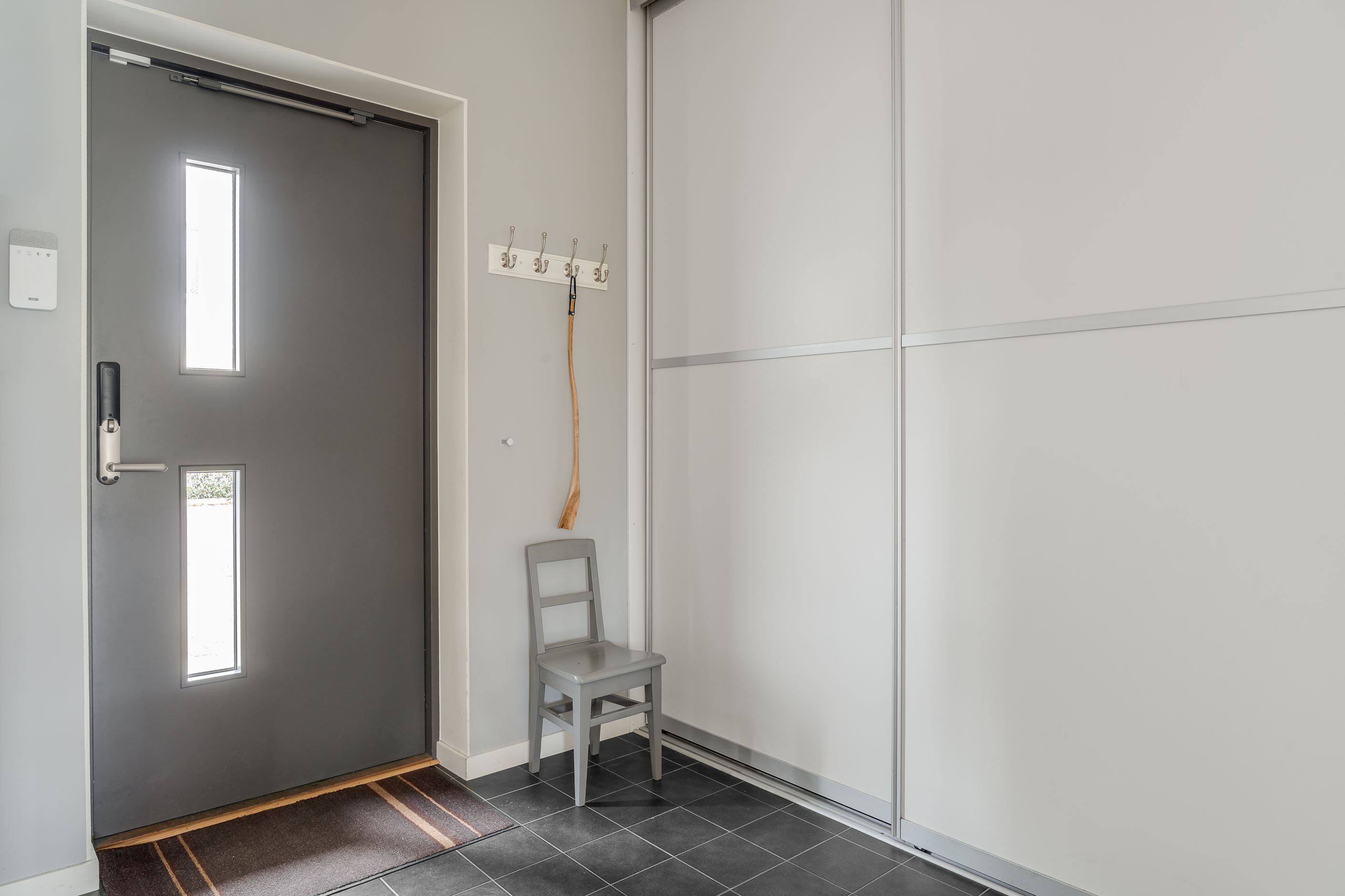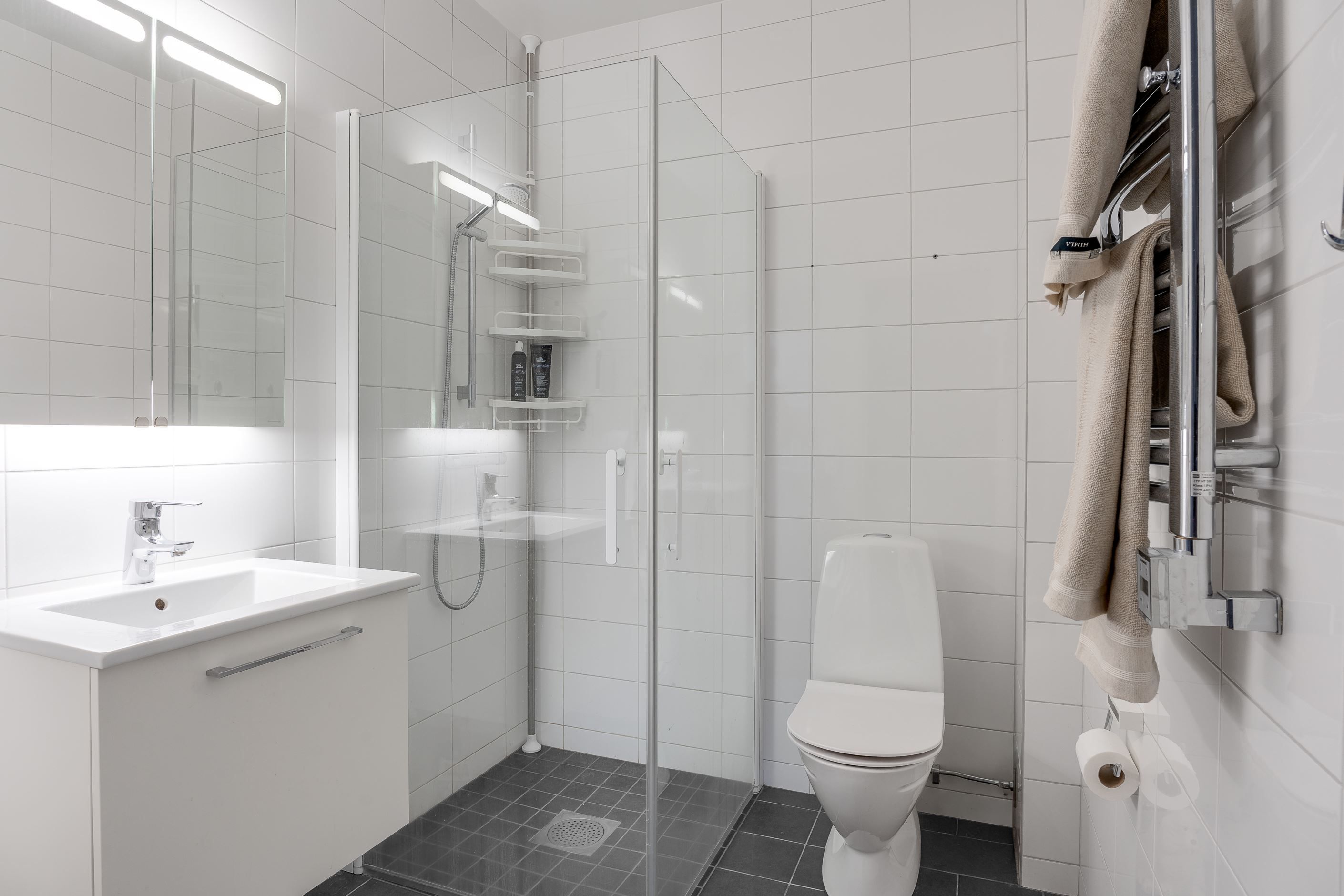 Entréplanet välkomnar med en rymlig hall med god förvaring bakom skjutdörrsgarderober. Här finns ett helkaklat badrum med badkar samt en praktisk tvättavdelning med tvättmaskin och torktumlare. Det stilrena köket har vita skåpsluckor, bra arbetsytor och moderna vitvaror, och ligger i öppen planlösning mot det ljusa vardagsrummet – en härlig samlingsplats med utrymme för både matplats och soffgrupp. Från vardagsrummet nås den trivsamma uteplatsen med trätrall och grönska, perfekt för sommarens måltider och avkoppling.