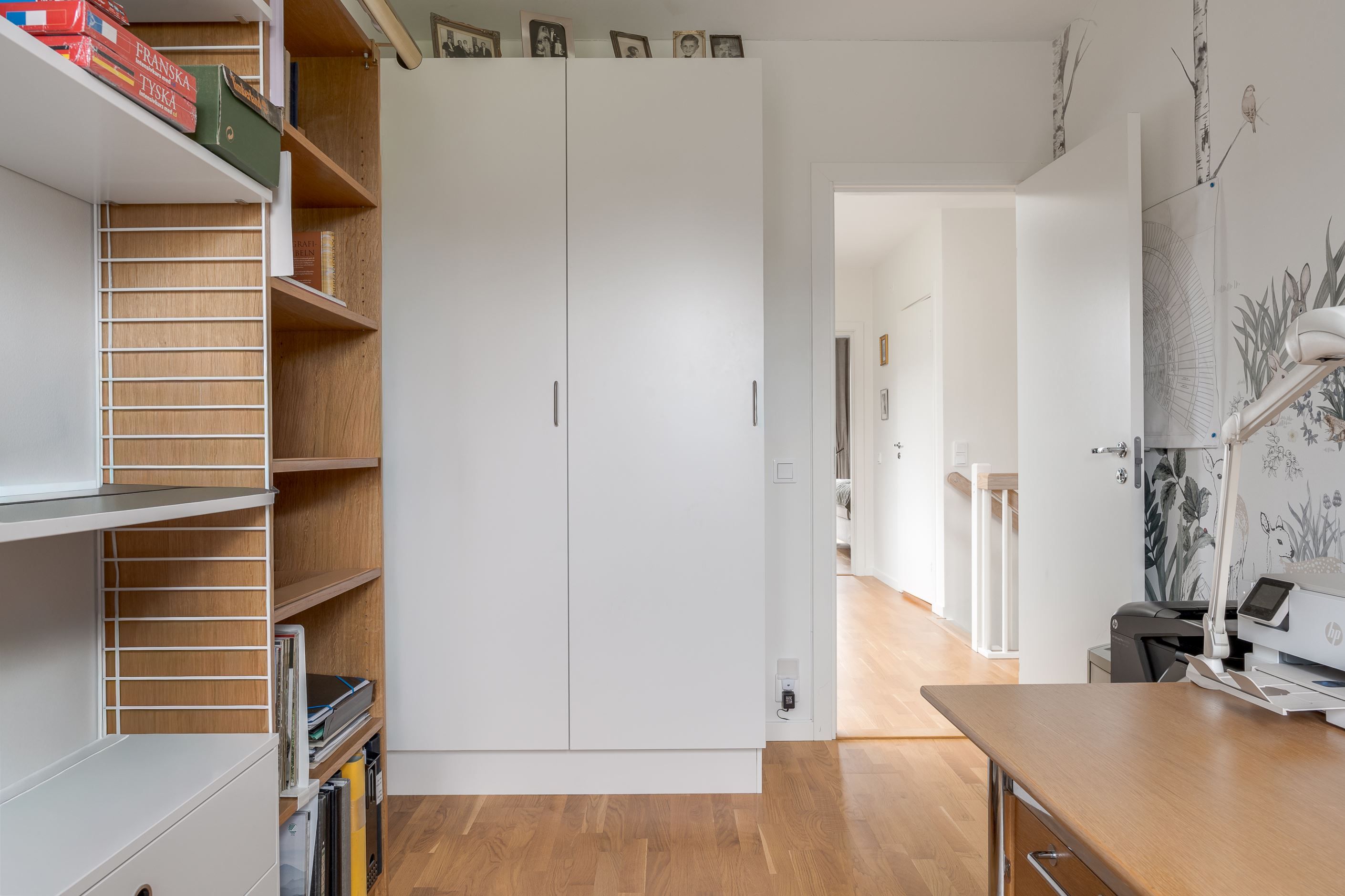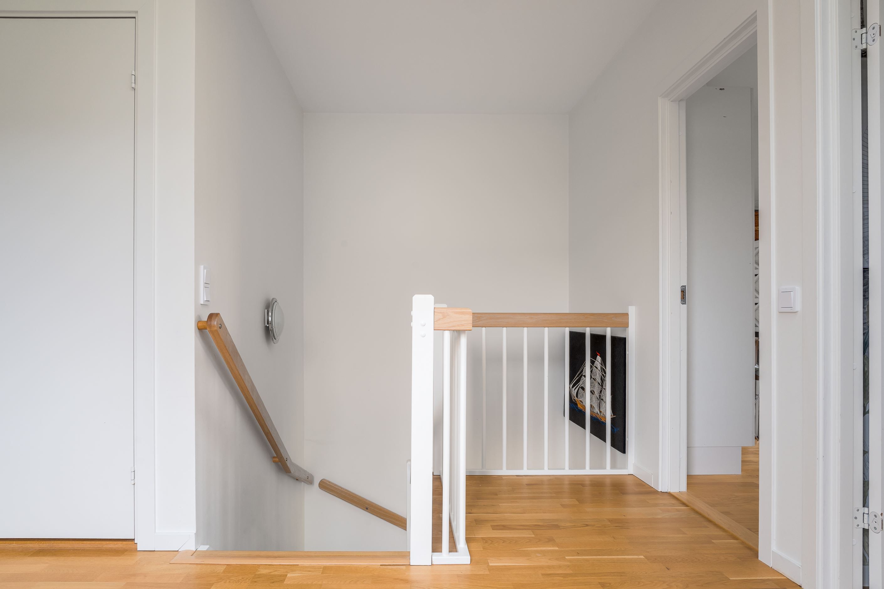 Övre plan erbjuder ett ljust allrum, tre rogivande sovrum med bra förvaring – varav ett med utgång till balkong – samt ett helkaklat duschrum och en praktisk klädkammare.