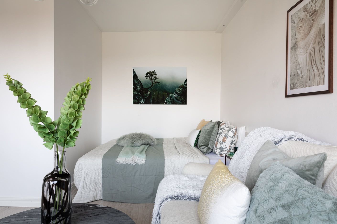 Välkommen till denna renoverade 1:a på 29 kvm högst upp i huset med vidsträckt utsikt, beläget på populära Näset, med närhet till kommunikationer och naturen. Lägenheten andas ljus, rymd och här har du ingen insyn från någon! Välplanerade ytor med separat sovalkov för stor dubbelsäng intill vardagsrummet med plats för både soffa, fåtölj och mindre matbord. Separat funktionellt kök med gott om förvaring bakom vita luckor. Avskärmad hall med öppen förvaring och förvaring bakom skjutdörrar. Från hallen nås det stambytta helkaklade badrummet (2009) med dusch, här är det förberett för tvättmaskin. Golv, ytskikt, belysning och köket har setts över i renoveringen (2018-2021). Välskött förening med god ekonomi och många stora renoveringar bakom sig. Två tvättstugor, cykelförråd, parkering och garage finns i föreningen (gratis parkering på gatan) samt källarförråd disponeras av lägenheten. Tillträdet enligt överenskommelse.