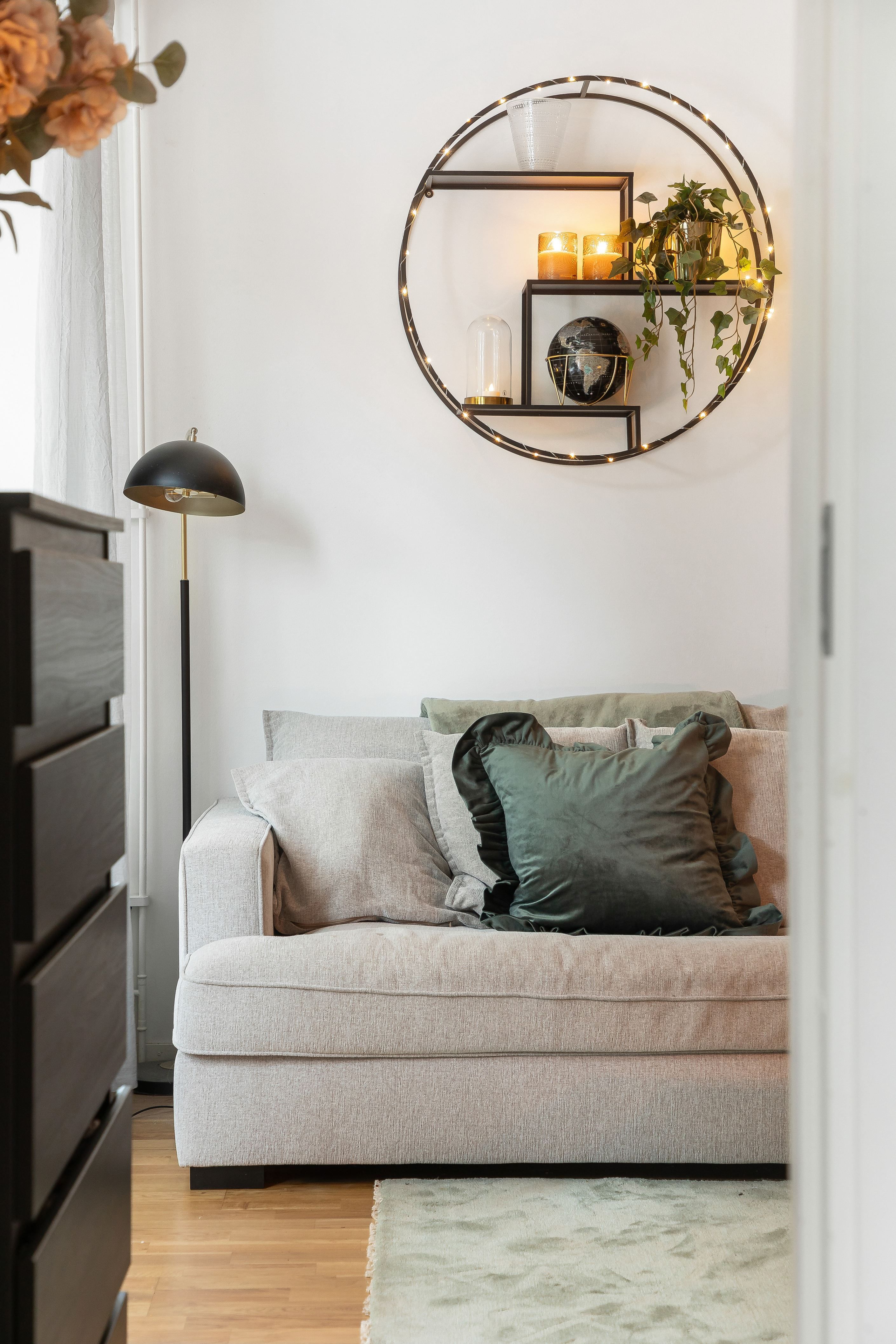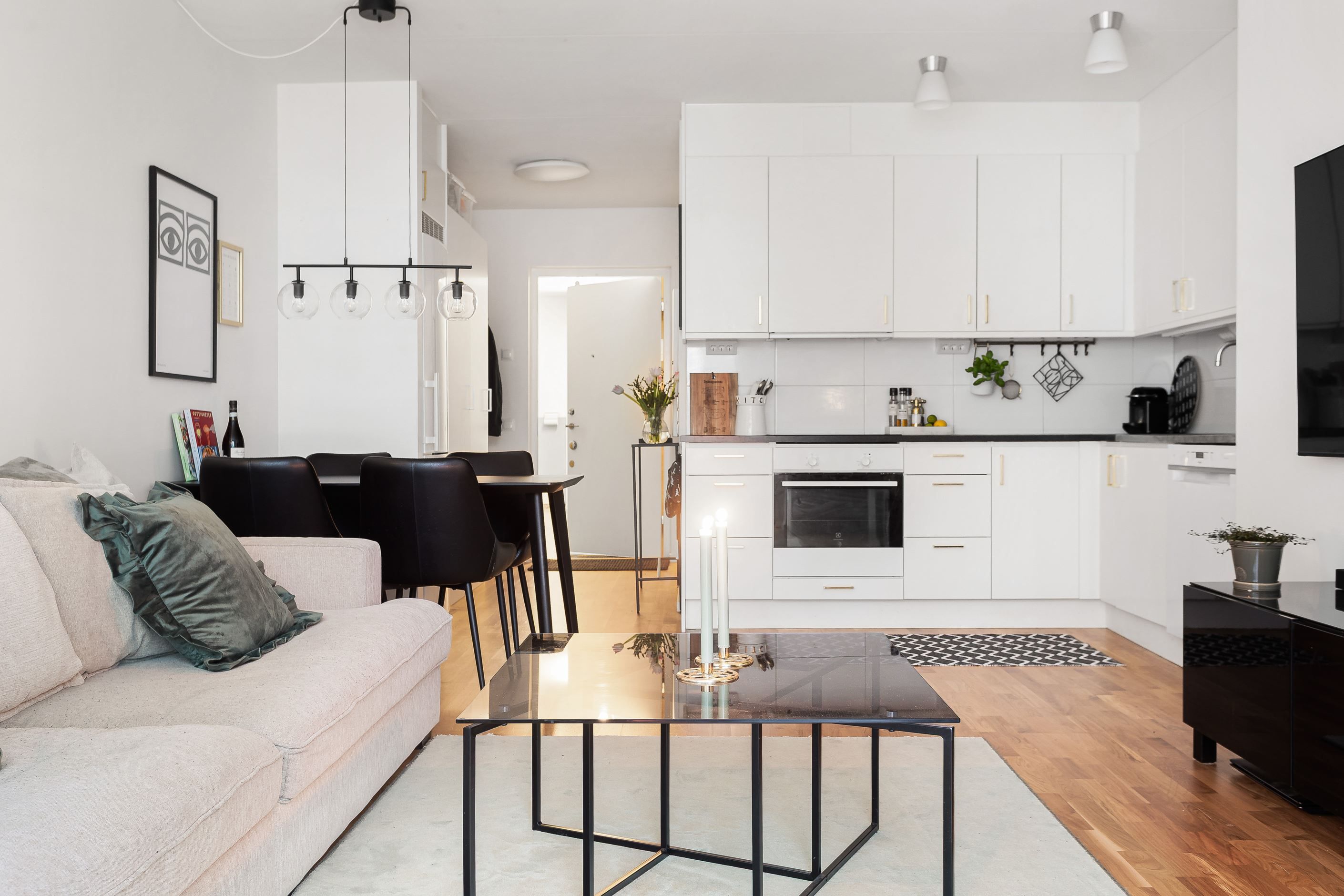 Den smart planerade planlösningen ger en skön balans mellan sällskapsytor och privata rum. Vardagsrummet är ljust och rymligt med plats för både soffgrupp och matbord, och har direkt utgång till den stora balkongen med utsikt över allmänningen. Köket är trivsamt med gott om förvaring och arbetsytor. Sovrummet är rofyllt med plats för dubbelsäng och garderober, och badrummet är fräscht och funktionellt.