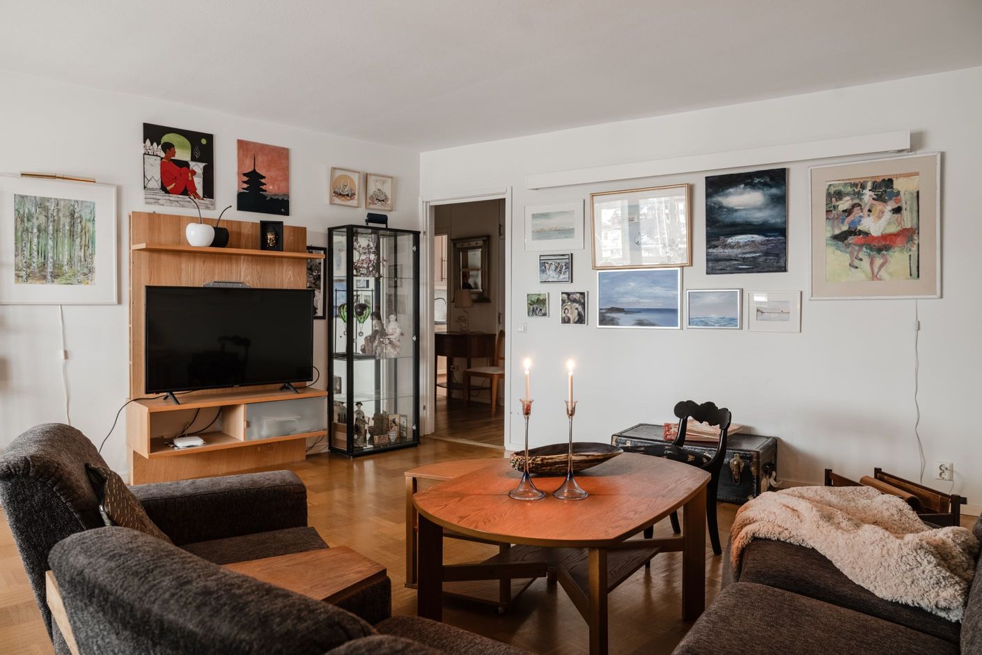Vardagsrummet är bostadens naturliga samlingspunkt, med generös yta och en härlig känsla av rymd. Här finns gott om plats för både soffgrupp, matsalsdel och läshörna. Den rutmönstrade parketten, de ljusa väggarna och de stora fönstren skapar ett öppet och harmoniskt intryck. Från rummet nås den inglasade uterummet med trallgolv, murad tegelvägg och sol större delen av dagen. Här skapas en rofylld atmosfär som gör platsen till lägenhetens hjärta och där du kan njuta av både middagar och stilla kvällar i avkopplande miljö.