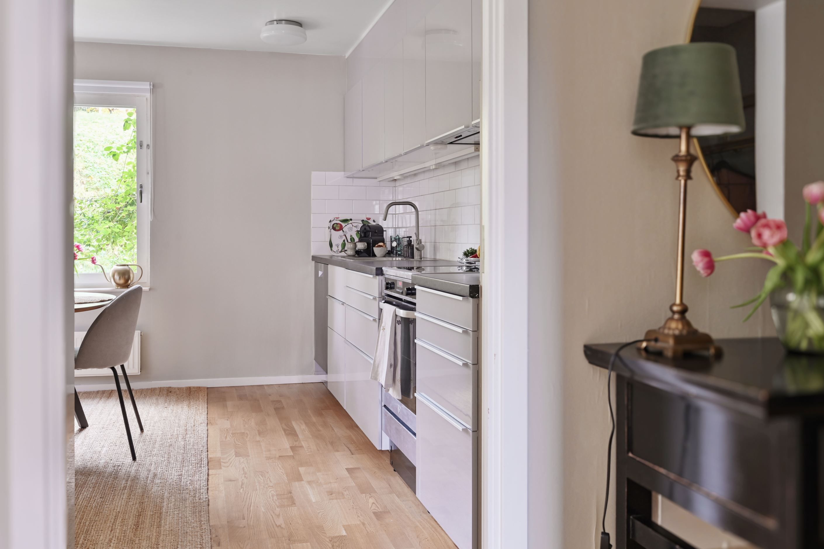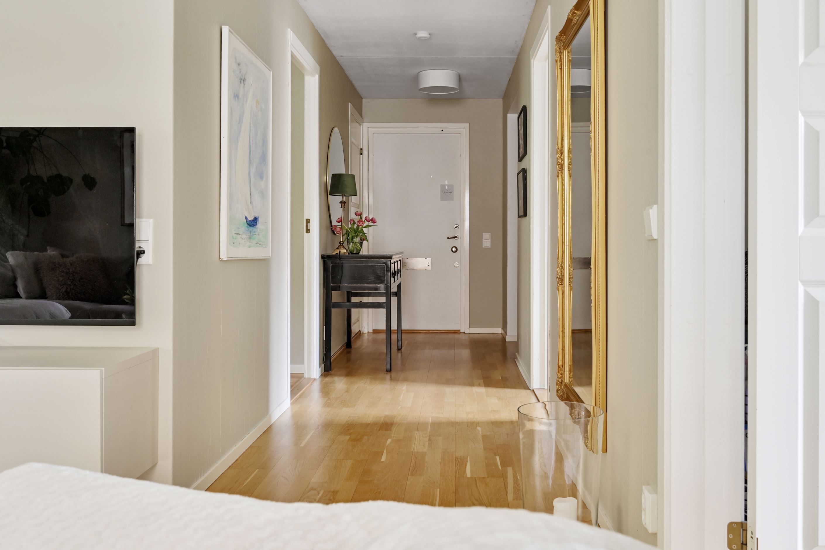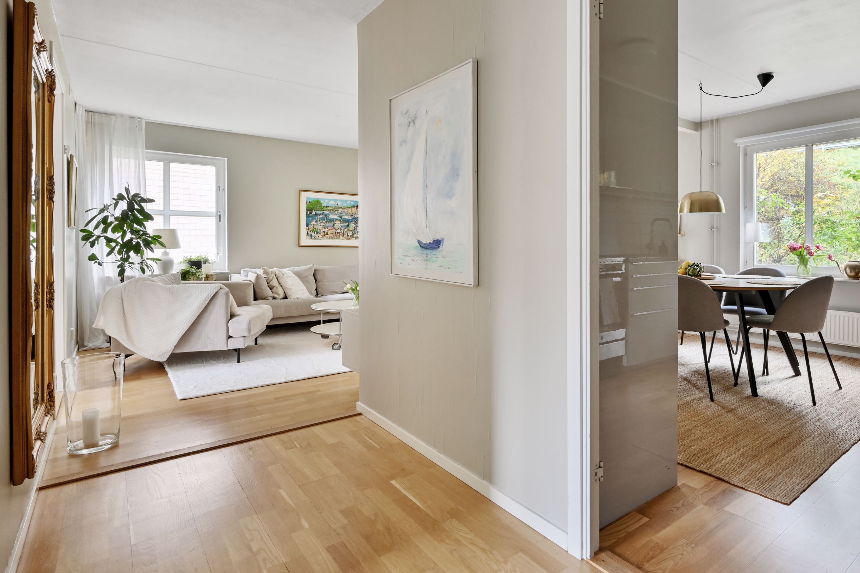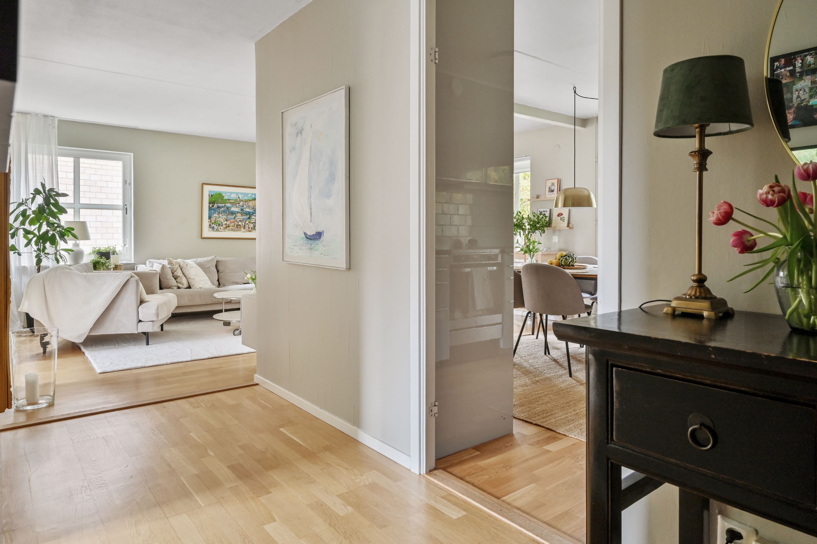 Redan i hallen märks den genomtänkta planlösningen med gott om plats för avhängning, byrå och förvaring. Intill finns ett generöst förråd med två garderober och smart vägghängd inredning som gör det enkelt att hålla ordning. Här är det nyligen ommålat och nya golv.