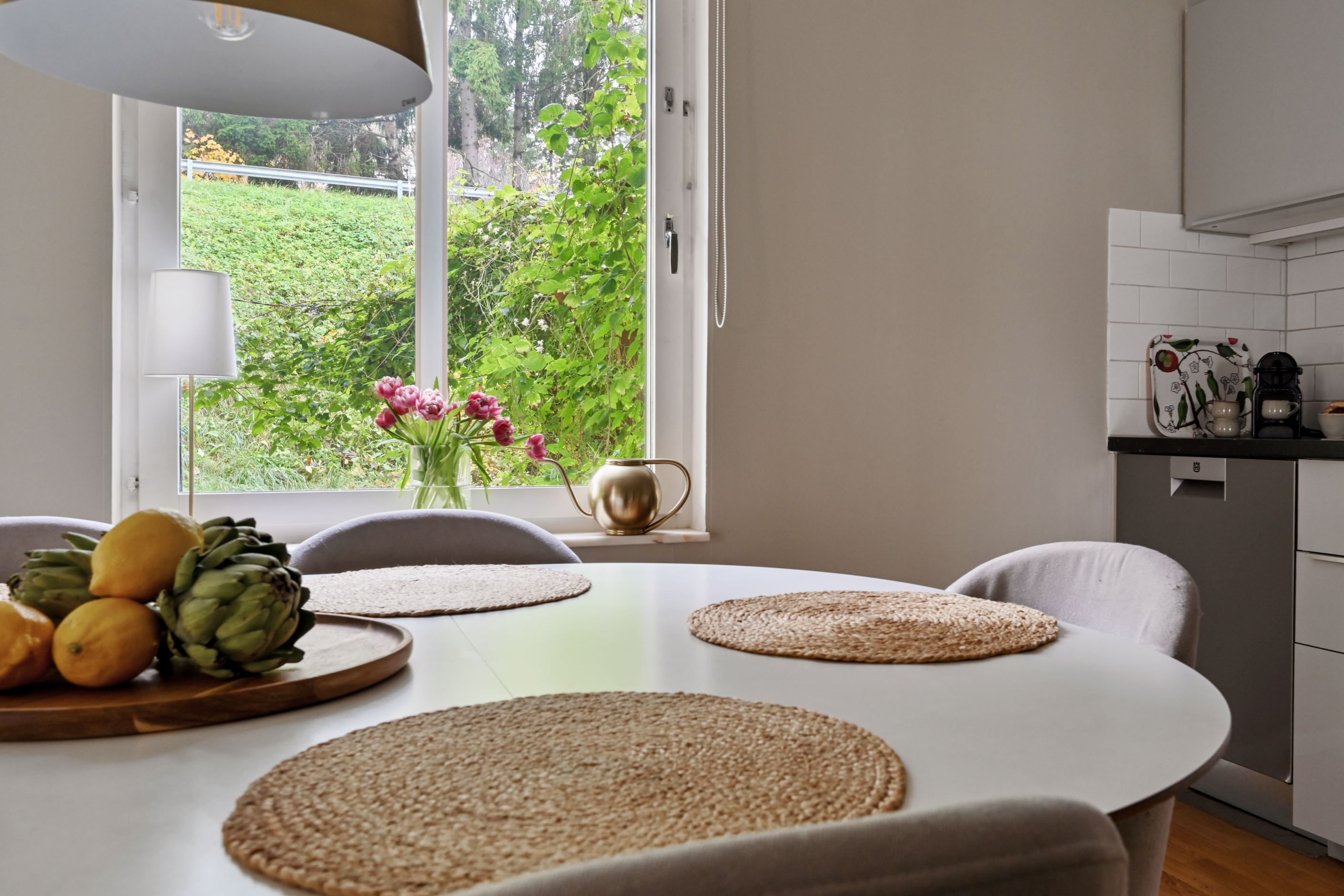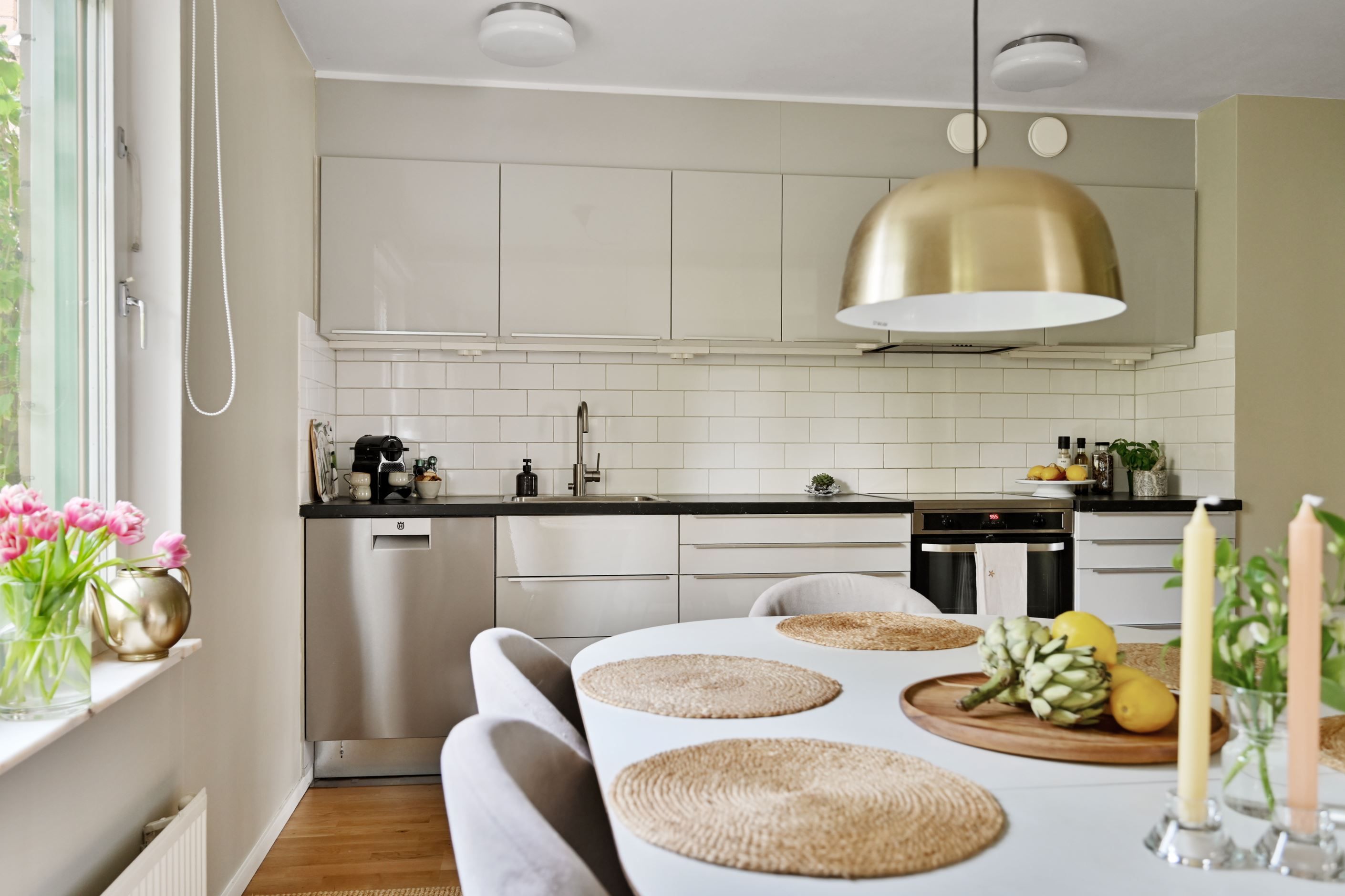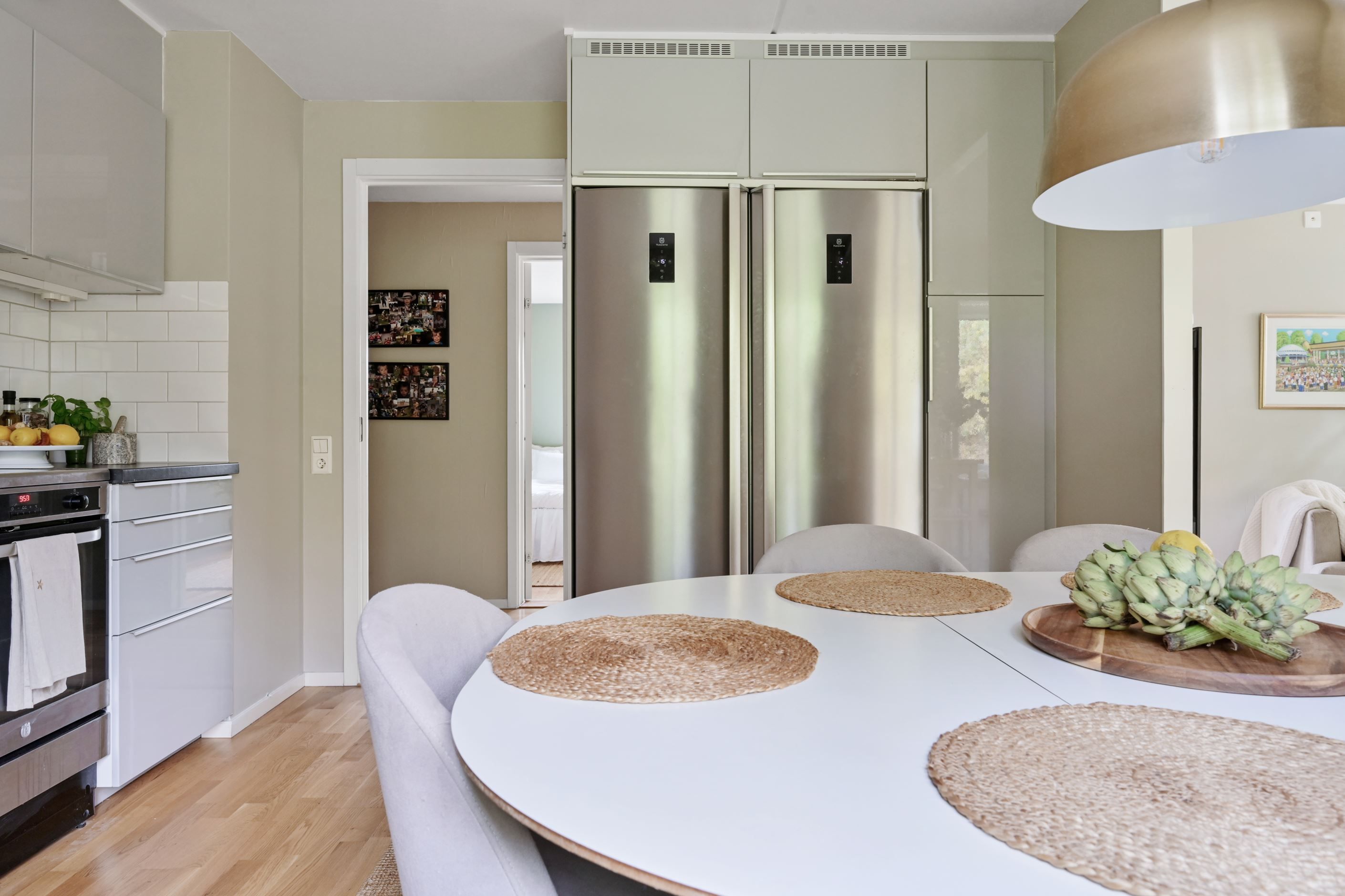 Det smakfulla köket från Ikea har grå luckor, svart bänkskiva och vitt kakel som skapar en tidlös och stilren känsla. Här finns fullstor kyl och frys samt plats för ett stort matbord för långa middagar med familj och vänner. Köket är öppet mot vardagsrummet, vilket skapar ett härligt socialt flöde och en ljus och luftig atmosfär.