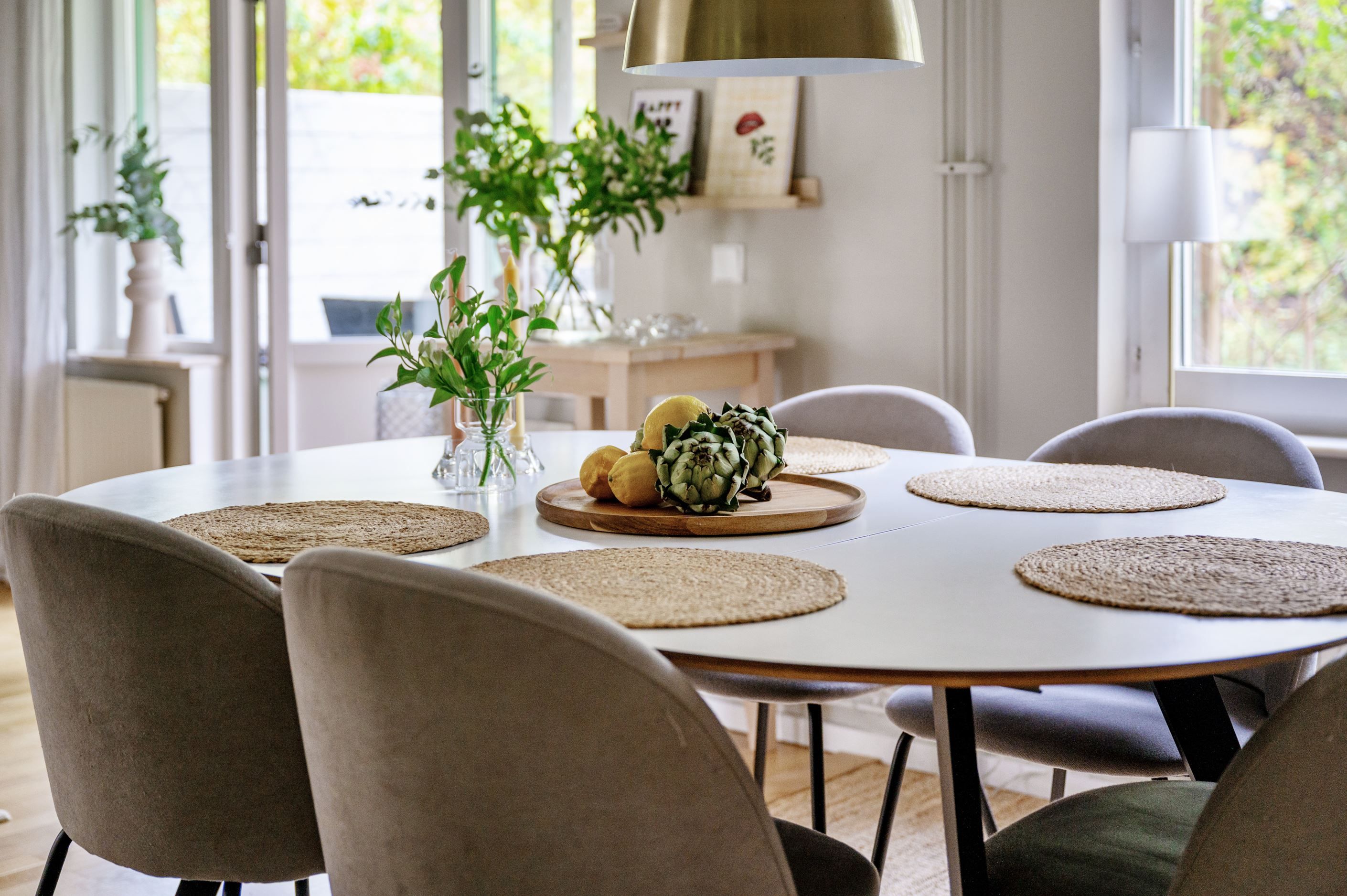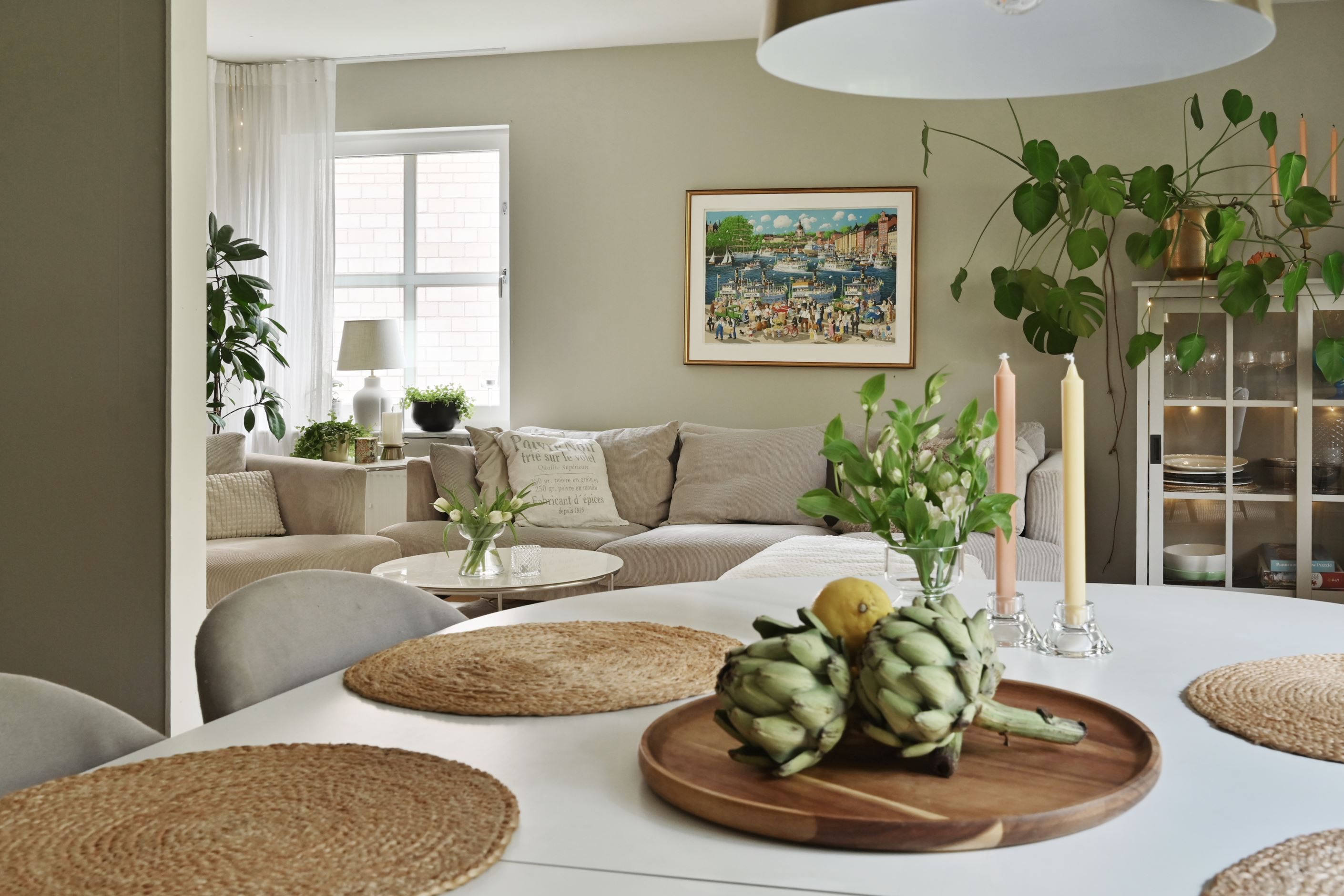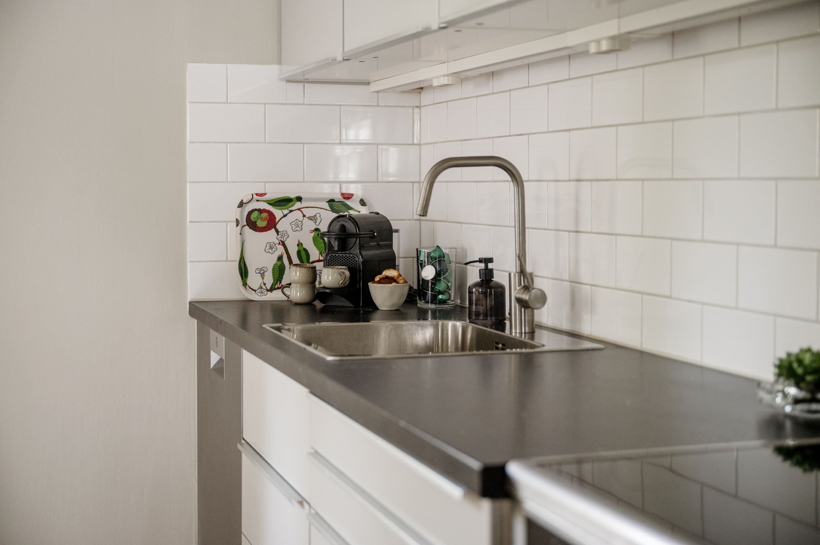 Det smakfulla köket från Ikea har grå luckor, svart bänkskiva och vitt kakel som skapar en tidlös och stilren känsla. Här finns fullstor kyl och frys samt plats för ett stort matbord för långa middagar med familj och vänner. Köket är öppet mot vardagsrummet, vilket skapar ett härligt socialt flöde och en ljus och luftig atmosfär.