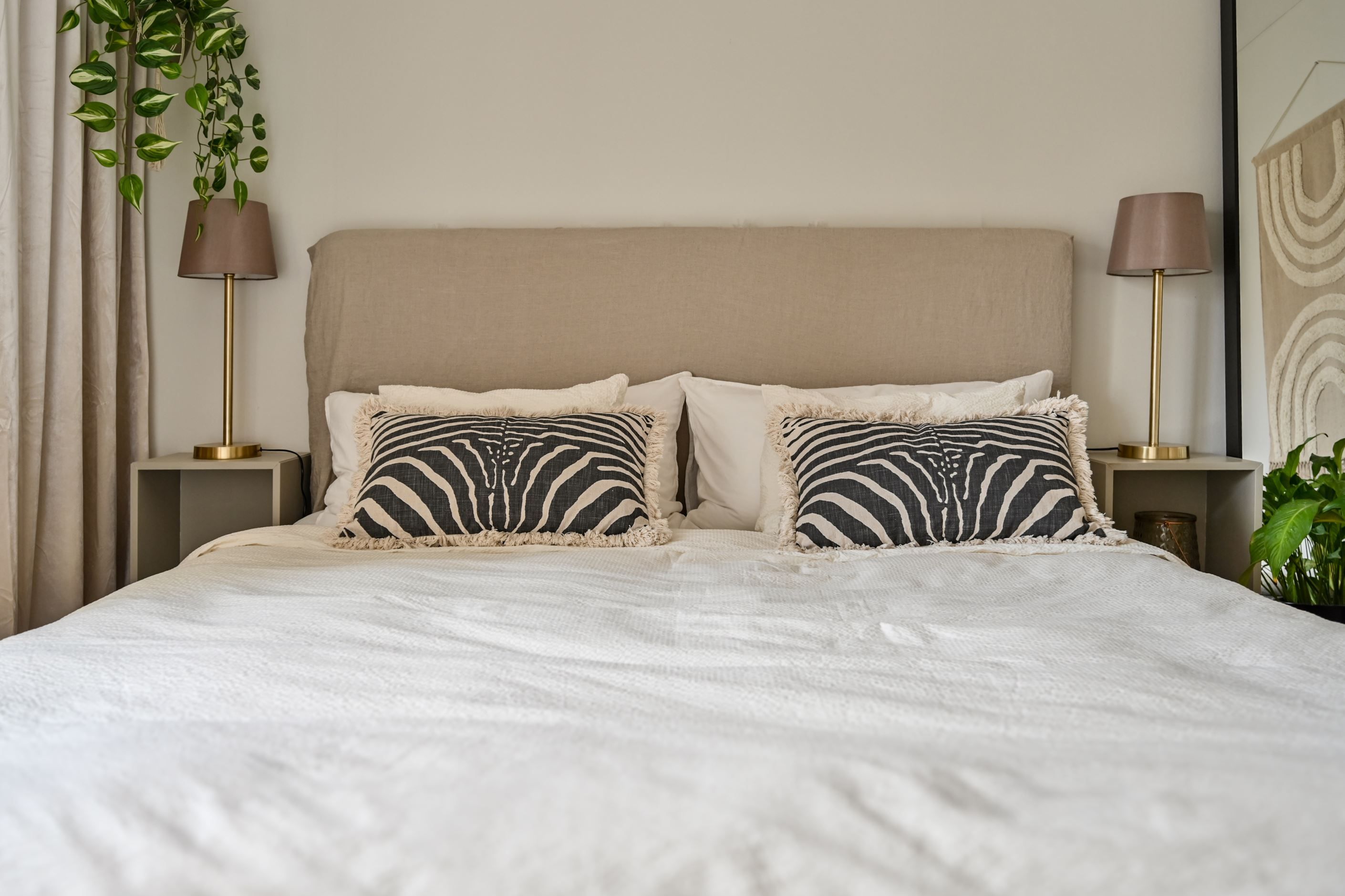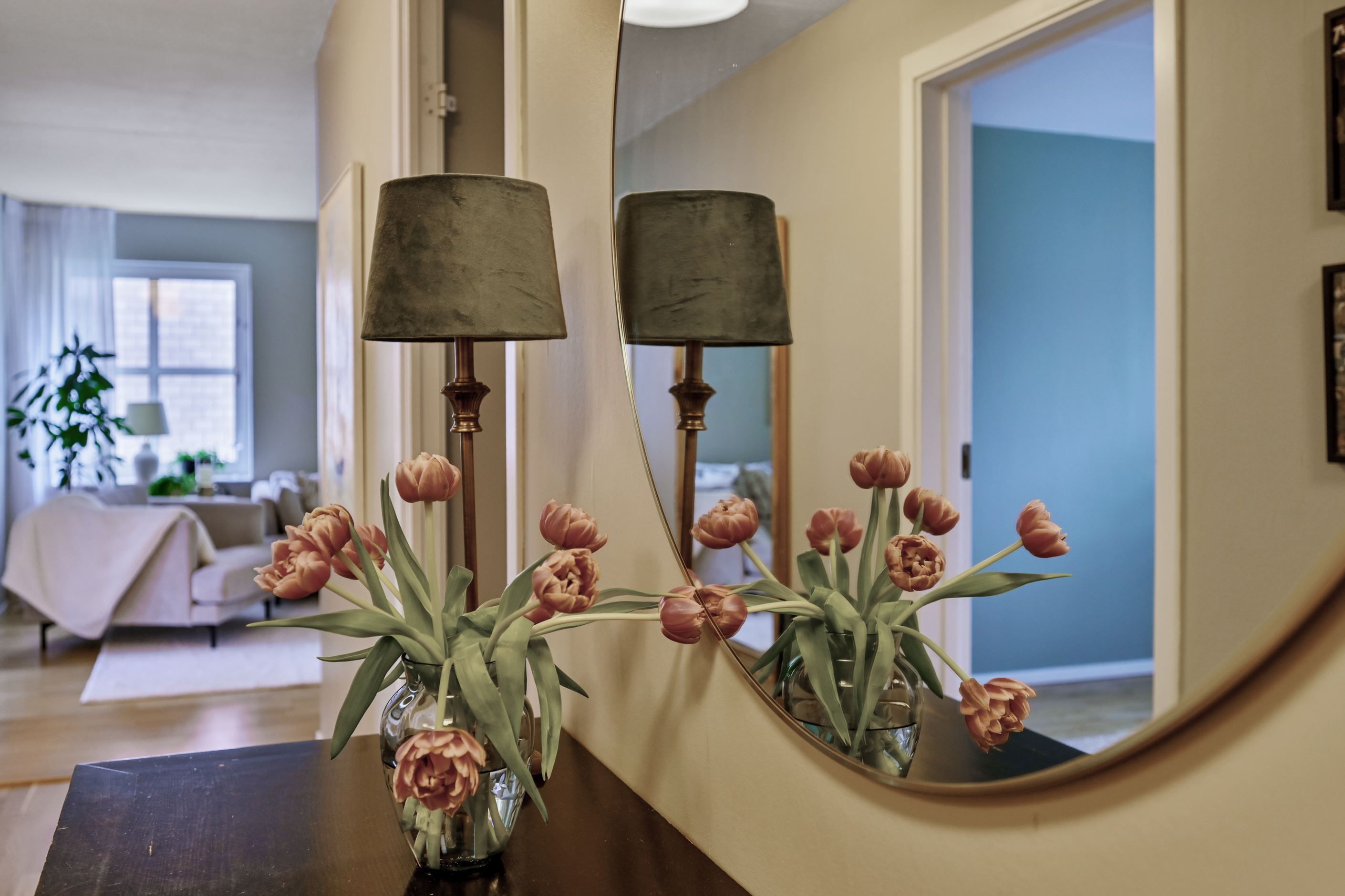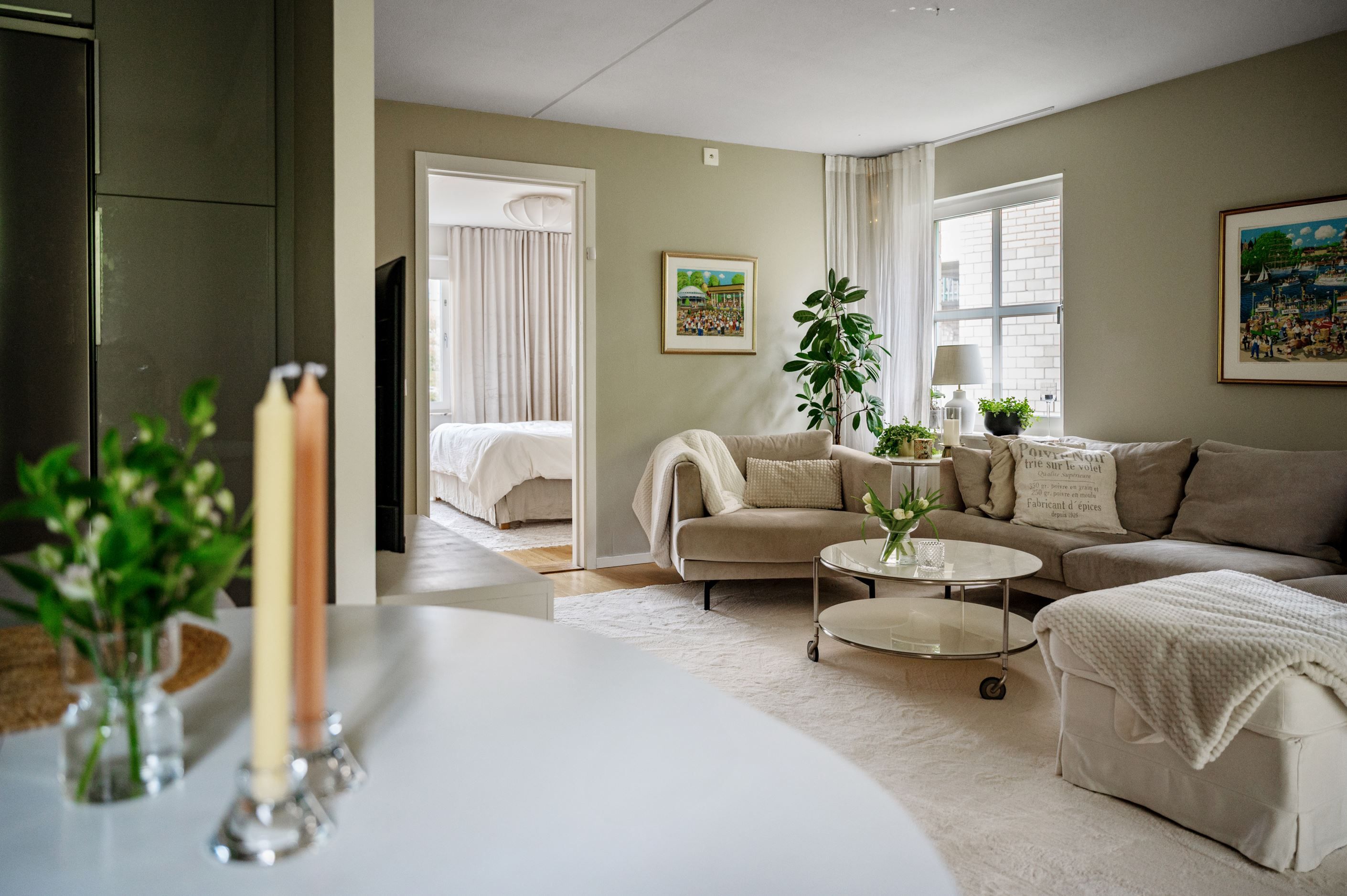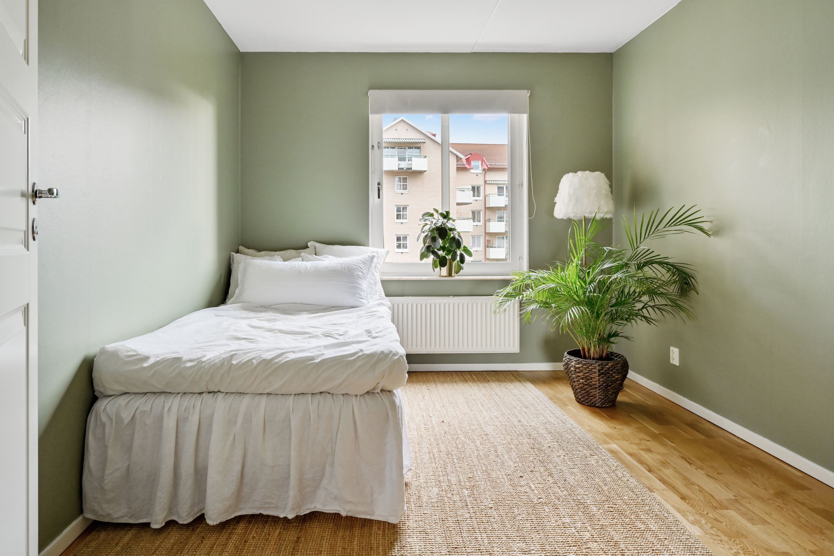 Lägenheten rymmer två rofyllda sovrum. Det ena har en harmonisk grön ton på väggarna och det andra erbjuder en härlig vy över omgivningarna samt en praktisk garderobsvägg med gott om plats för kläder och förvaring.
