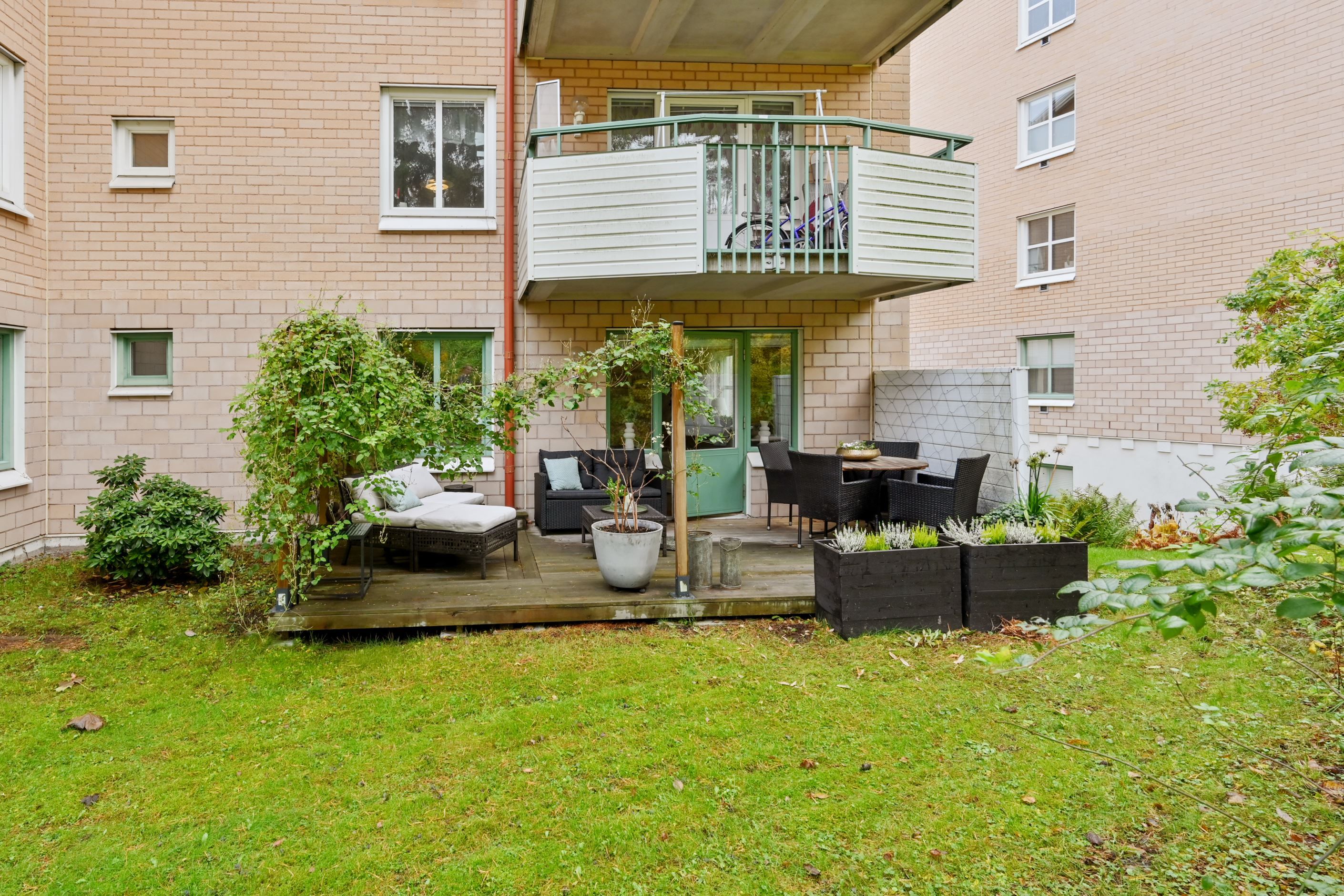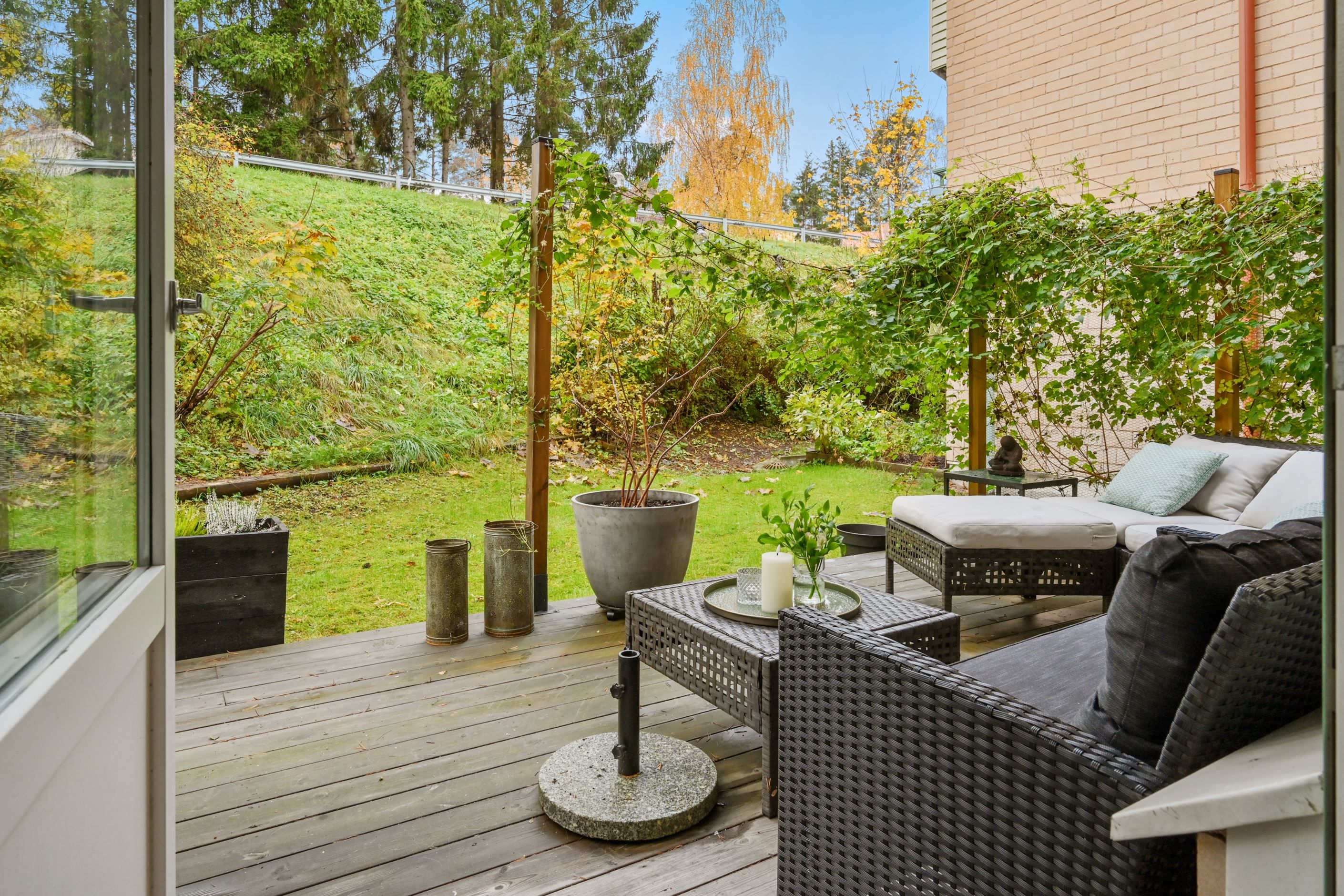 Vardagsrummet är rymligt och tack vare gavelläget flödar ljuset in från två väderstreck. Härifrån når du den mysiga uteplatsen helt insynsskyddad och privat, delvis under tak och med gräsmatta intill. En härlig plats för lugna kaffestunder, grillmiddagar eller lata sommardagar.