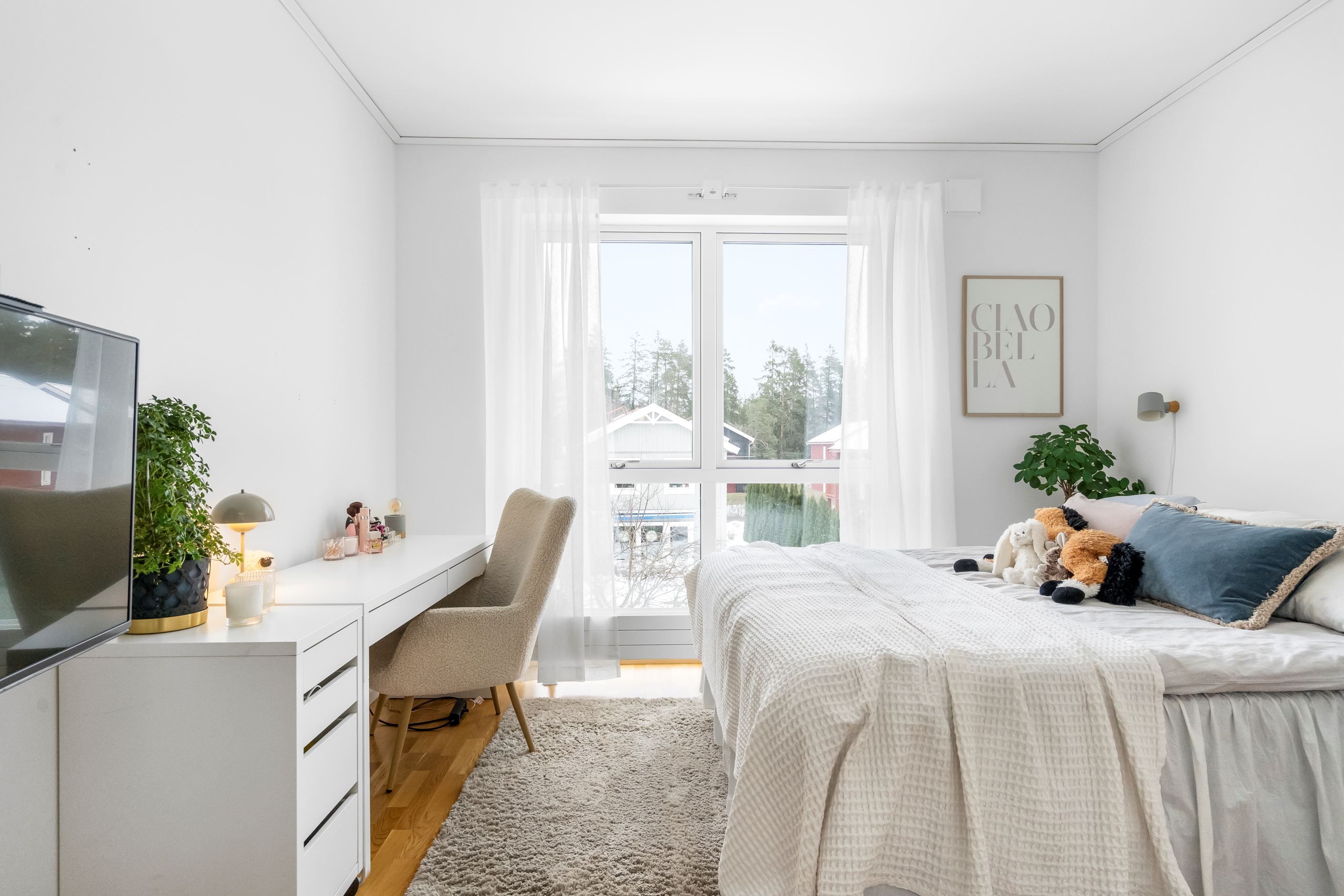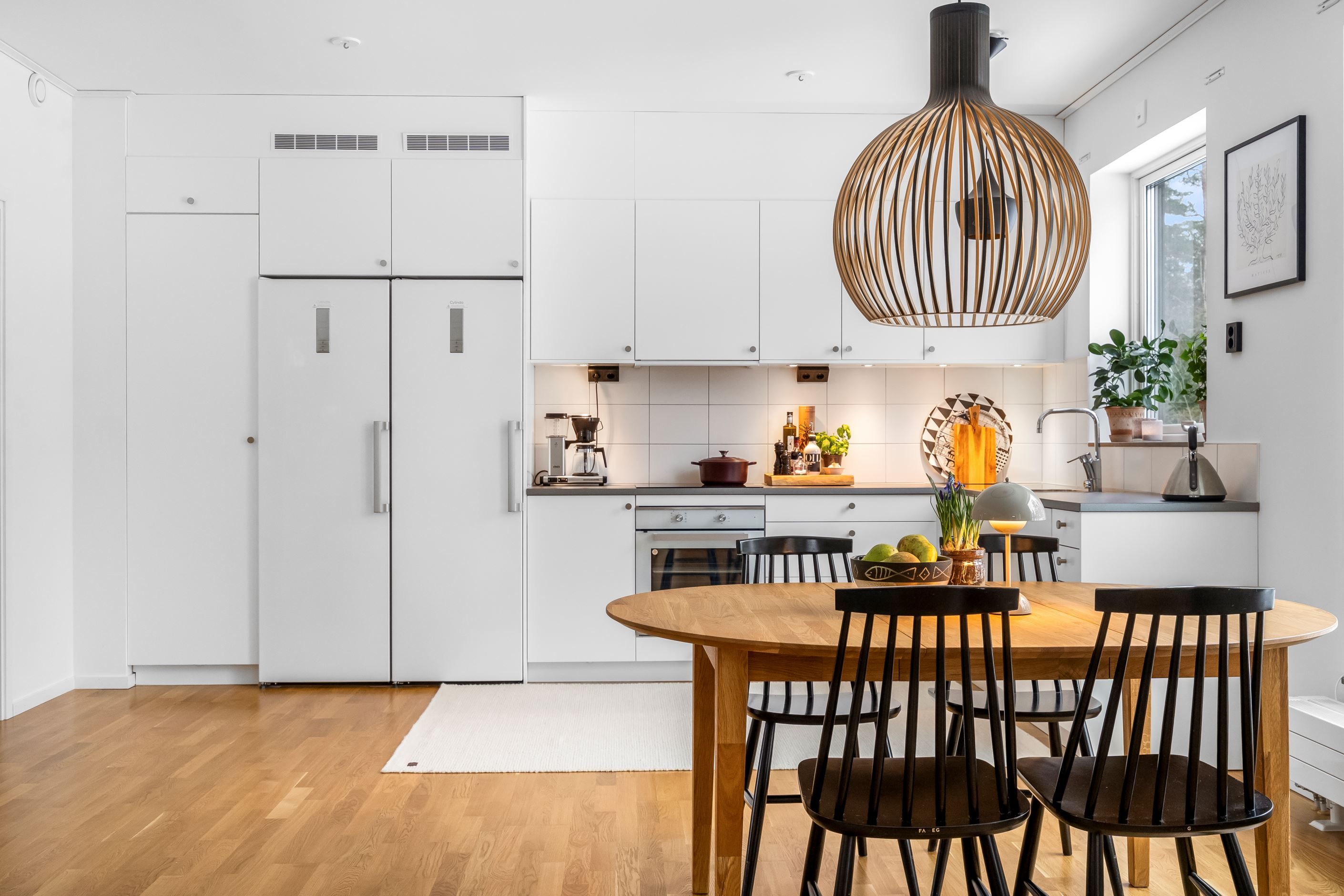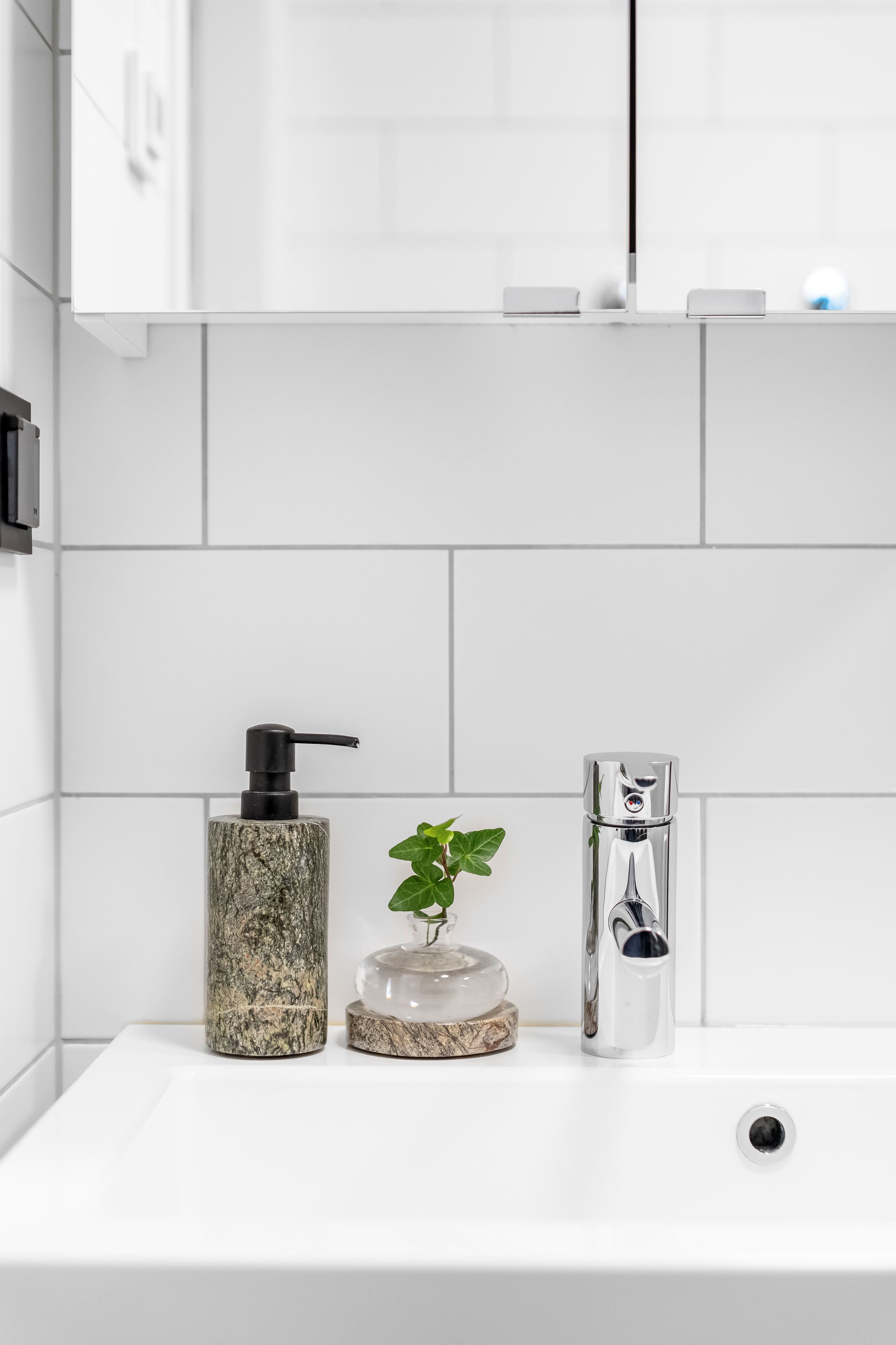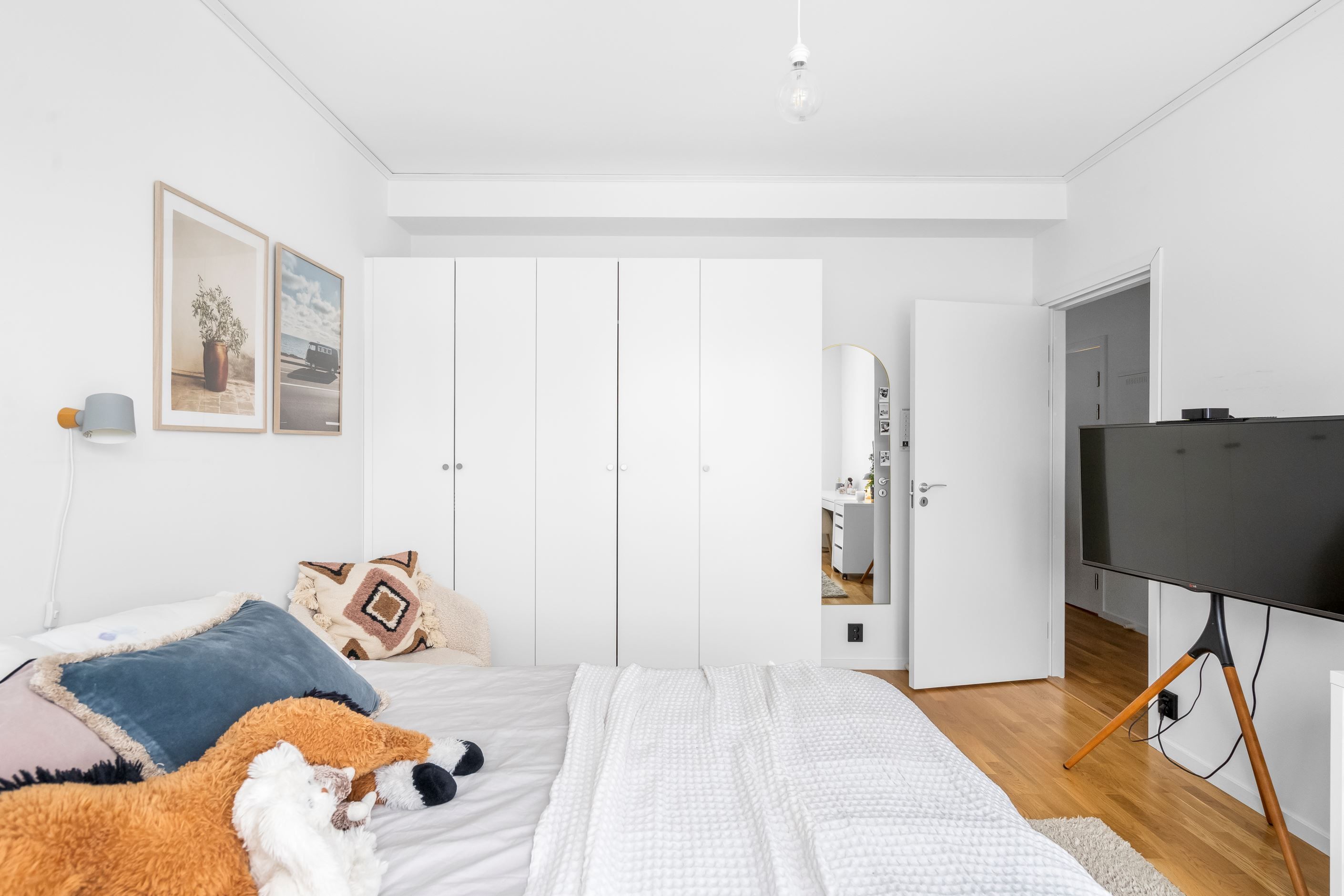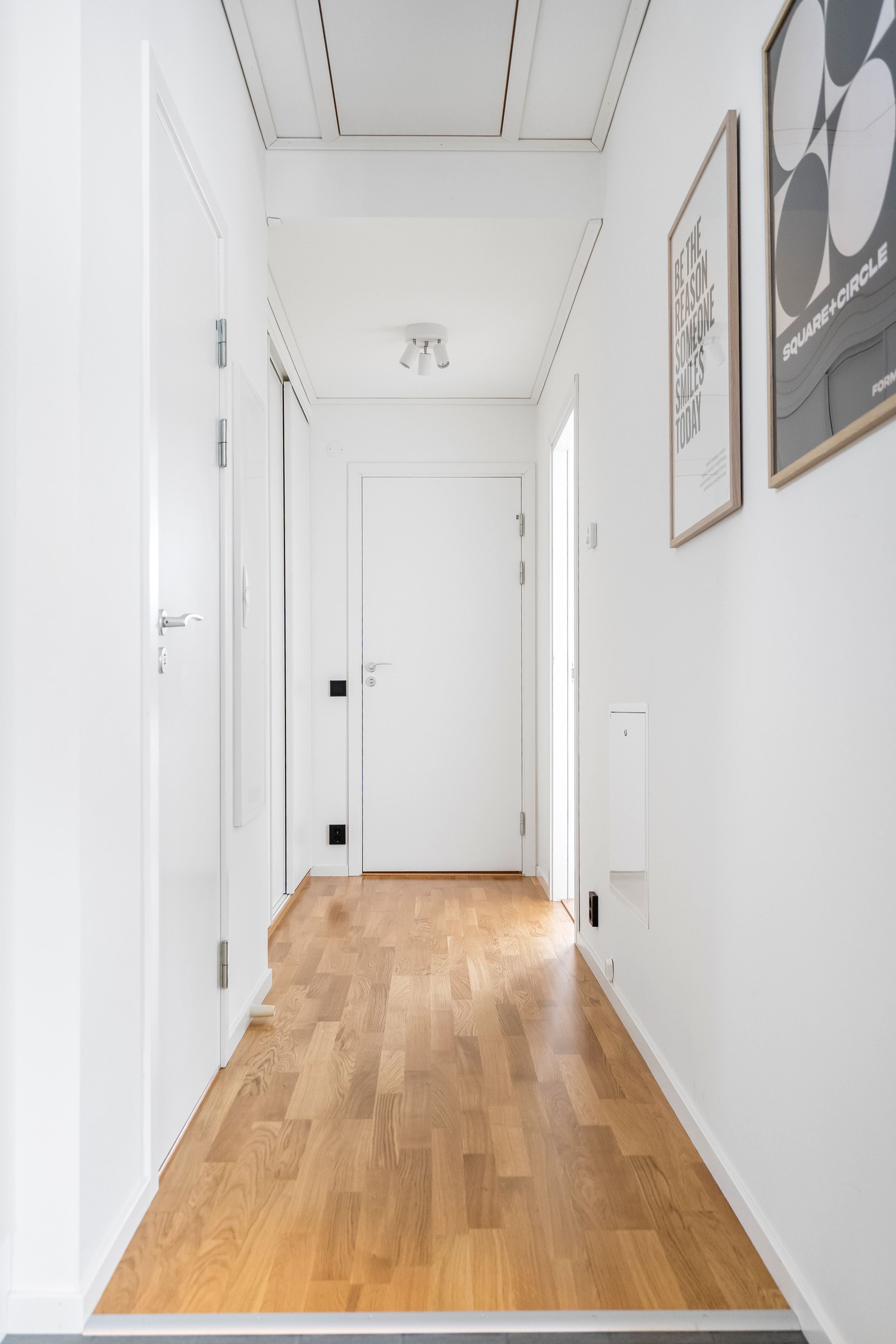 Väl innanför ytterdörren välkomnas man av hall med plats för avhängning. Direkt till vänster om hallen finns gäst-wc samt tvättrum. Här finns tvättmaskin och torktumlare. Dörr från tvättrum leder in till bostaden helkaklade badrum. Badrummet är utrustat med wc, golvvärme, duschvägg, handdukstork, handfat med kommod samt spegelskåp med belysning. Bostaden har tre stycken sovrum varav Master Bedroom är om 15,5 kvm och de andra två sovrummen om 9,5 kvm. Vardagsrum och kök har en generös öppen planlösning om ca 37 kvm med gott om plats för såväl stor soffgrupp som matbord. Stora fönsterpartier och helglasad balkongdörr ger rummet bra ljusinsläpp. Köket är utrustat med induktionshäll, fläkt, inbyggnadsugn, kyl & frys samt integrerad diskmaskin.