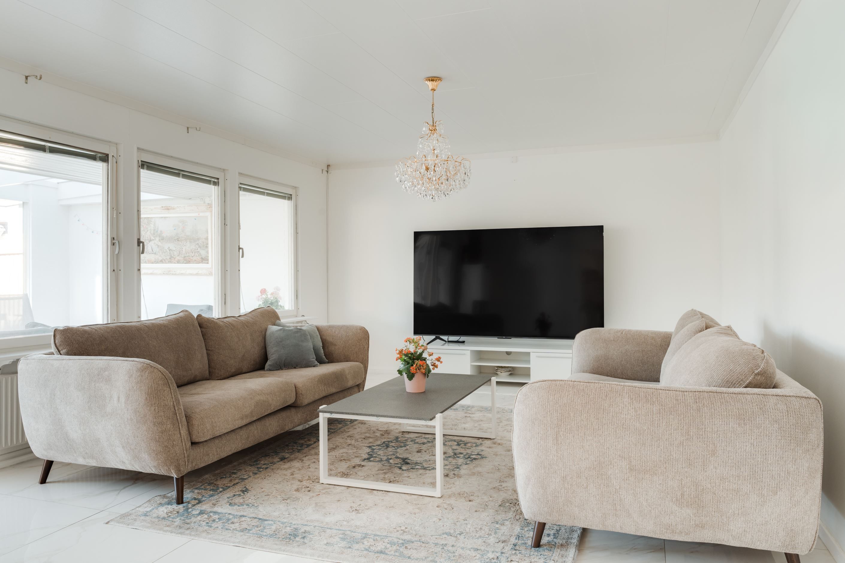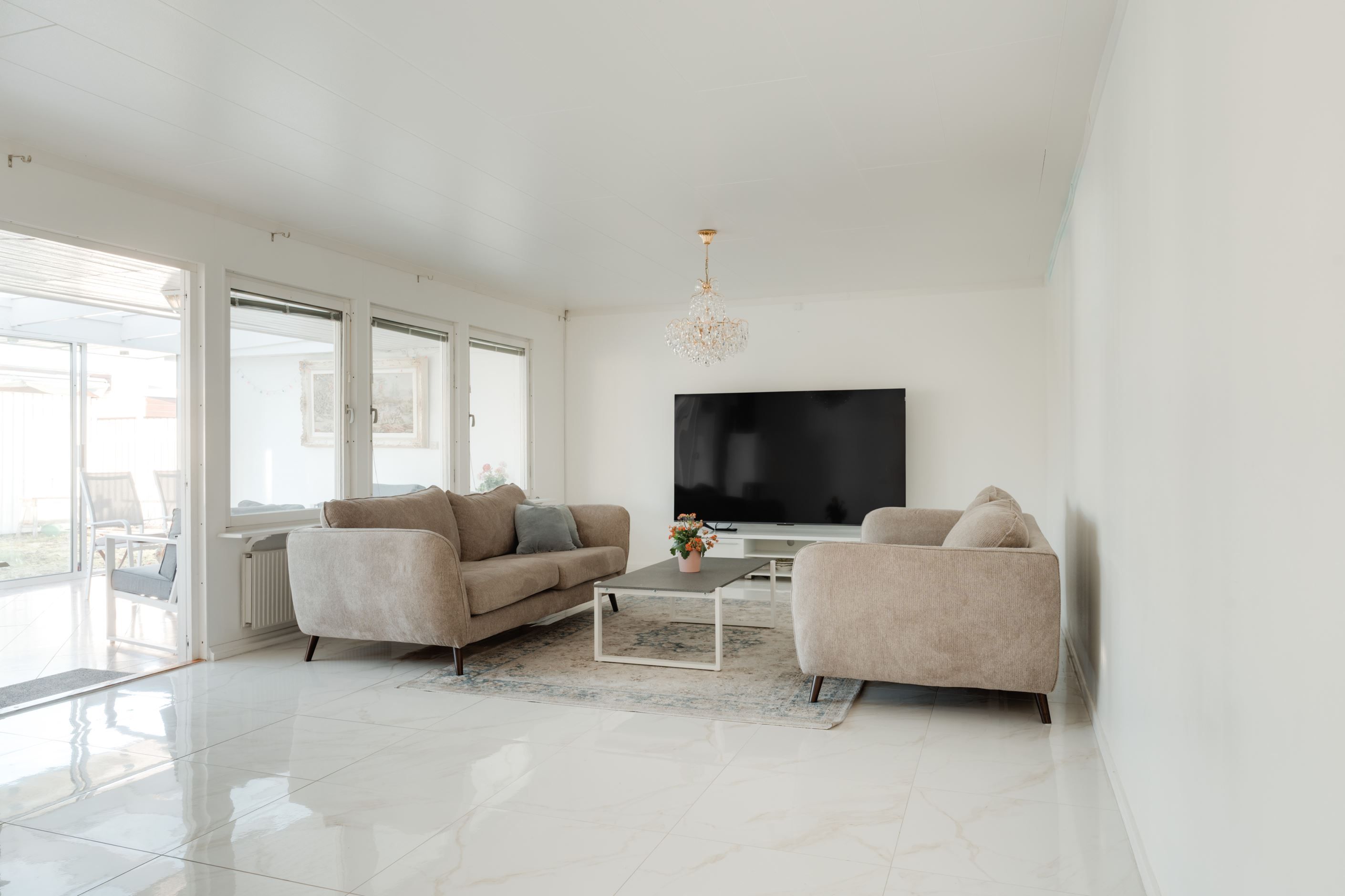 Bostaden är smakfullt renoverad med ljusa, moderna materialval och genomtänkta detaljer. Här finns gott om utrymme för hela familjen, en praktisk planlösning och en härlig inglasad uteplats som förlänger sommarkvällarna och bjuder in till både avkoppling och umgänge.