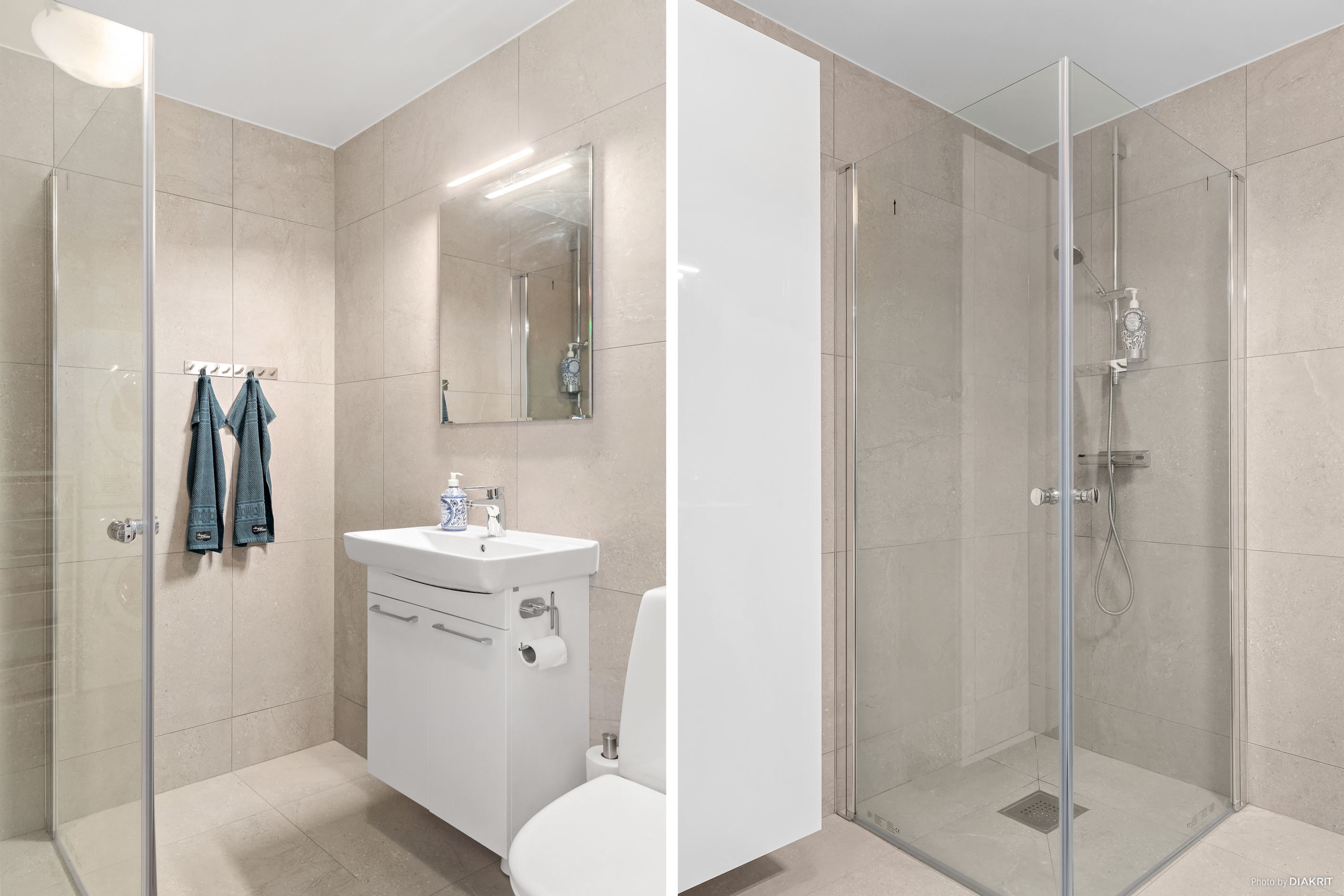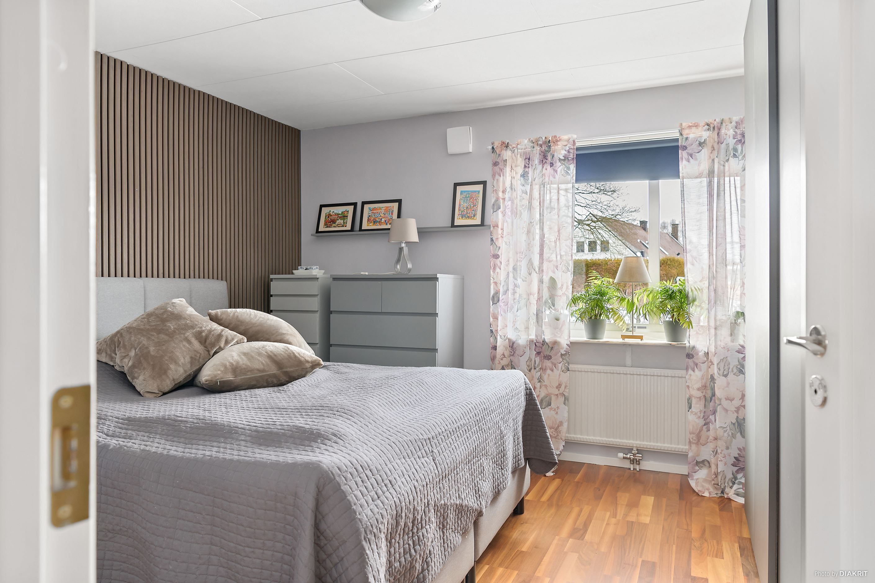 Det helkaklade badrummet är även det renoverat 2025 och går i ljusa, moderna grå toner. Här finns fönster som ger ett fint dagsljus samt en praktisk tvättavdelning som förenklar vardagen. Sovrummet är väl tilltaget och erbjuder generös förvaring i garderober, och i hallen finns dessutom en praktisk klädkammare som hjälper till att hålla ordning och reda.